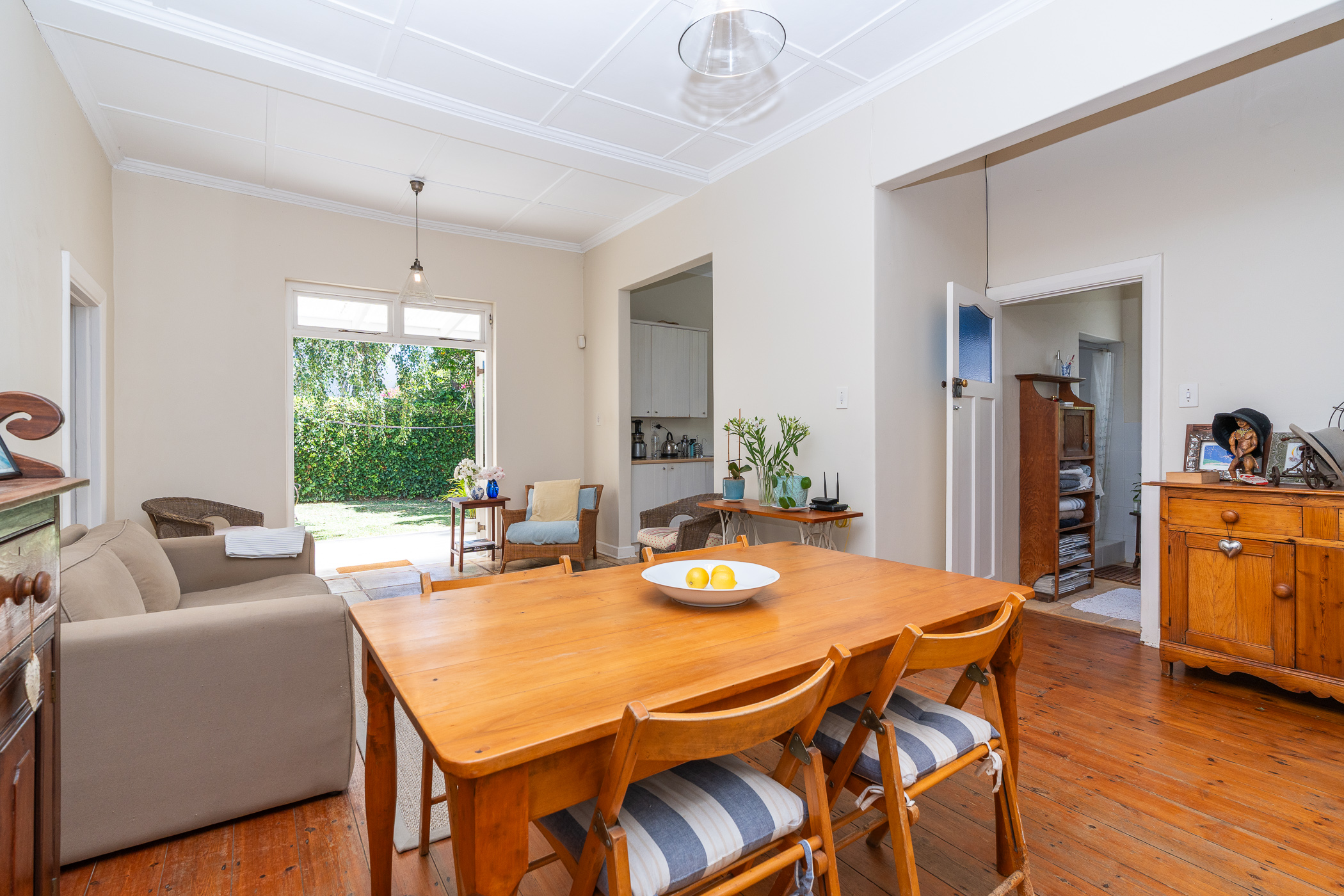 The formal entrance welcomes guests to the generously proportioned living area with high ceilings and warm Oregon strip floors and natural light streaming through the original sash windows, illuminating the spacious living area. Double French doors lead through to the open plan dining and family room with a charming focal fireplace, promising cozy evenings. Double French doors lead out to a paved, undercover patio, overlooking the private garden.