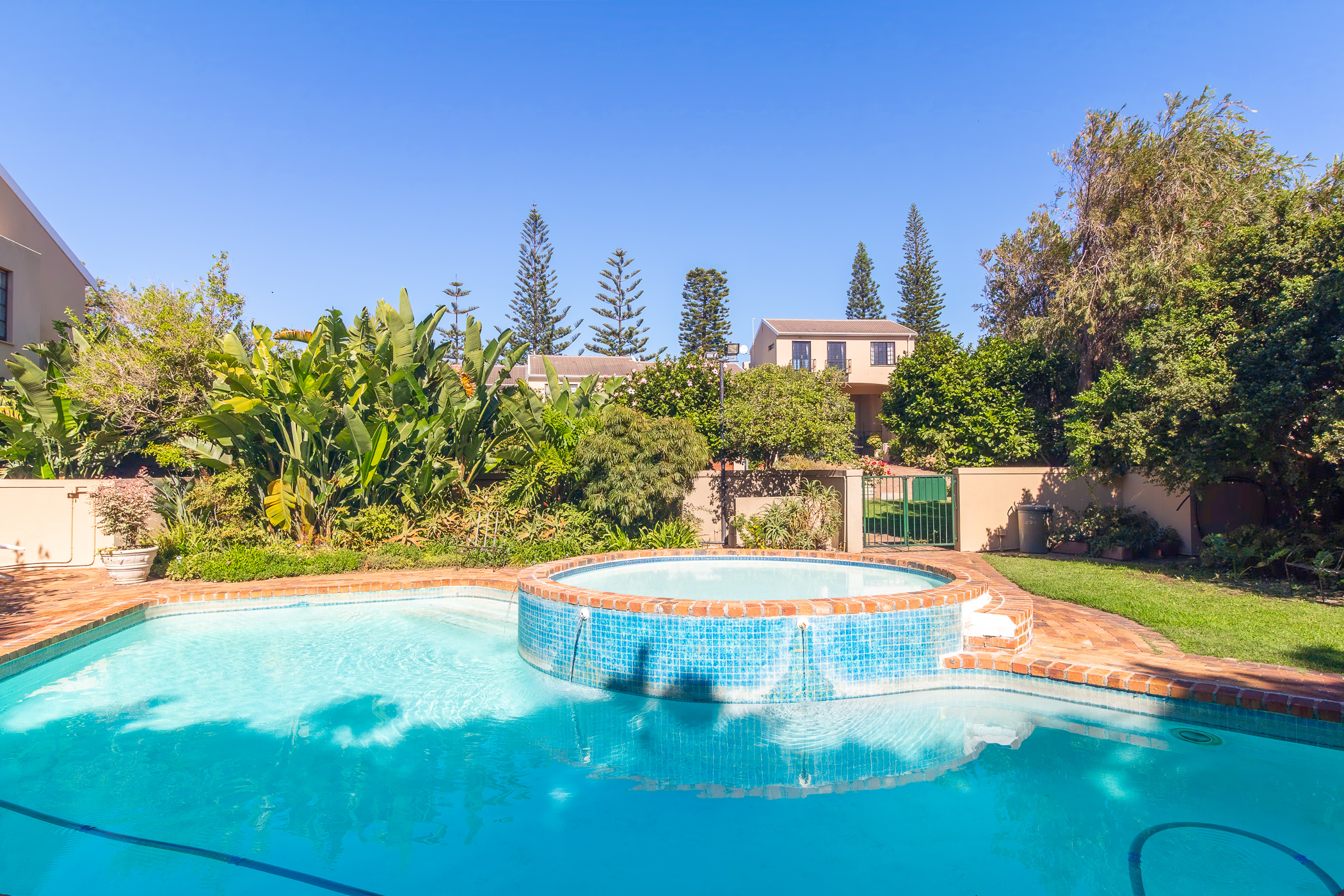 The entire interior is light and bright and a fresh, airy feeling prevails with French doors opening up to the North and West patios from lounge, diningroom and familyroom. The pretty terraced garden with its display of colourful plants and trees is kept lush by the wellpoint.