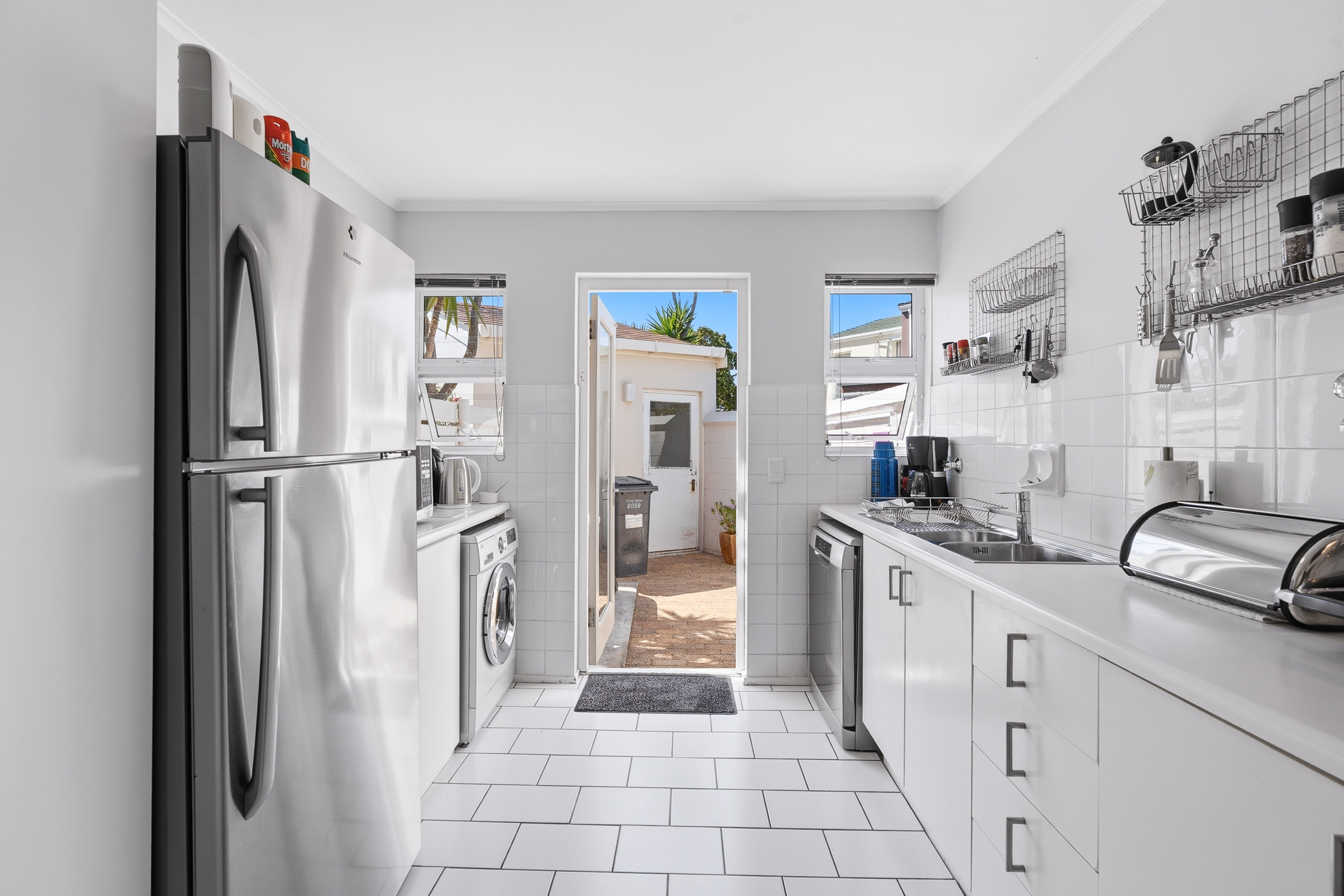 The well-appointed kitchen is designed for functionality and style, offering a convenient breakfast bar and plumbing for two appliances. A back door leads to a discreet drying yard with direct access to the garage.