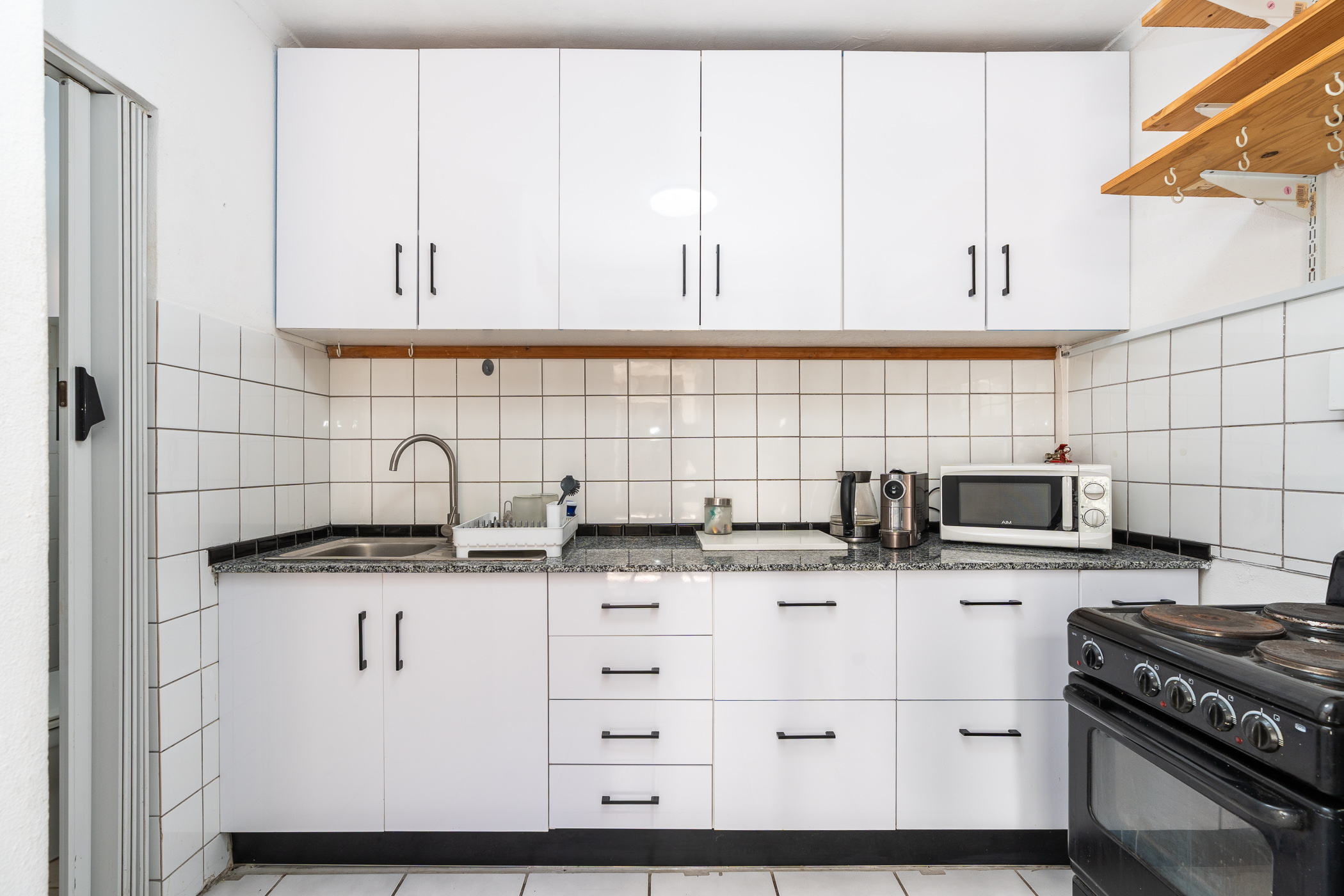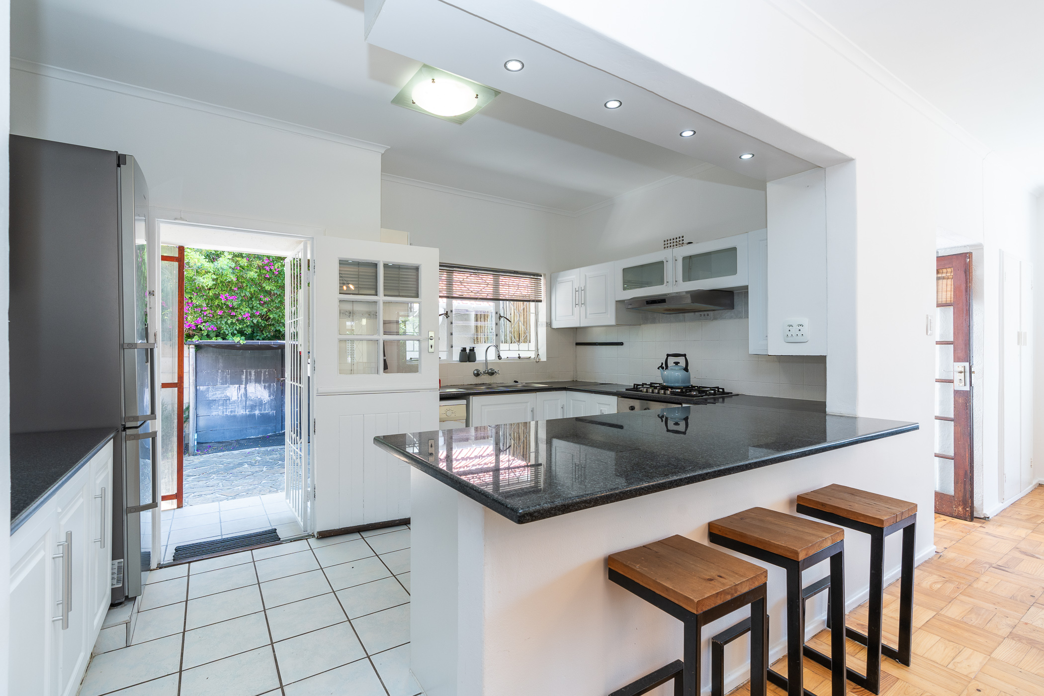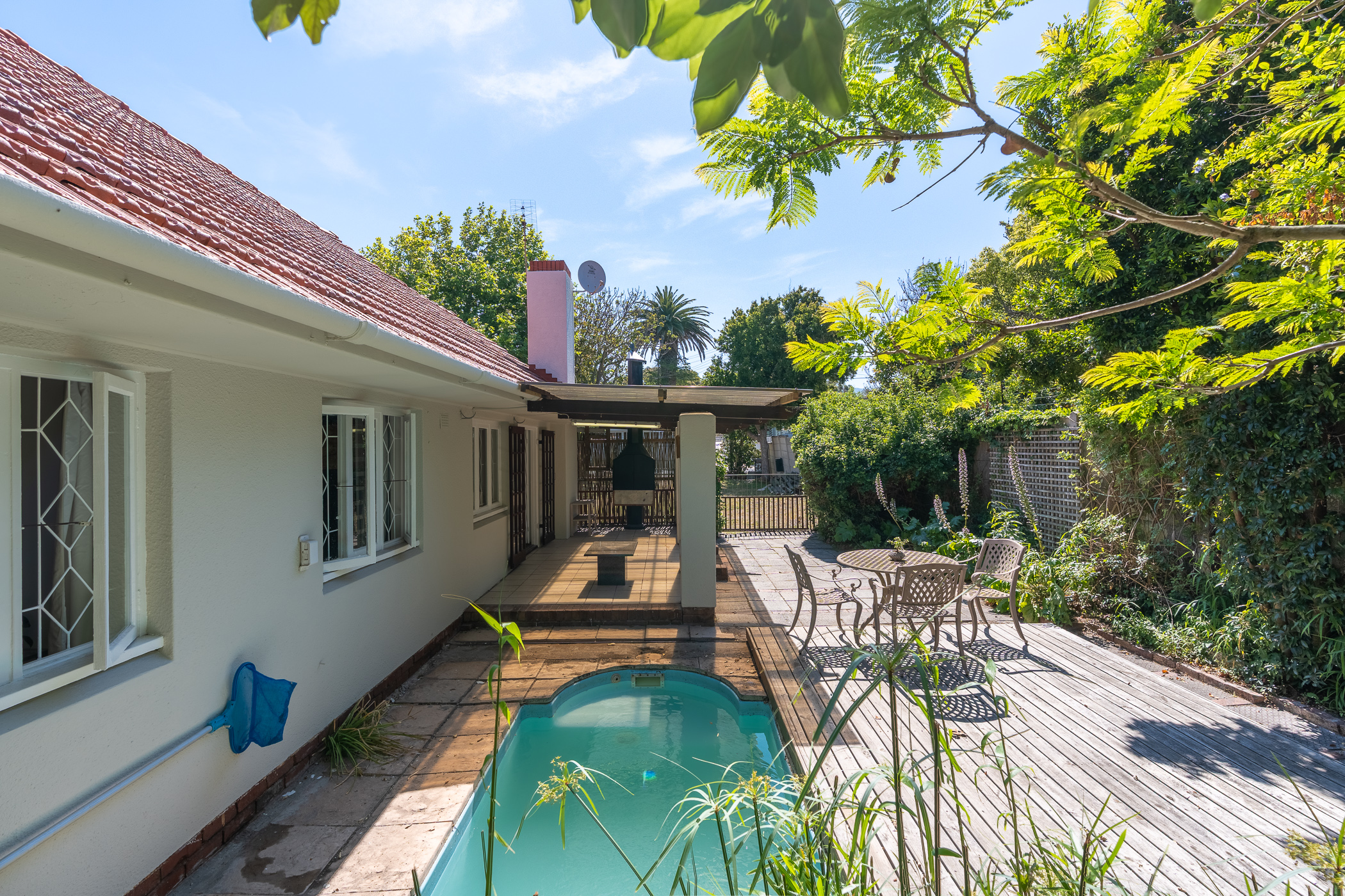 The spacious, North-facing, open plan living area consists of Lounge and Diningroom, a wood-burning fireplace and warm Parquet floors. Double French doors lead out to a tiled, roofed Patio with built-in braai, perfect for al fresco dining, overlooking an ingeniously engineer-designed automated sliding deck which can conveniently cover the fibreglass pool to protect it from wind, sun, dust, or keep it safe for little kids.
