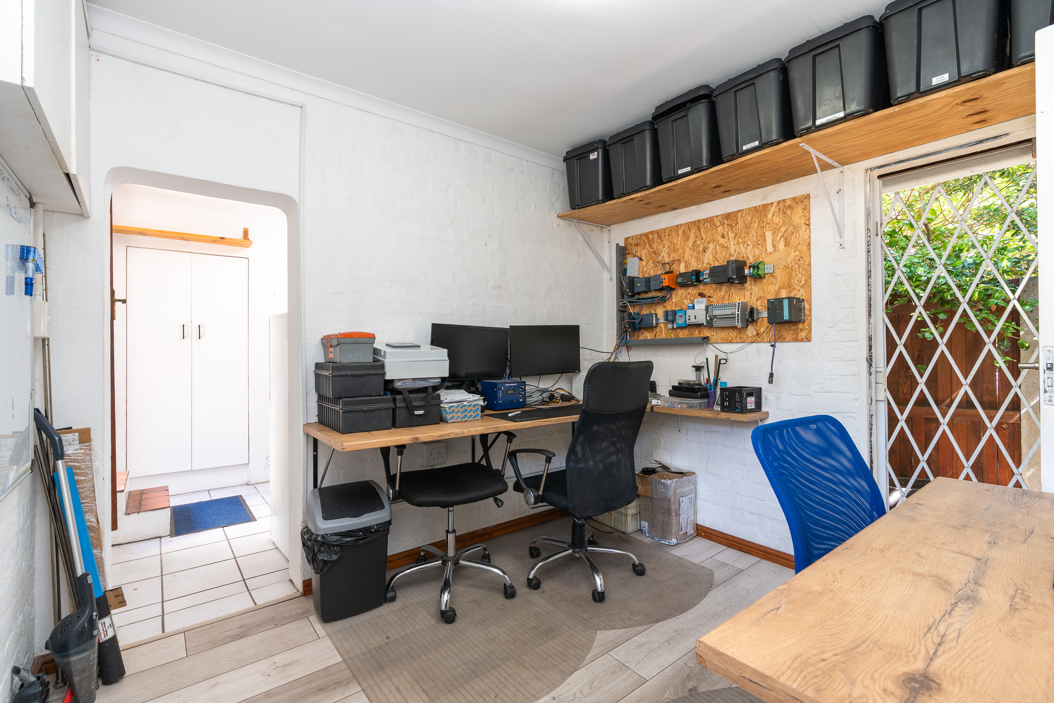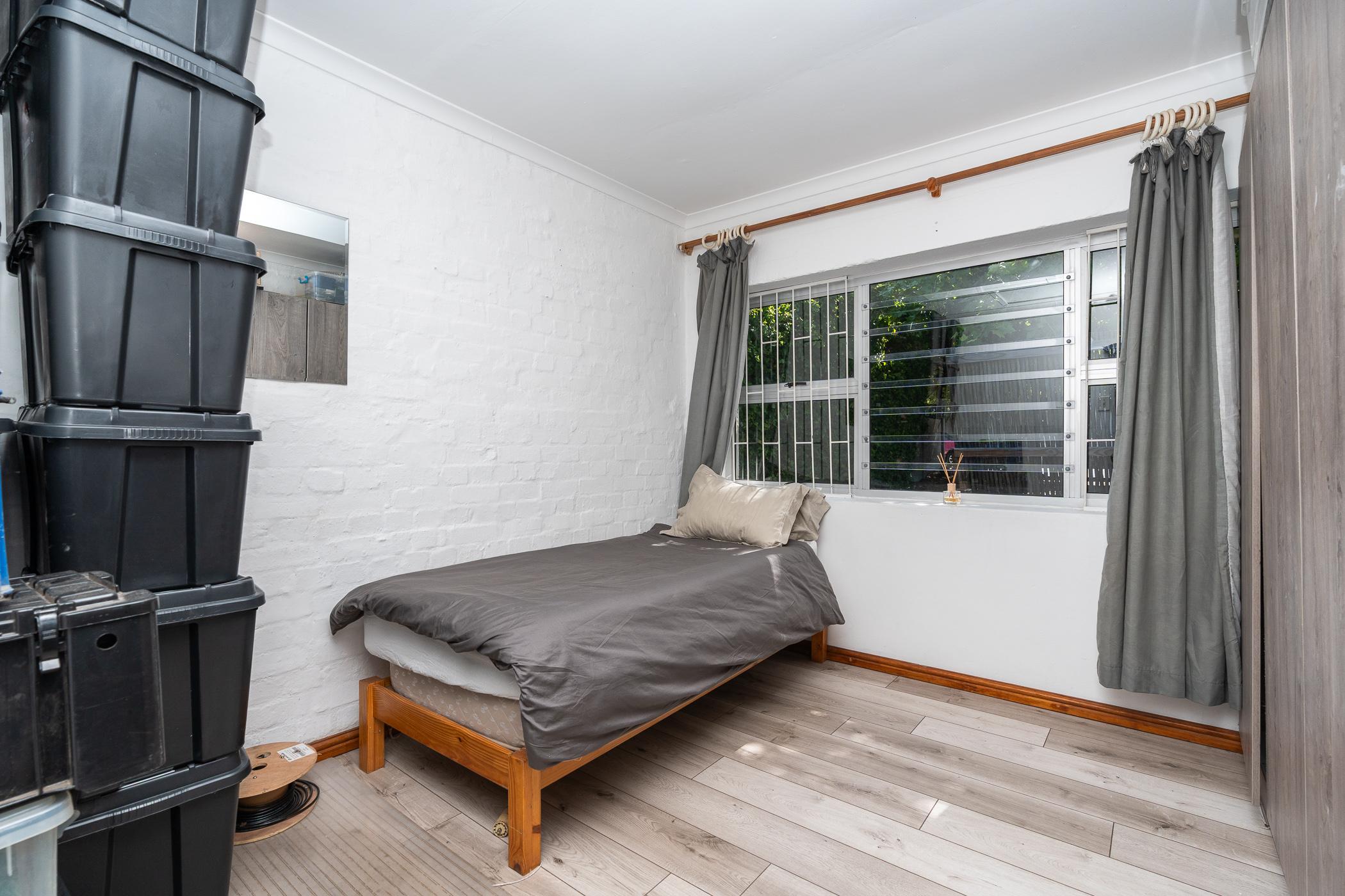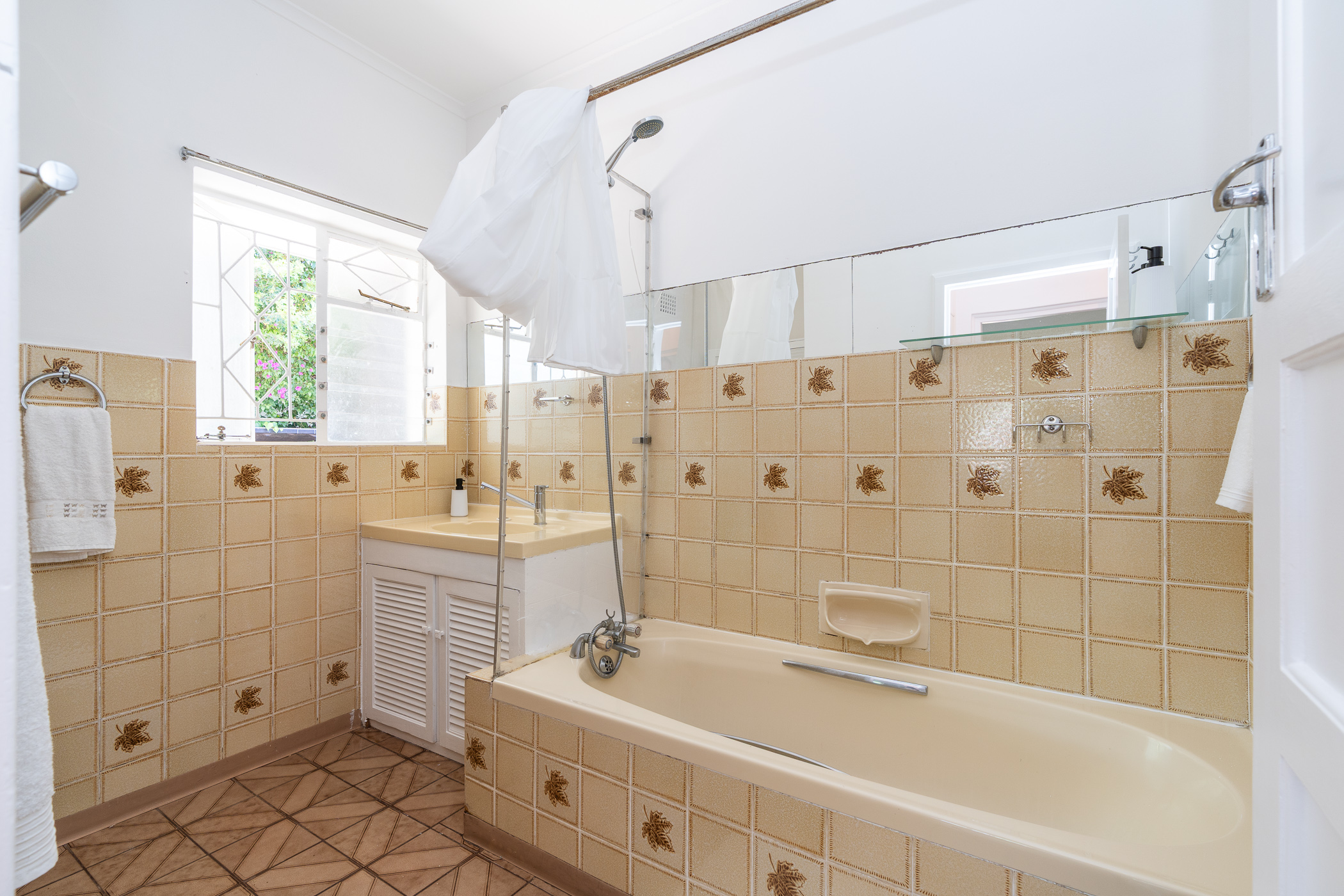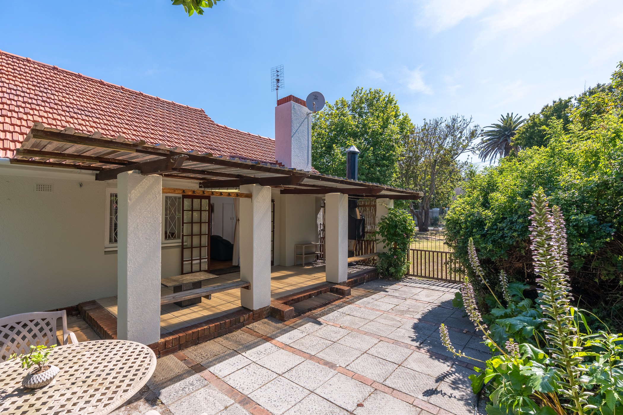 On arriving, you’ll note the attention to excellent security which includes a newly-installed “clearview” electric fence, two automated sliding gates, one for the main house and one for the cottage, CCTV cameras, beams, alarm system, security lights and ornate burglar bars.
