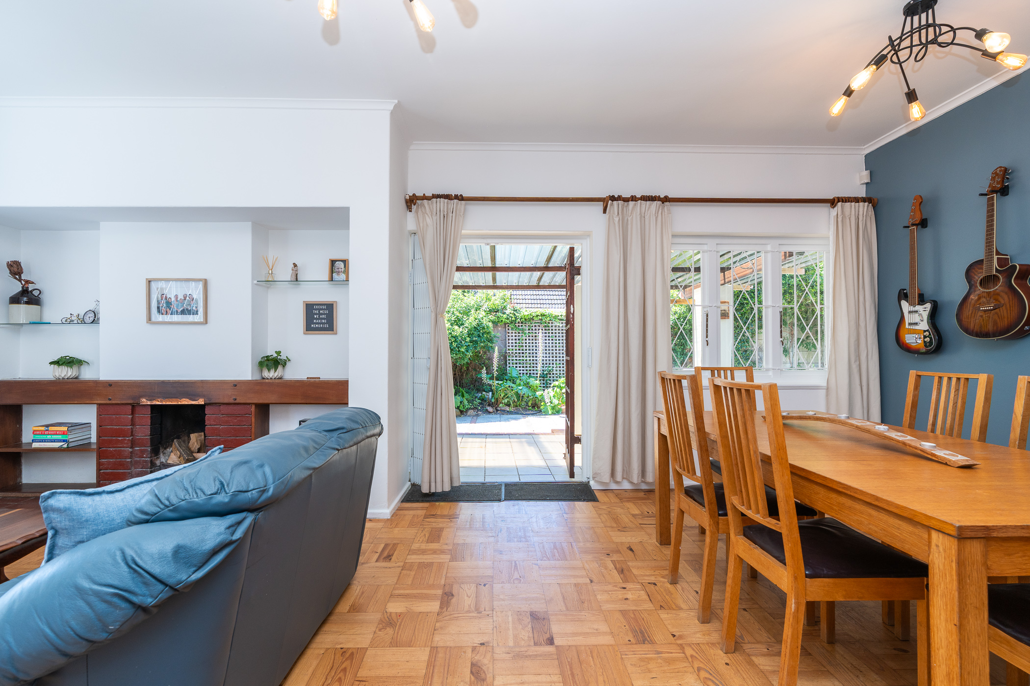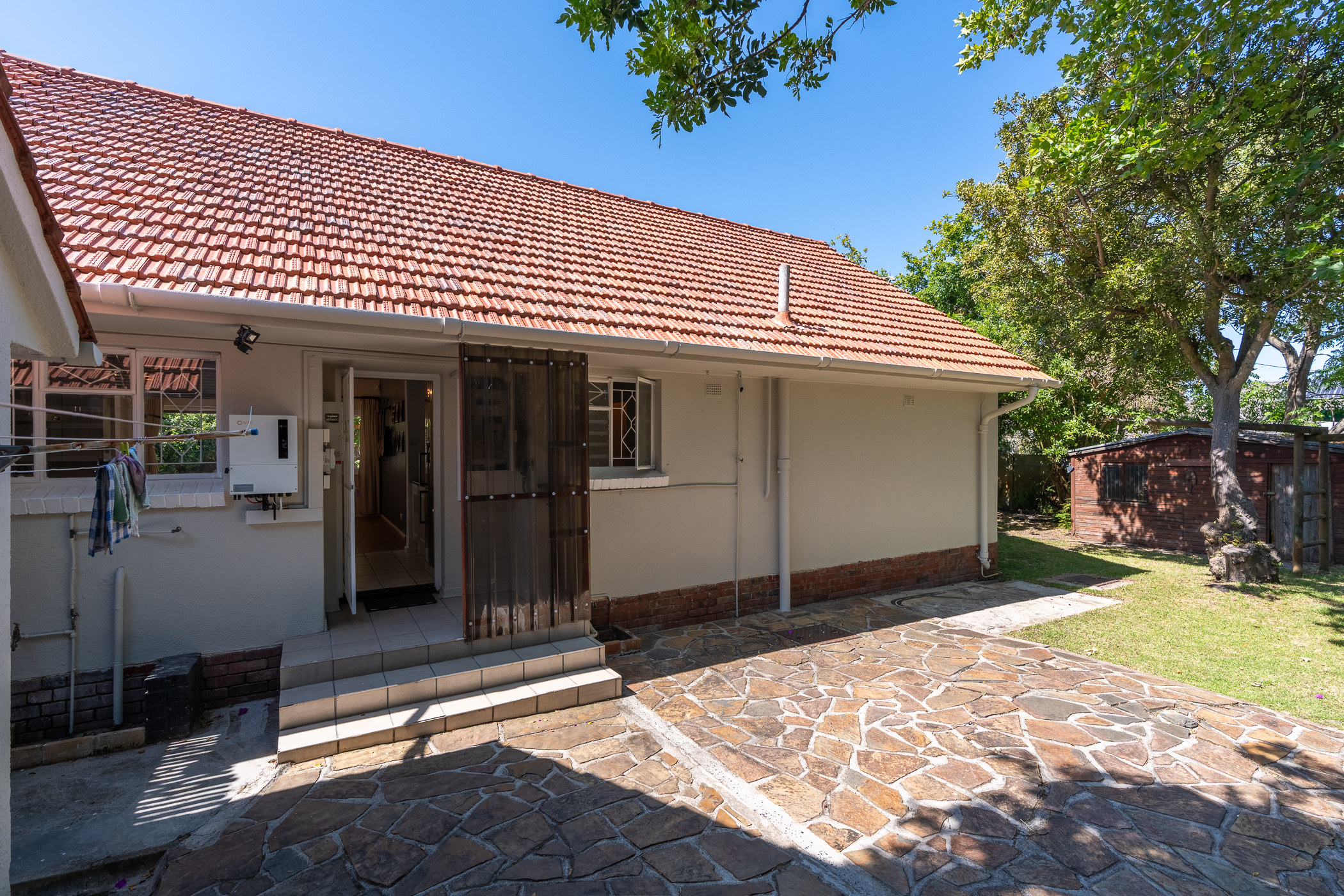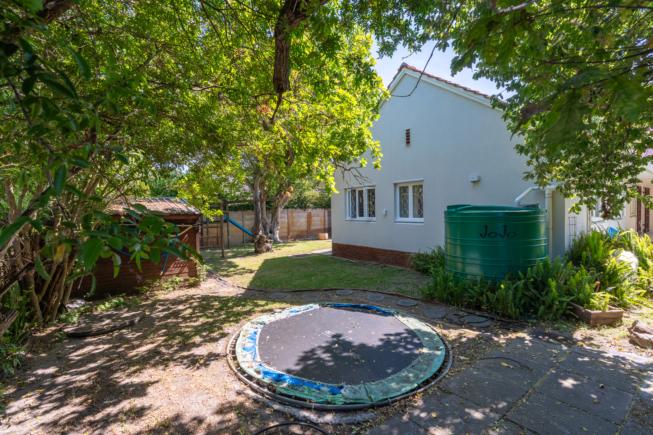 You’ll be enchanted by this home’s appeal, from the high pitch roof and cottage-pane windows to the pretty bougainvillea draping across the front entrance, to the generous stretch of garden with many tall, mature trees, Oak, Plein & Jacaranda, to mention a few. The wellpoint keeps the garden lush and a Jojo tank stores rainwater. Kids and pets will love playing in this shady garden – and there’s a jungle gym, ground-level trampoline and a slide which can be rigged to flow into the pool.