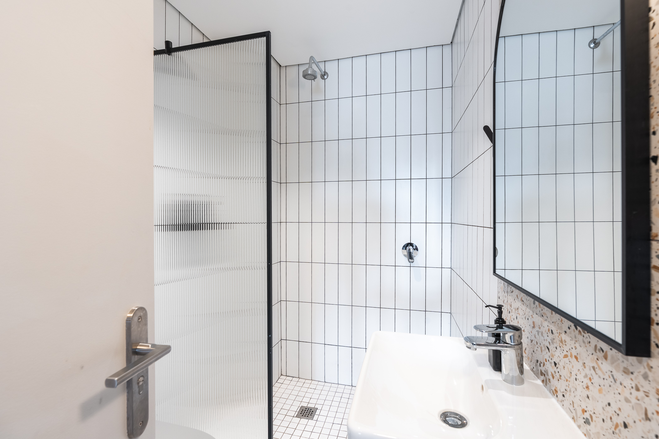 The kitchen is fully fitted and equipped with an electric oven and hob, fridge, double sink, dishwasher, and extra linen storge space with plumbing for two washing/drying appliances in the space between the bedroom and bathroom. The bathroom offers a large walk-in shower, a monochromatic palette of black and white with a splash of terrazzo feature tiles. The bedroom has two sets of built in cupboards with a lovely aspect from the bed – where you’ll be able to gaze towards the sea while sipping on a cup of coffee in the morning.