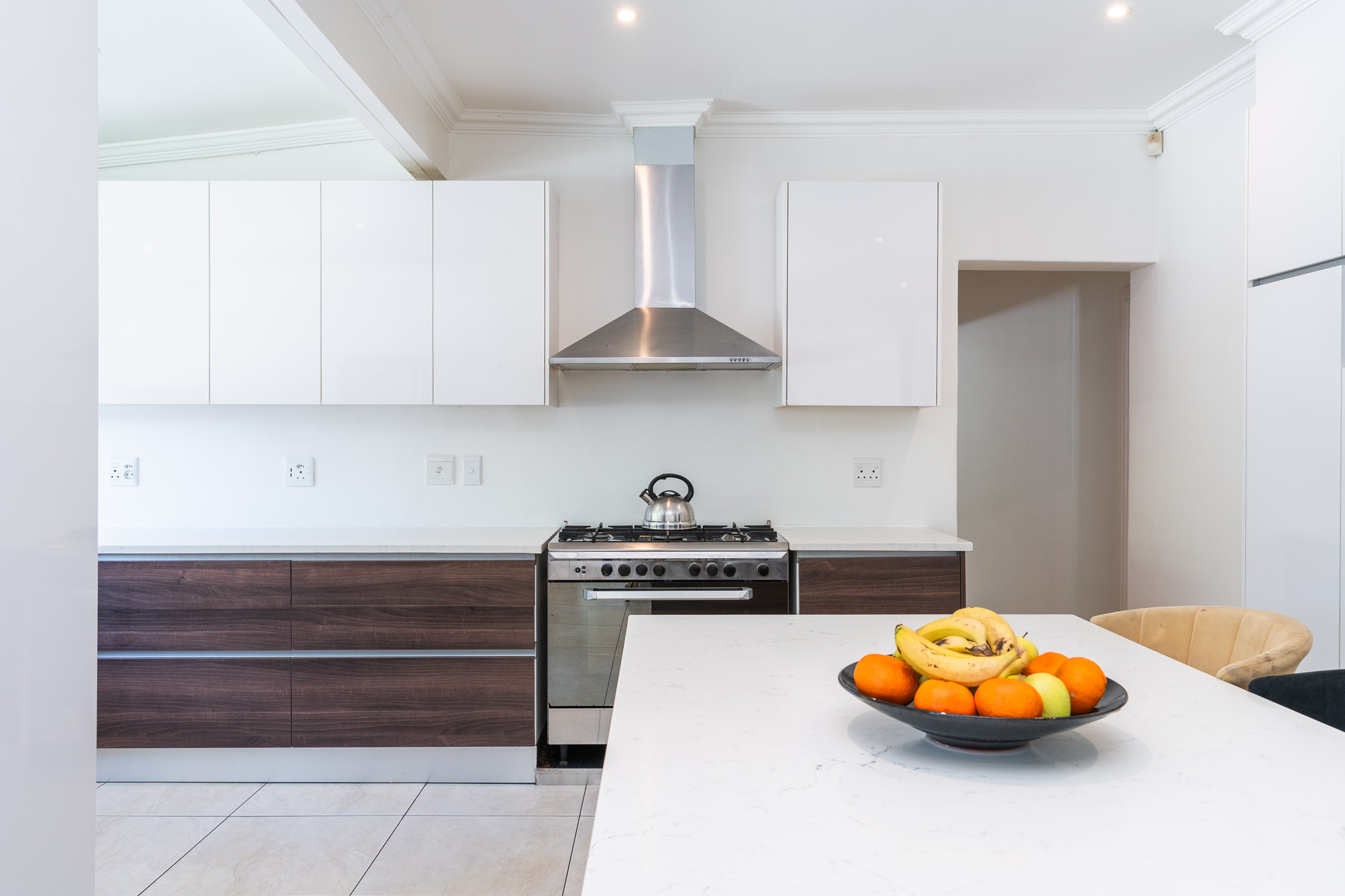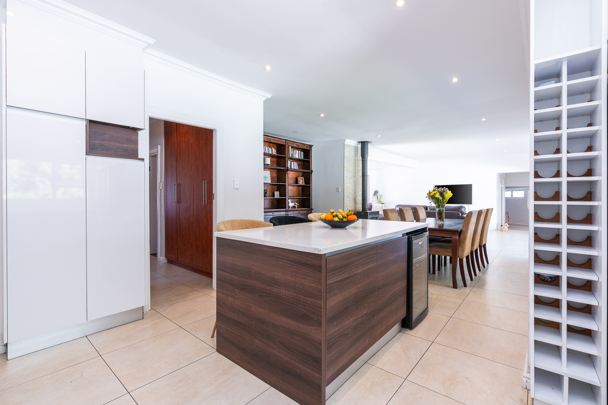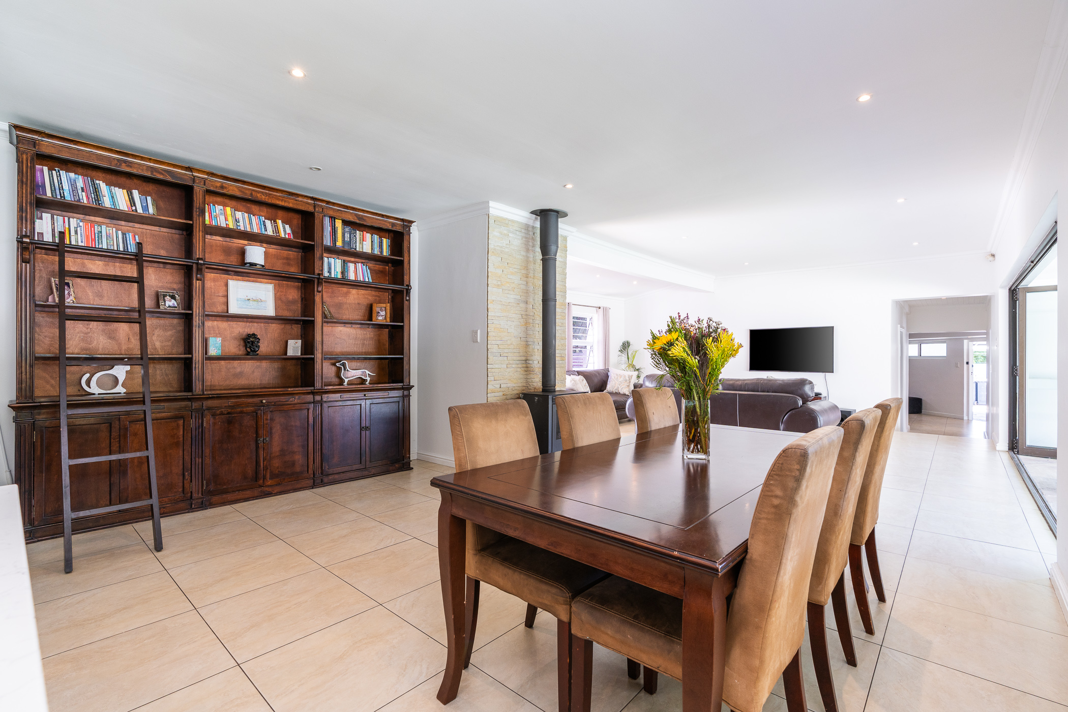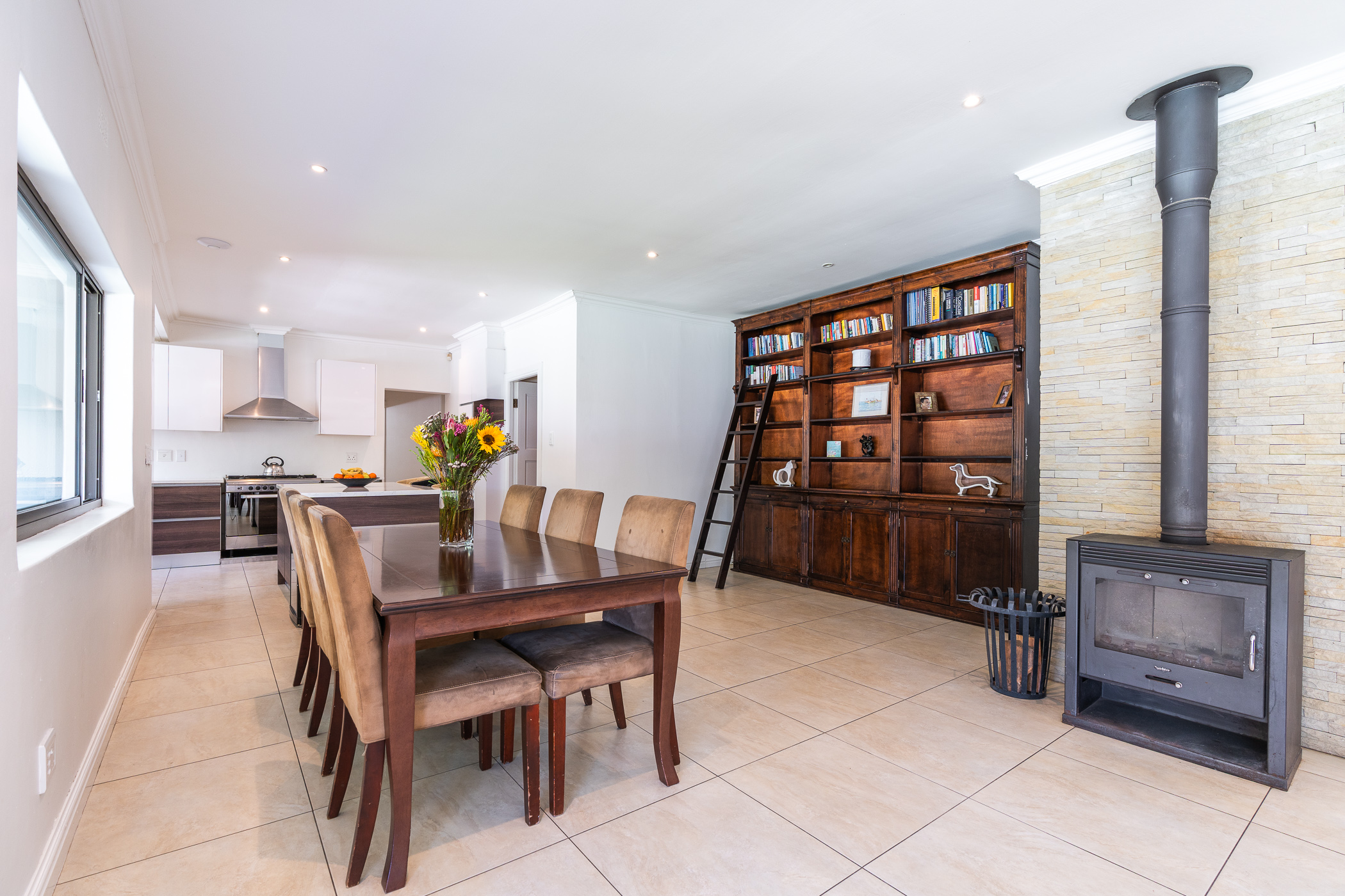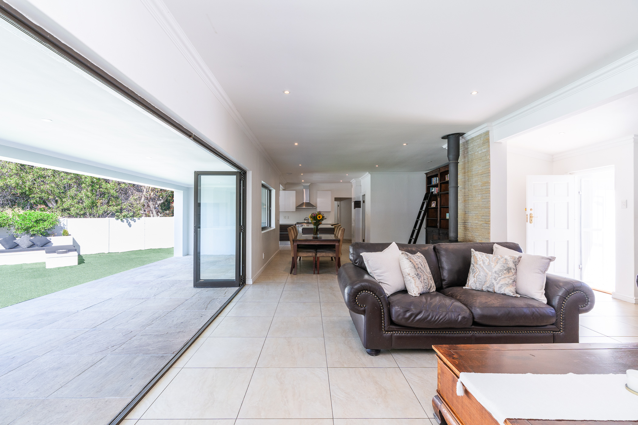 Open-plan living areas with a central combustion fireplace create a warm and inviting heart to the home. Large aluminium-framed doors open out to the entertainment patio, garden, and pool. - Stylish Modern Kitchen & Scullery