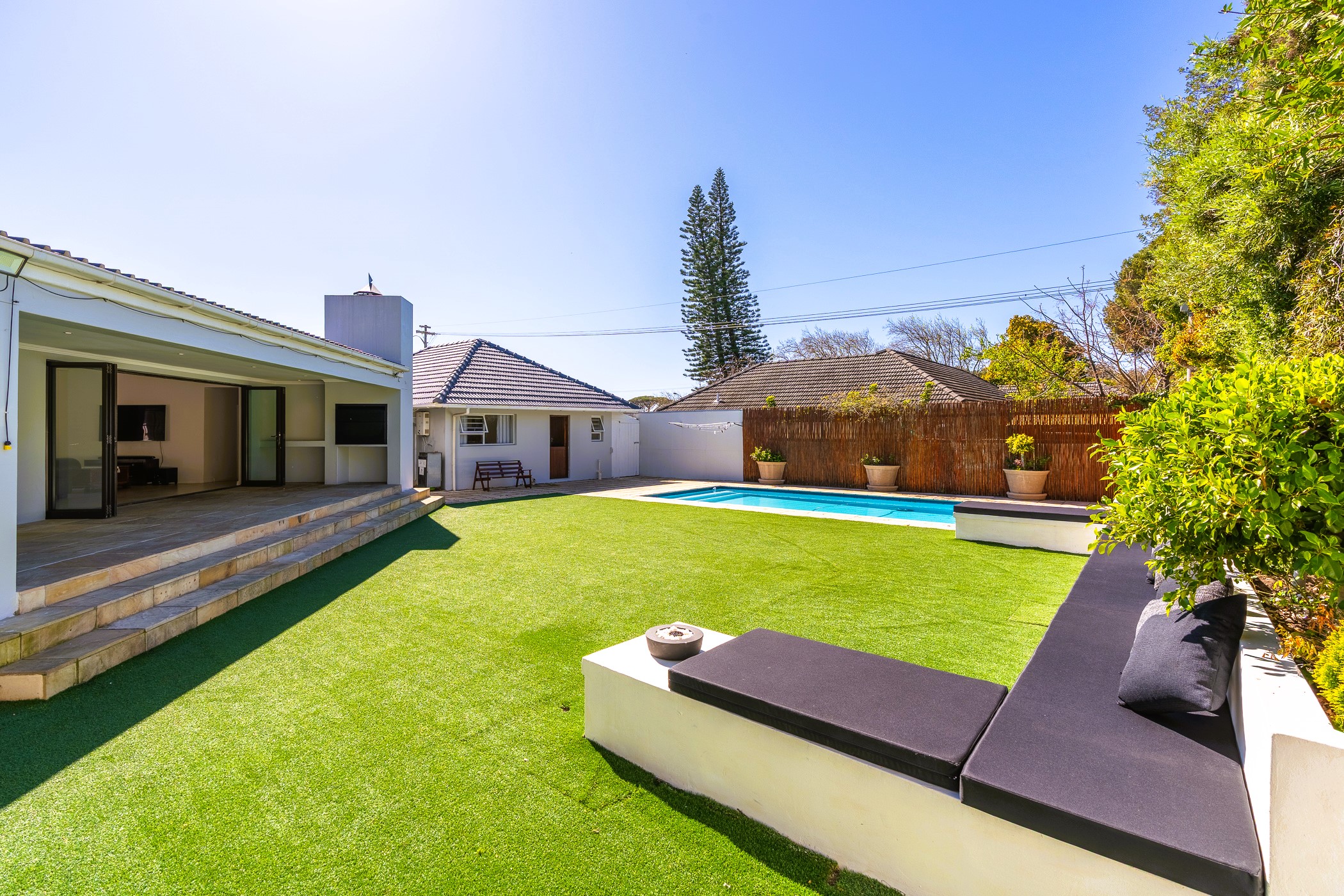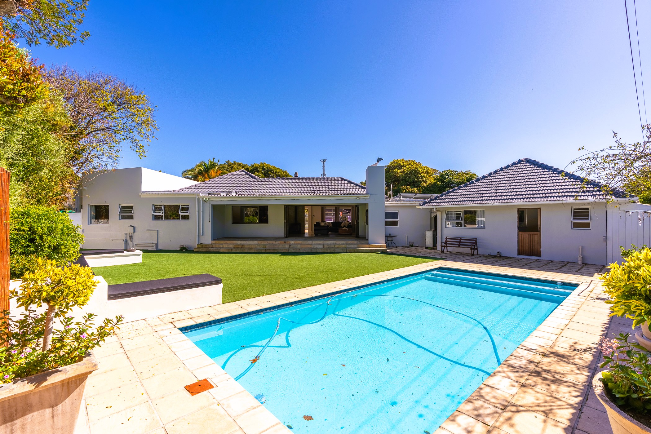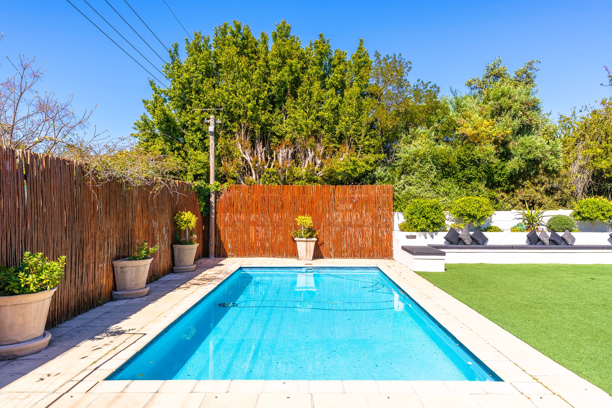 Lush, green, and low-maintenance thanks to a borehole-fed automatic irrigation system and 5,000L JoJo tank. - Pristine Swimming Pool