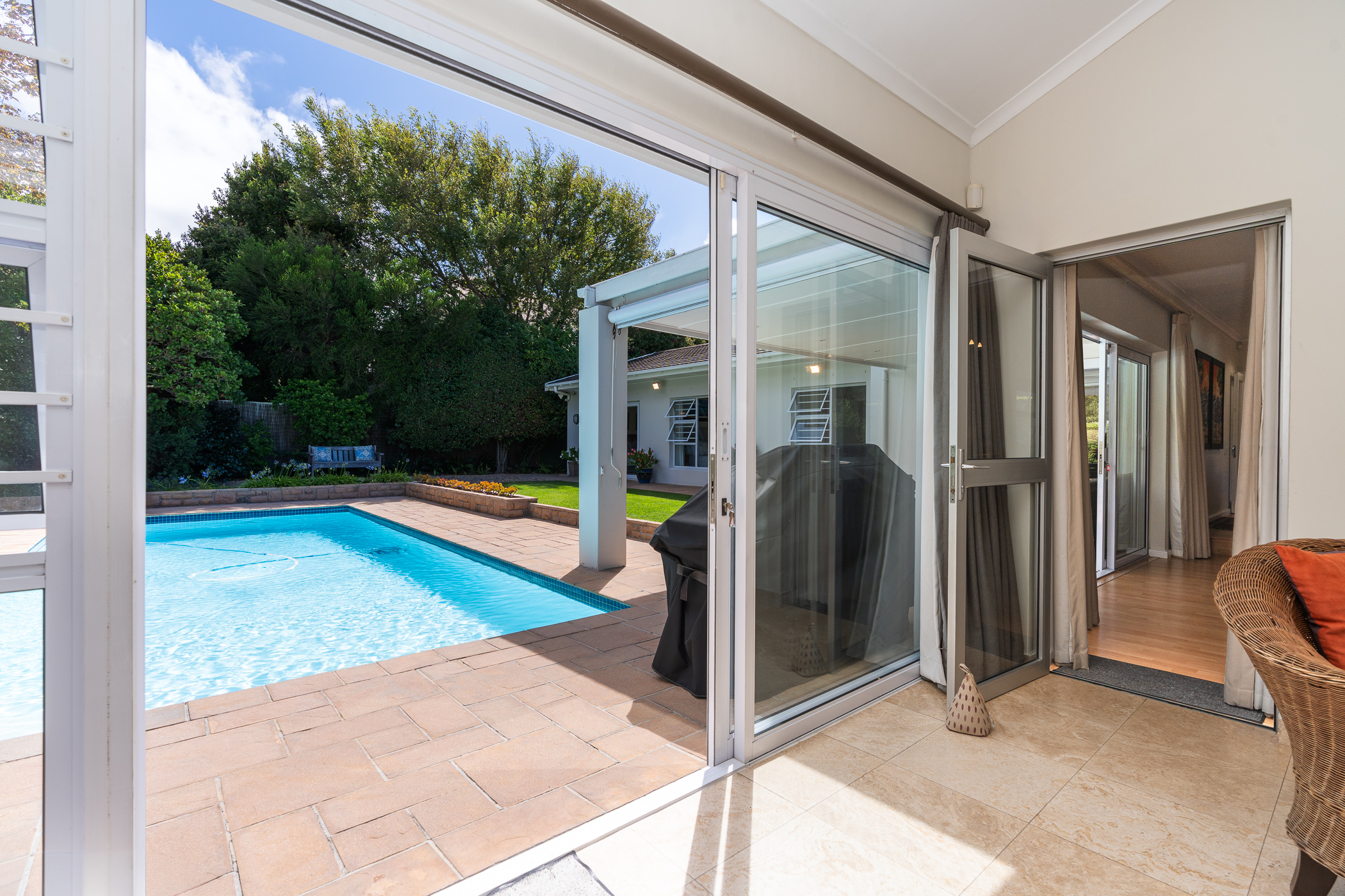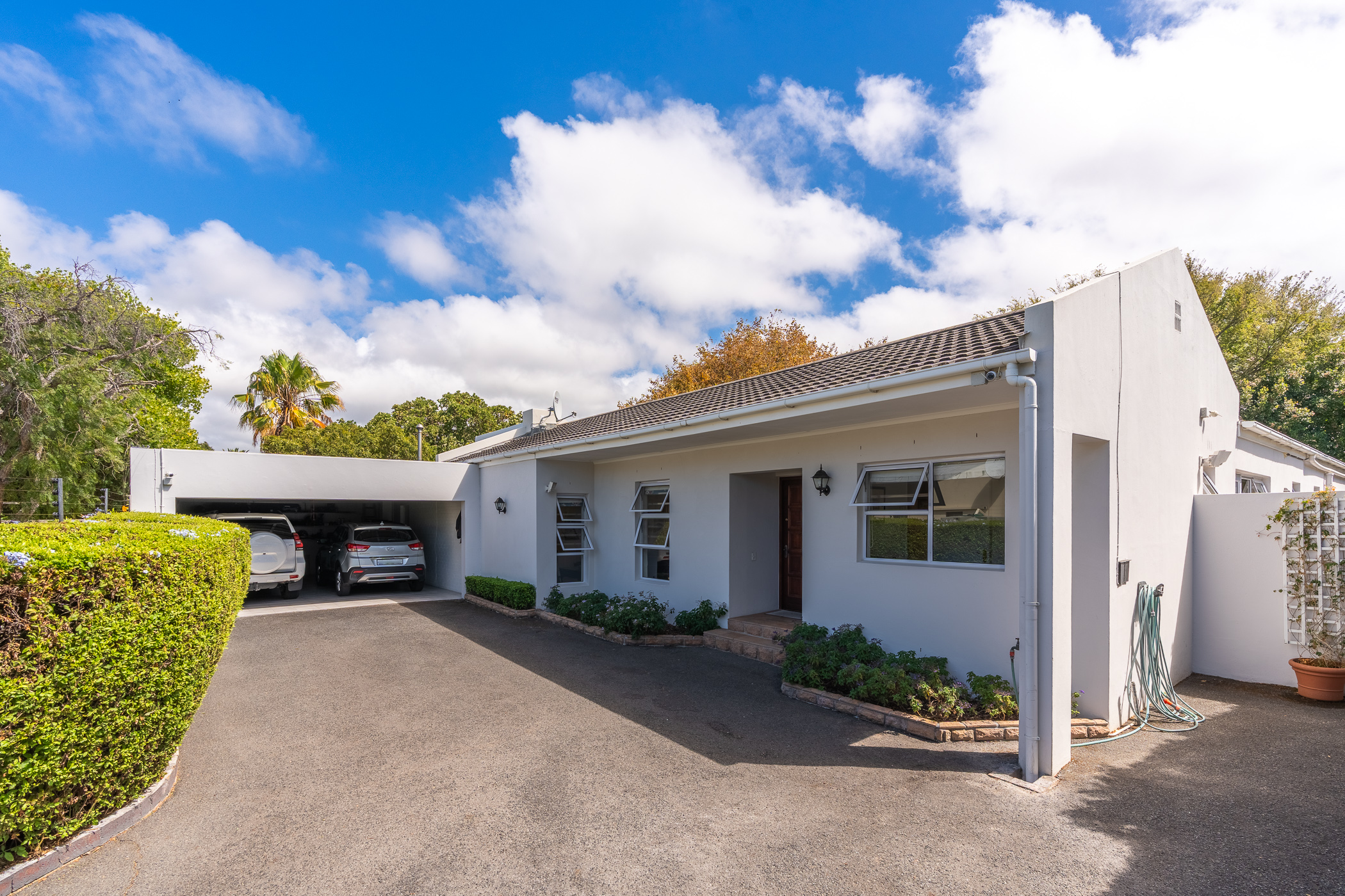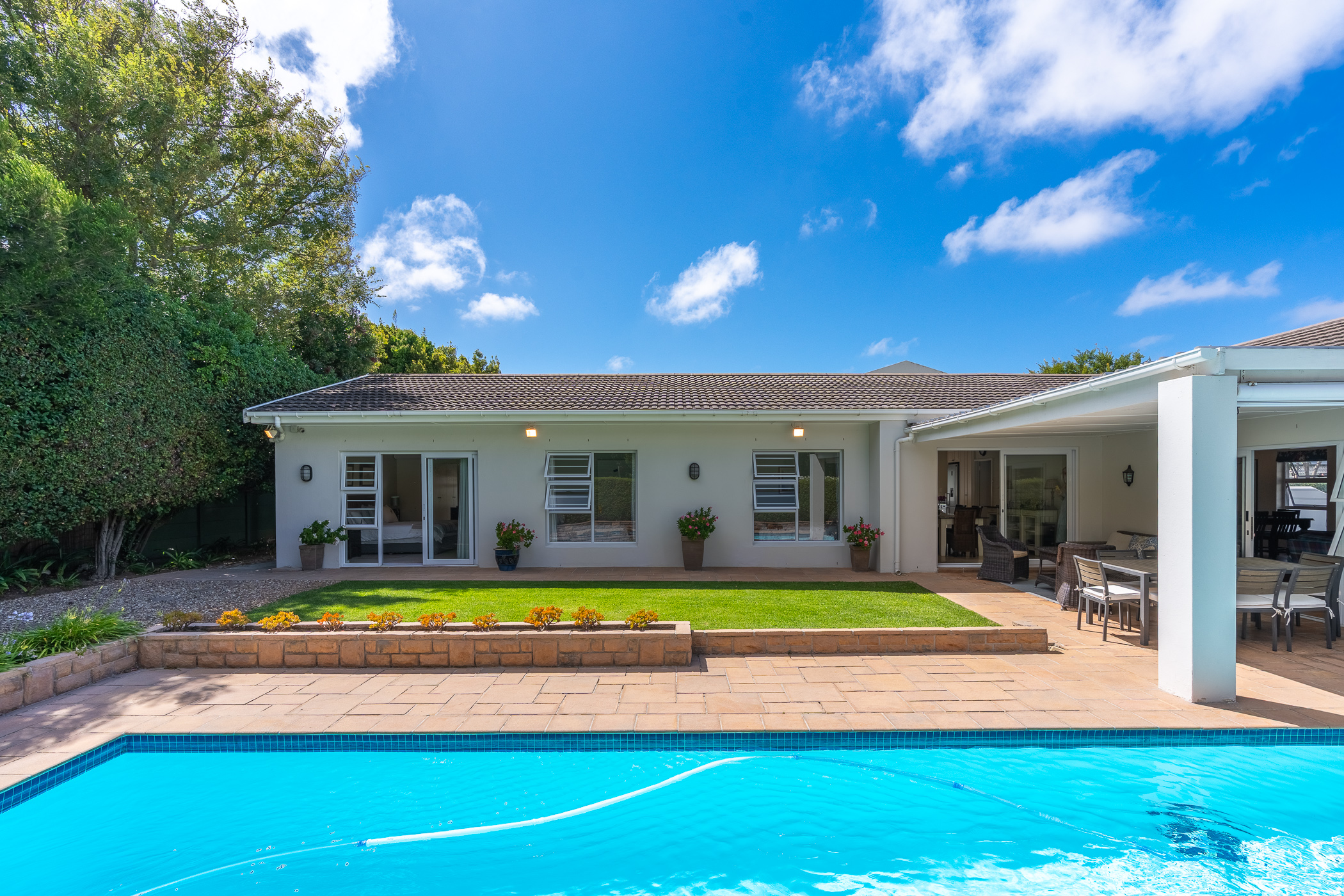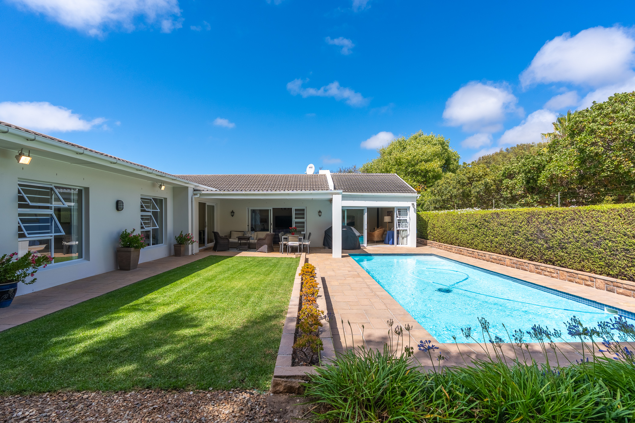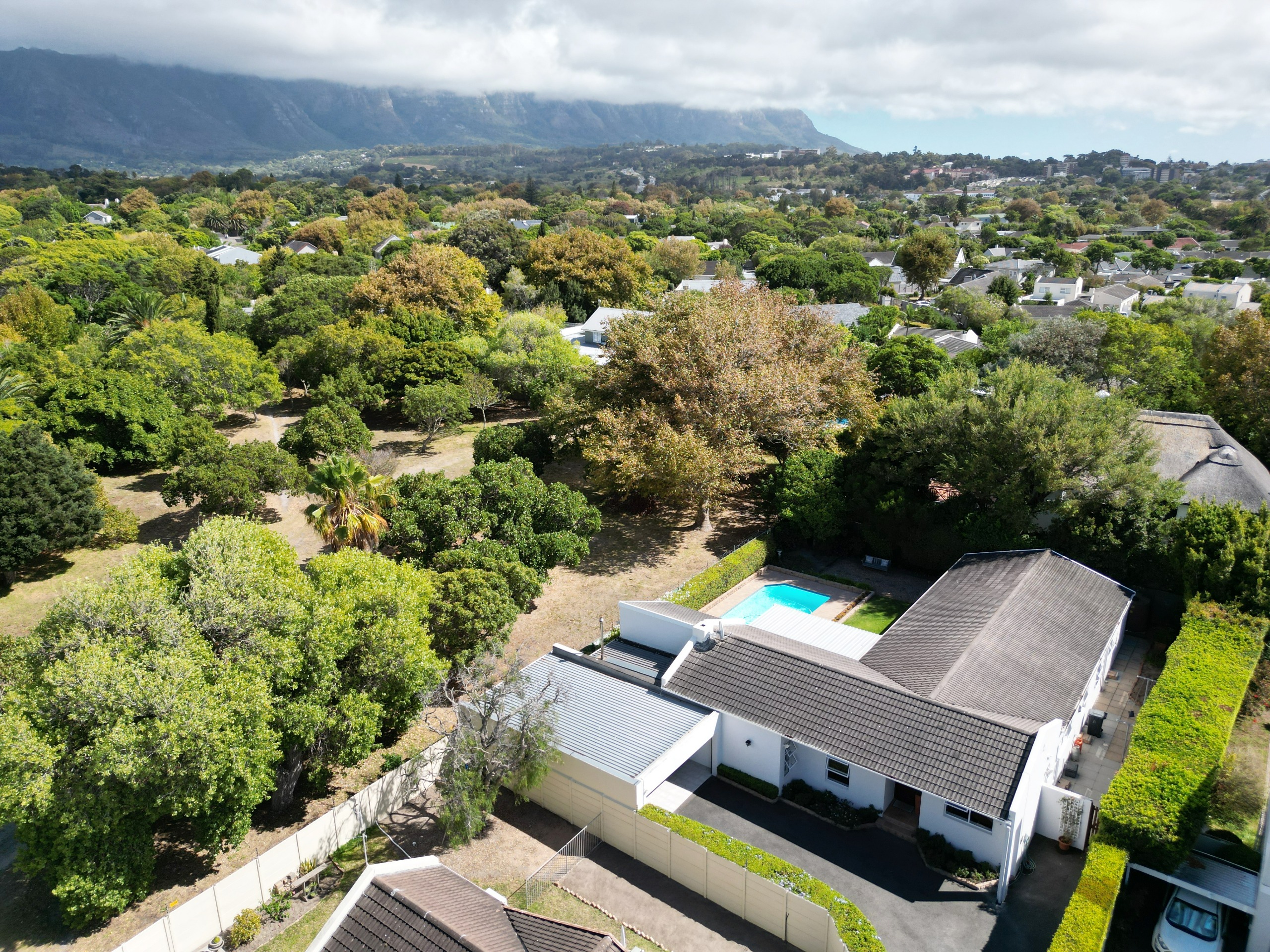 Every aspect of this property epitomises careful consideration – from the location down a quiet panhandle, to the modern finishes throughout, to the L-shaped build creating a beautifully-sheltered North-facing entertainment space looking towards the Constantia mountains, and the generous size of every room. There is parking for 6+ cars along the driveway plus an extra-large, automated double garage with direct access into the house.