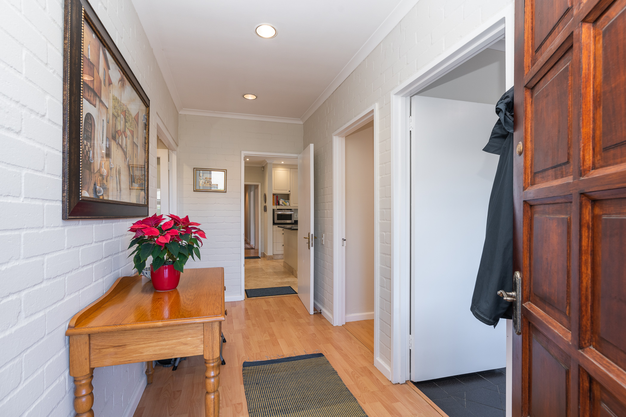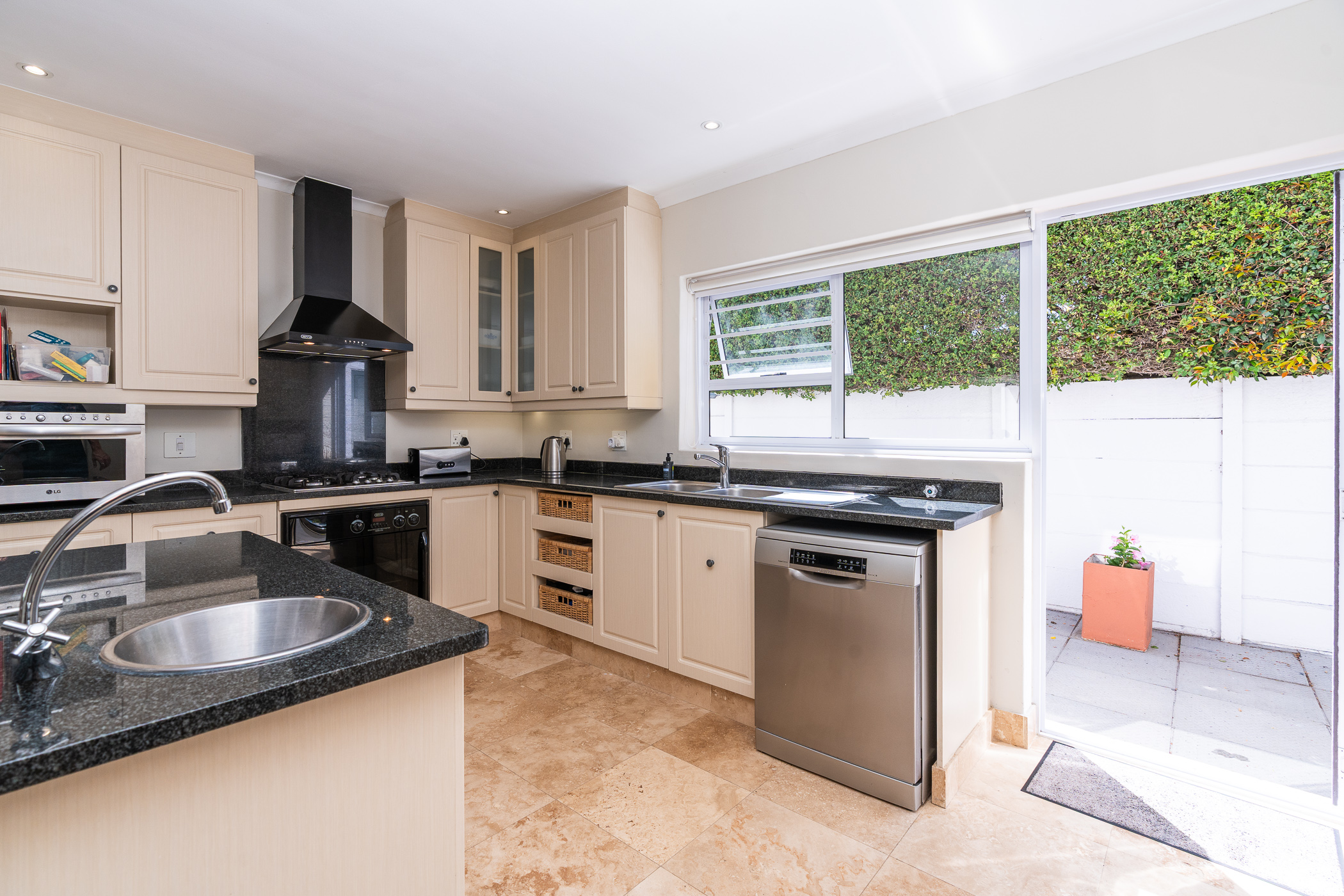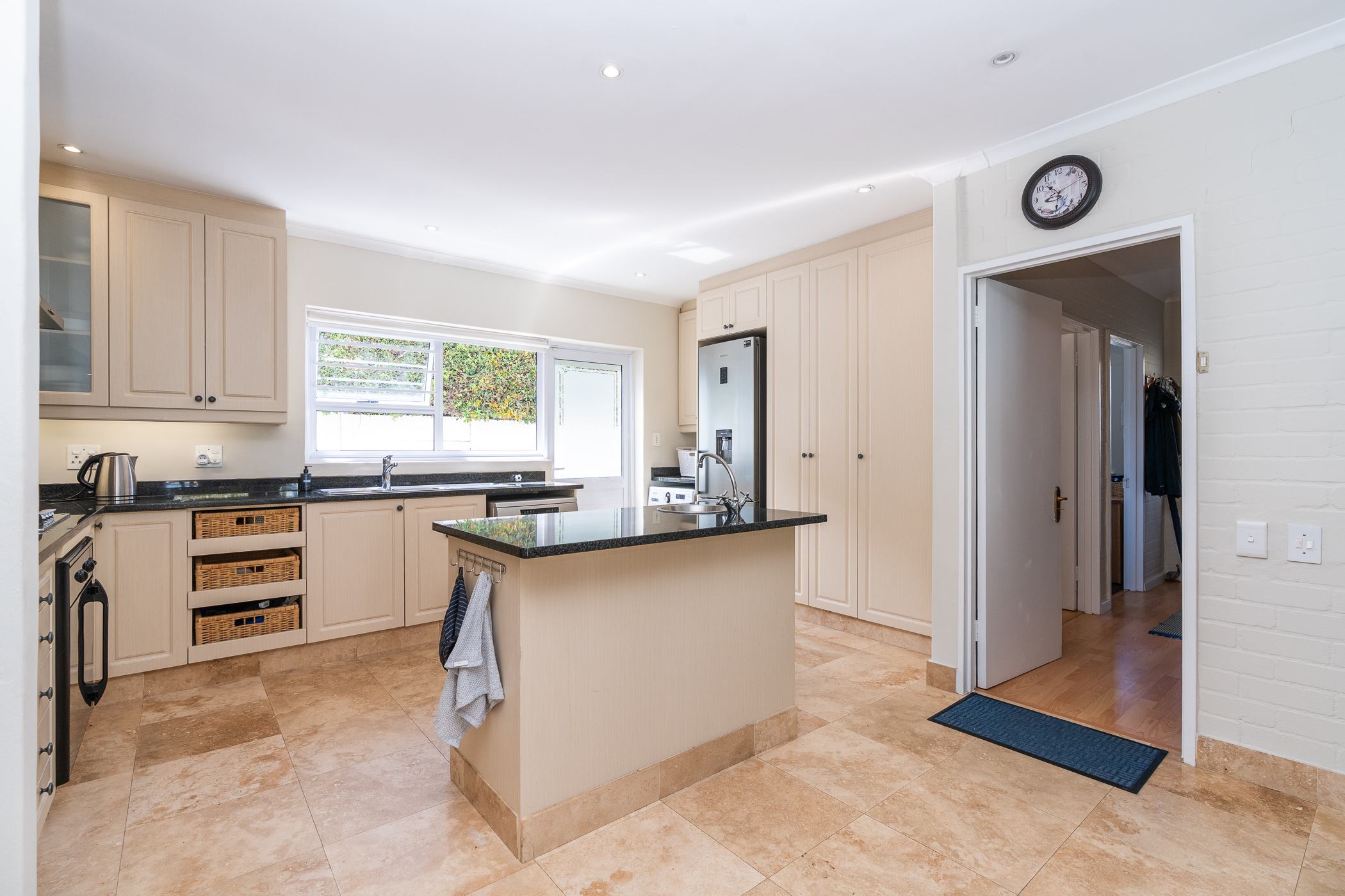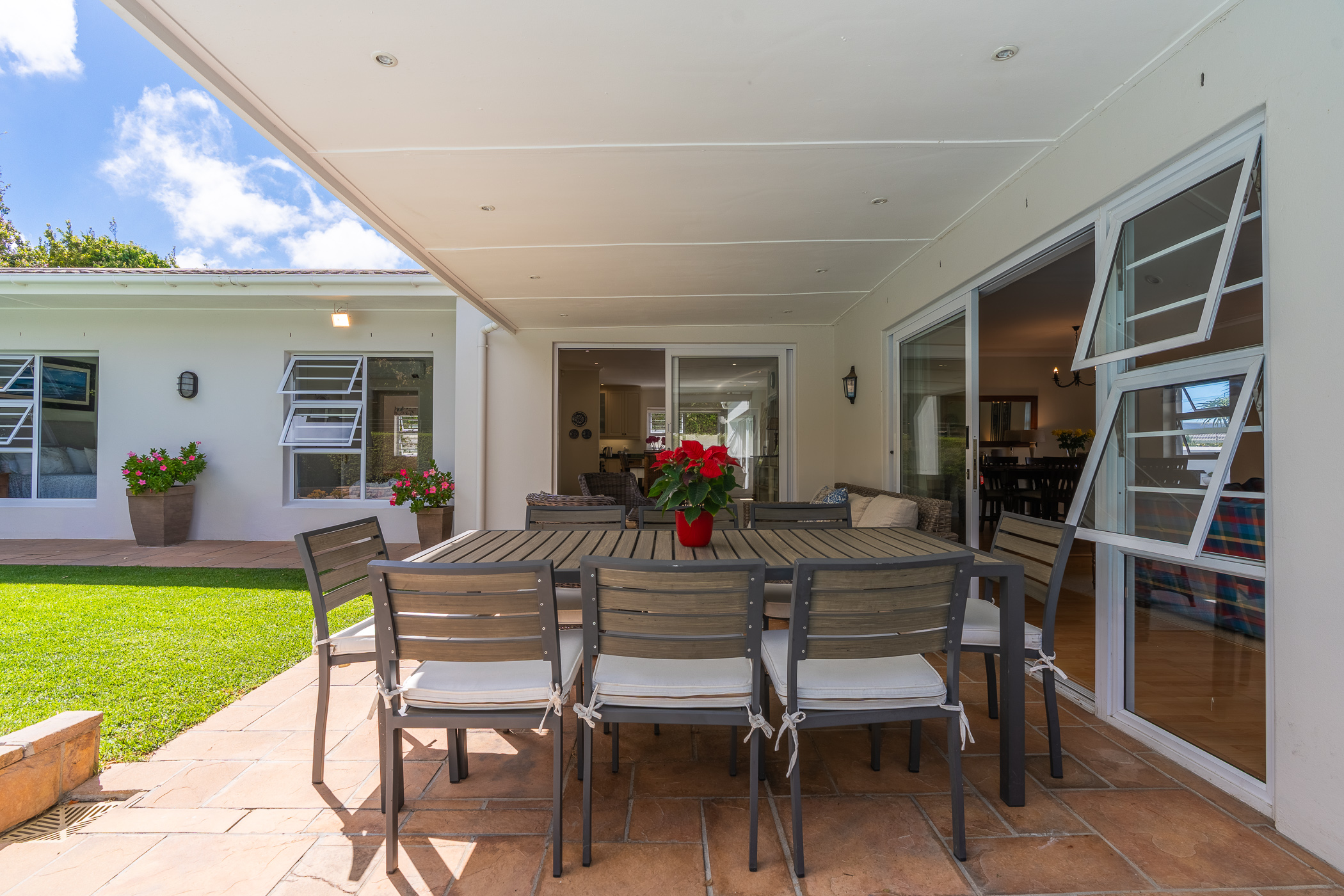 Every aspect of this property epitomises careful consideration – from the location down a quiet panhandle, to the modern finishes throughout, to the L-shaped build creating a beautifully-sheltered North-facing entertainment space looking towards the Constantia mountains, and the generous size of every room. There is parking for 6+ cars along the driveway plus an extra-large, automated double garage with direct access into the house.