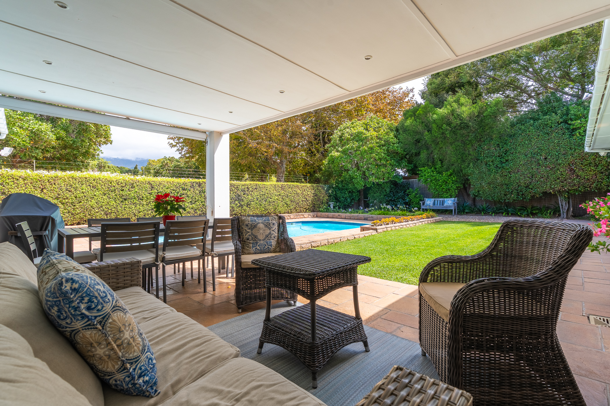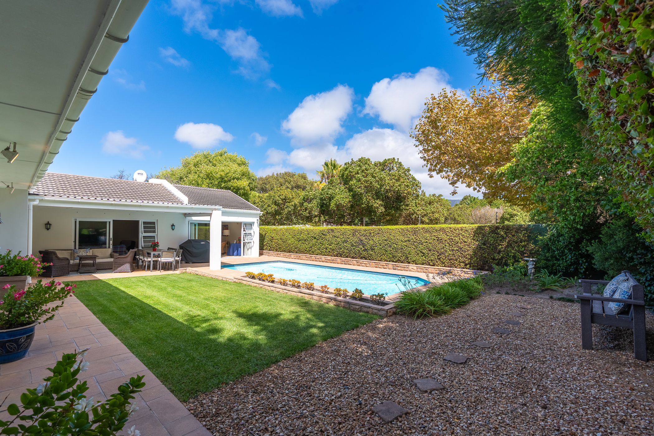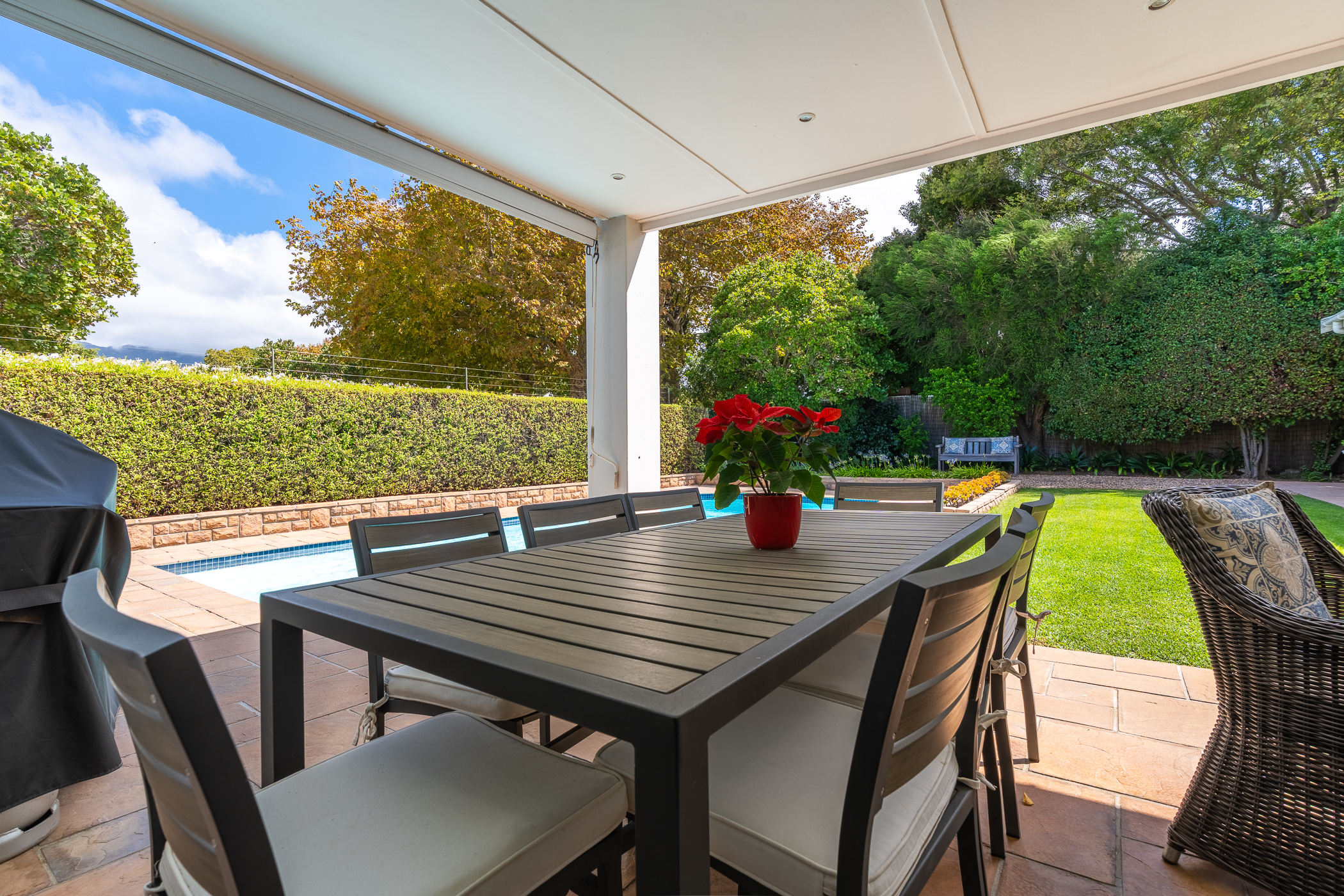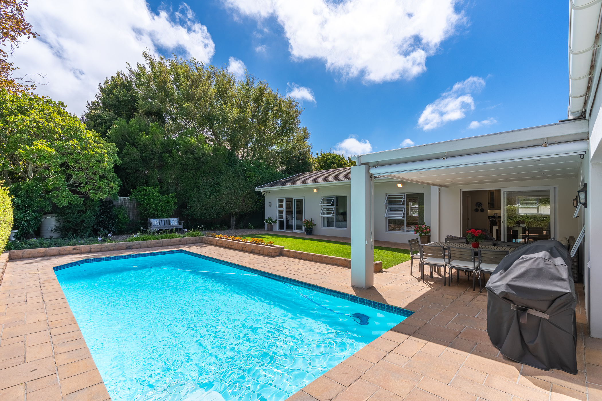Upon entering the home, one will find a study and guest cloakroom to the right, a palatial formal dining and sitting room (with gas fireplace) to the left, or straight ahead into the family room and open plan kitchen. The kitchen has granite counters, a gas hob, built-in oven, space for two washing appliances and a central island with prep bowl. There is no shortage of options in terms of dining with an informal dining/family room off the kitchen, which leads through sliding doors to an undercover patio. From the patio, you can catch a glimpse of the Constantia mountains, enjoy the swaying of the mature trees in the neighbouring greenbelt, and enjoy the sunshine across the swimming pool and manicured patch of lawn.