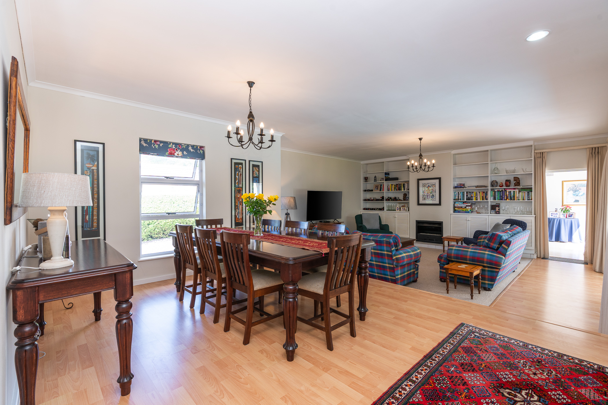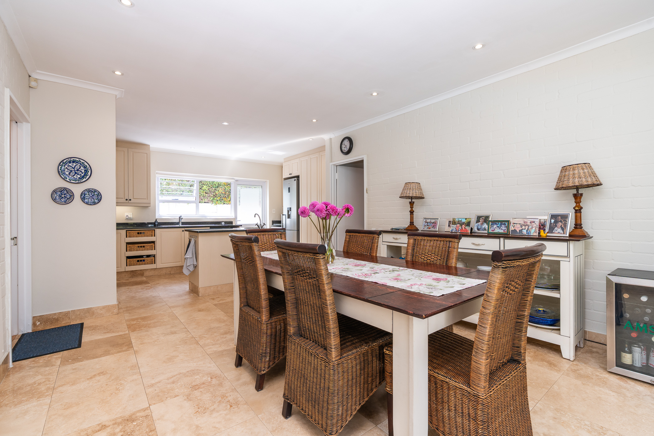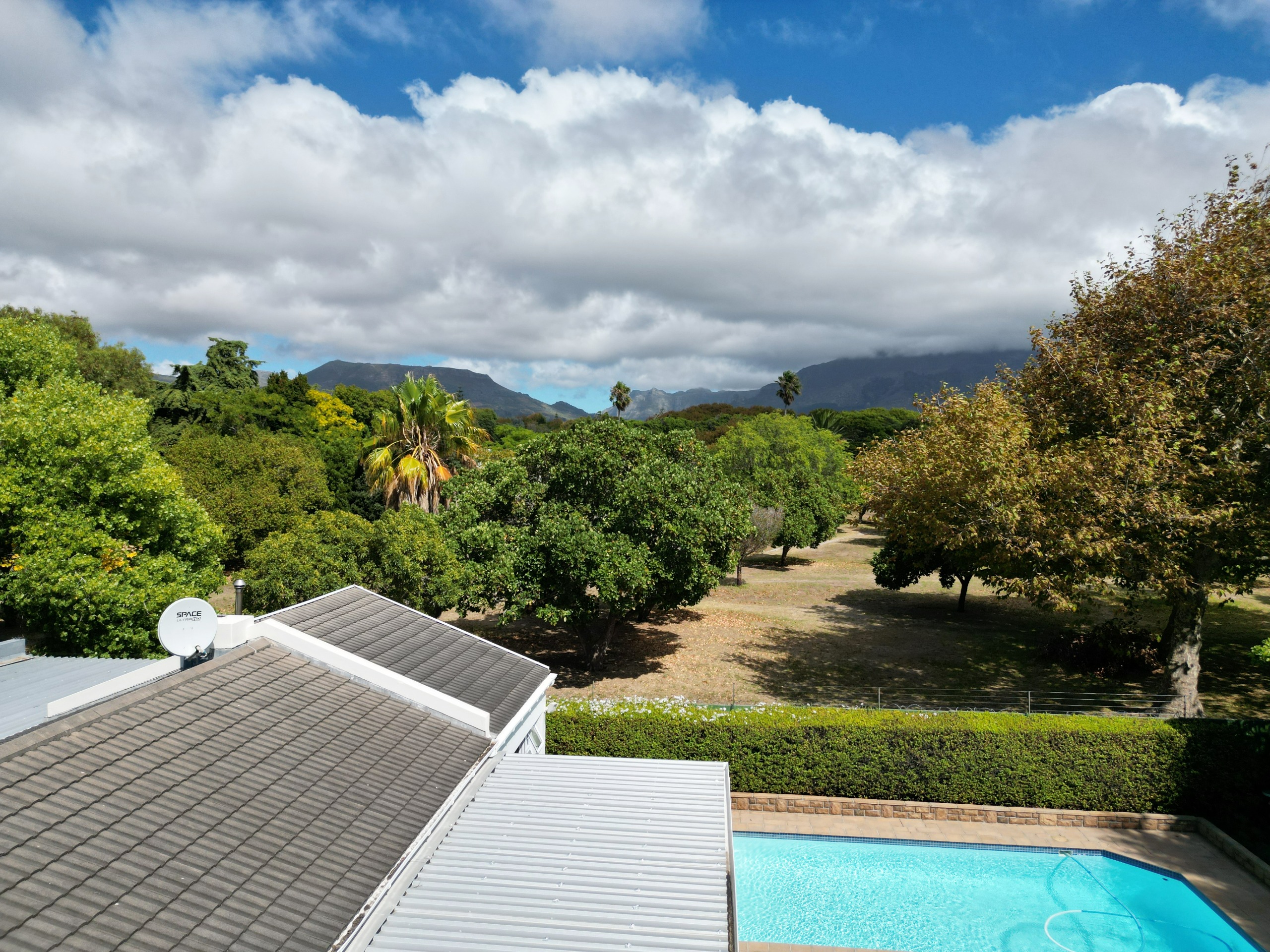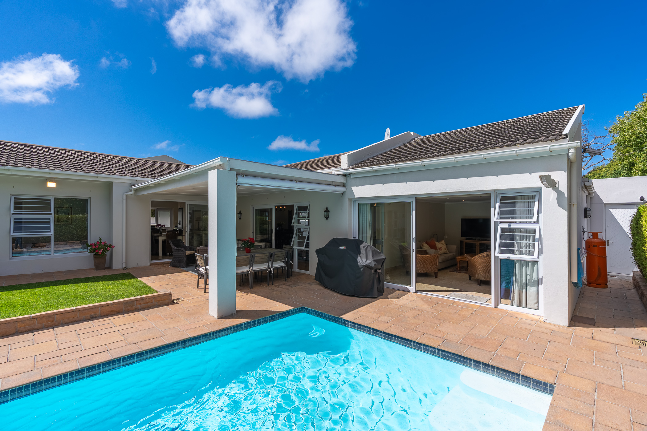 Upon entering the home, one will find a study and guest cloakroom to the right, a palatial formal dining and sitting room (with gas fireplace) to the left, or straight ahead into the family room and open plan kitchen. The kitchen has granite counters, a gas hob, built-in oven, space for two washing appliances and a central island with prep bowl. There is no shortage of options in terms of dining with an informal dining/family room off the kitchen, which leads through sliding doors to an undercover patio. From the patio, you can catch a glimpse of the Constantia mountains, enjoy the swaying of the mature trees in the neighbouring greenbelt, and enjoy the sunshine across the swimming pool and manicured patch of lawn.