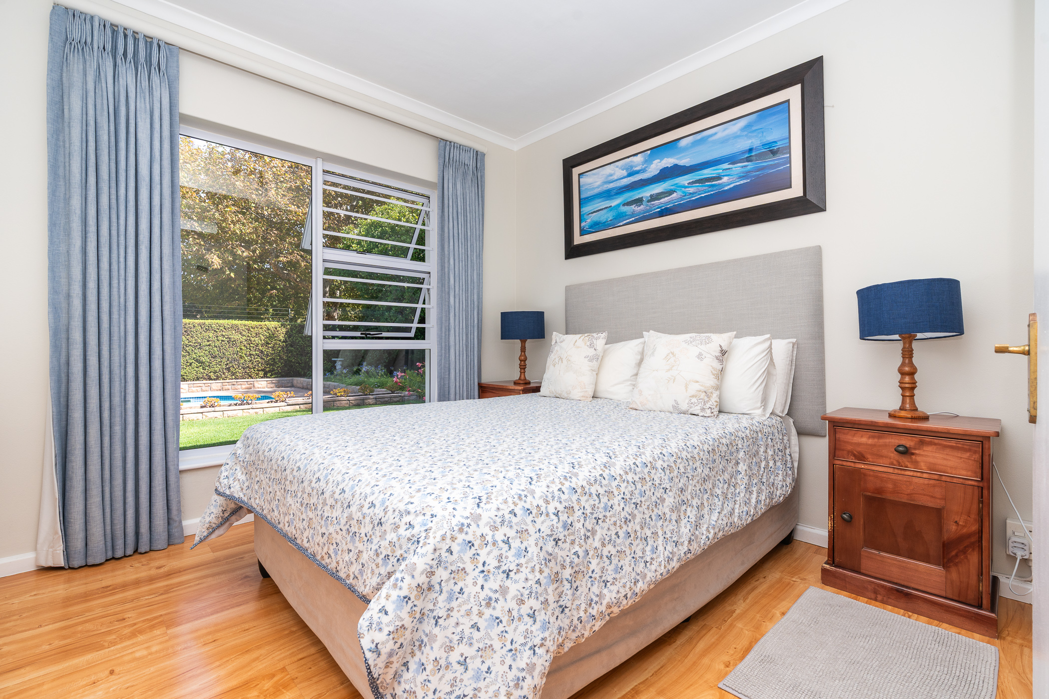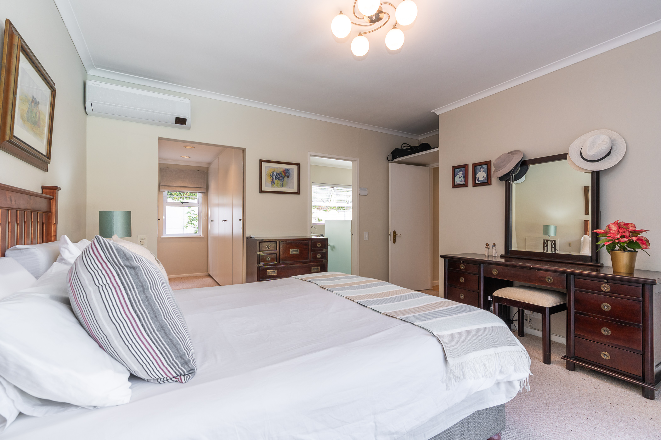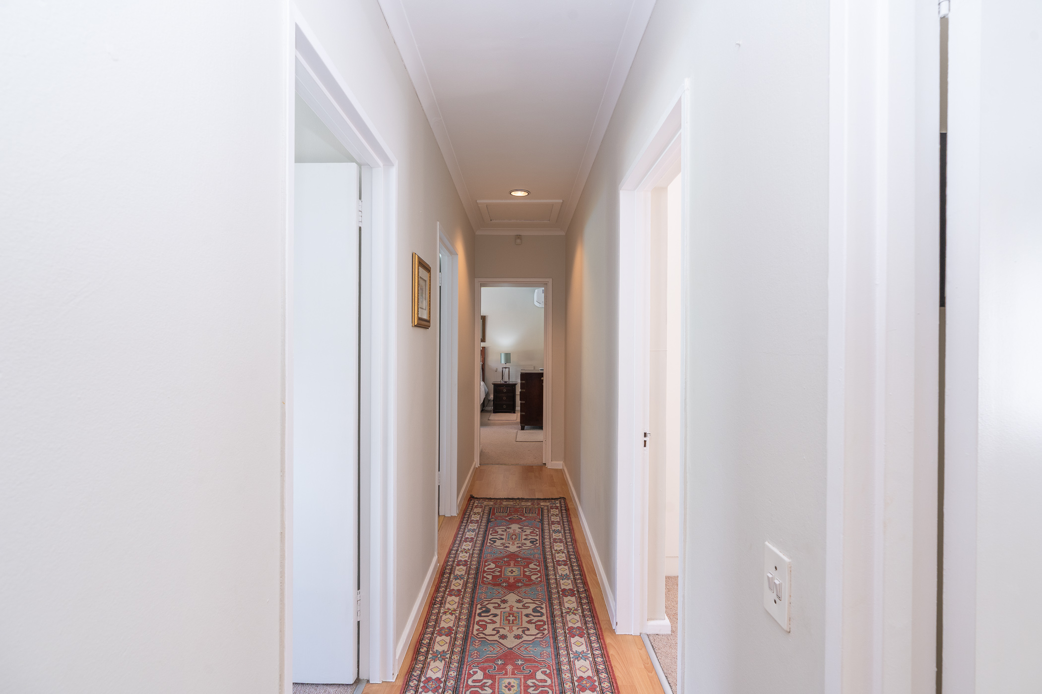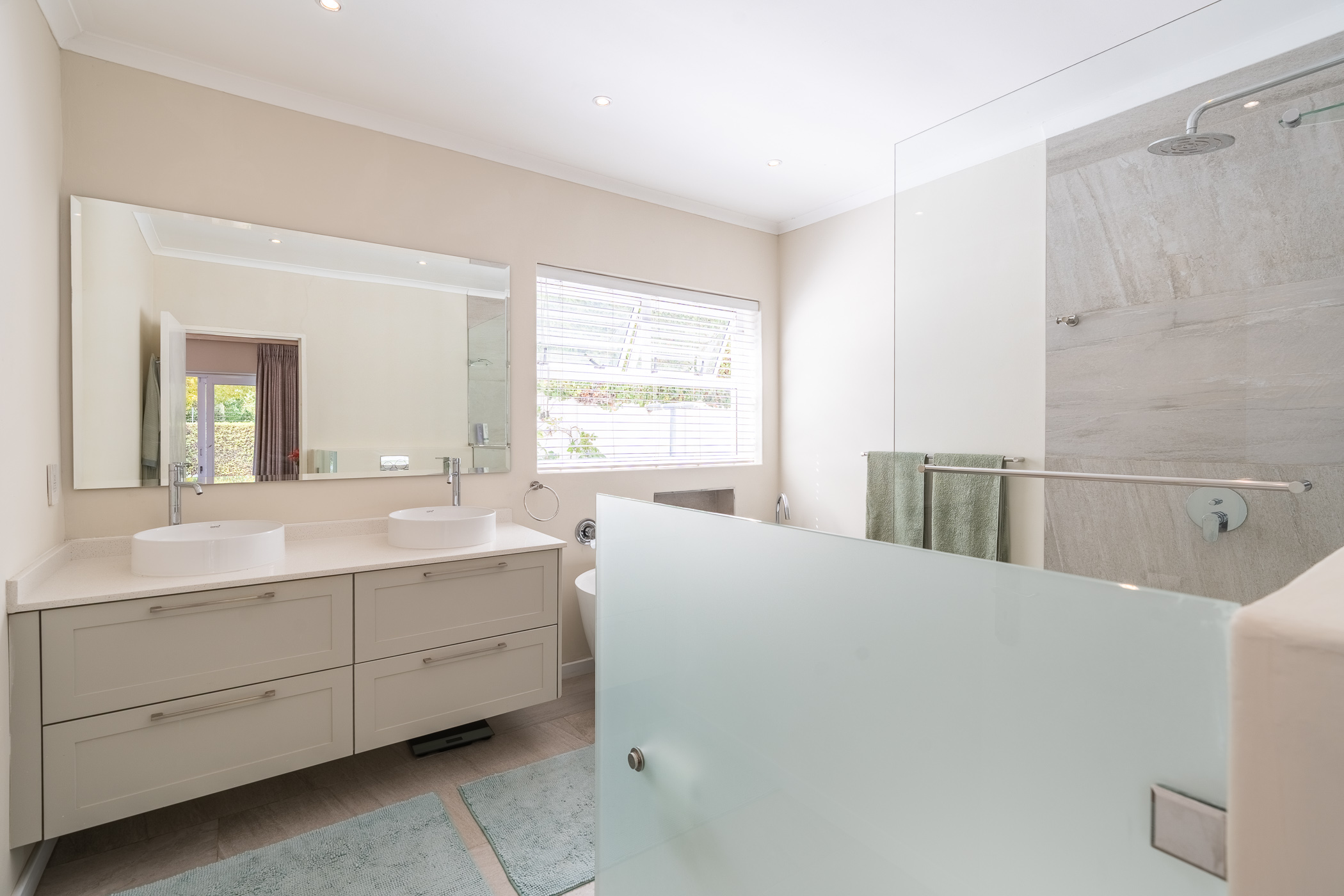 The bedroom wing consists of 4 bedrooms, 3 of which look onto the garden, and the main enjoys direct access through French doors. All 4 bedrooms have built-in cupboards. The main bedroom has an aircon, walk-in closet, and gorgeous modern bathroom with double vanity, egg tub, and large shower. Two more aircons (all digital inverter types) in two of the bedrooms. One of our favourite additional spaces is the pyjama lounge/winter room (with Morso fireplace) that sits between the garage and formal lounge – and also enjoys direct access to the garden. Extras include direct access to the greenbelt through a pedestrian gate, aluminium windows and doors throughout, rainwater/greywater system, and first class security.