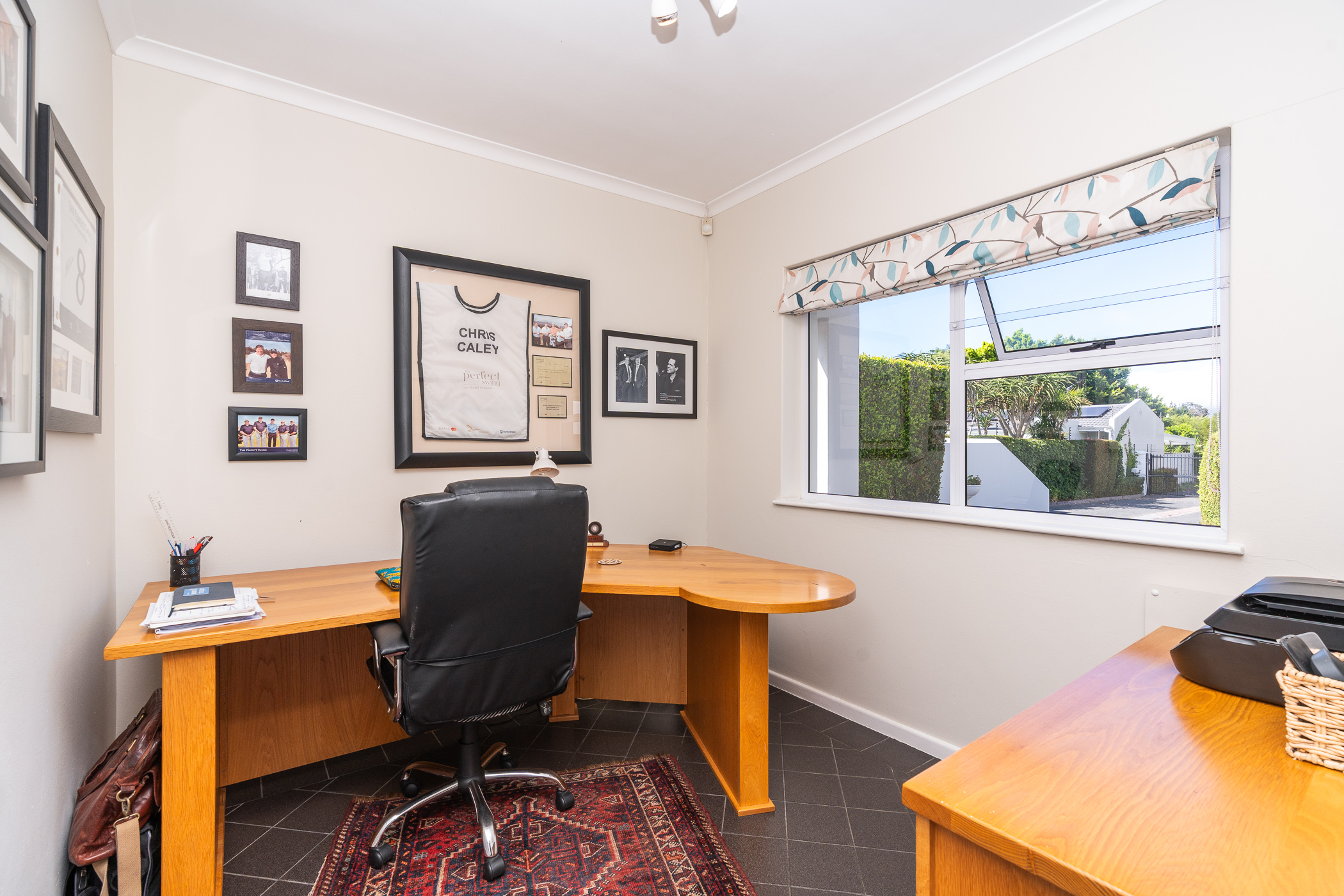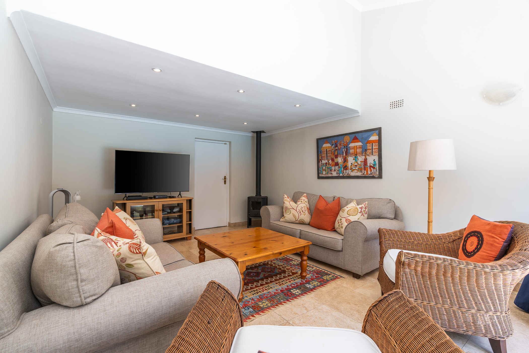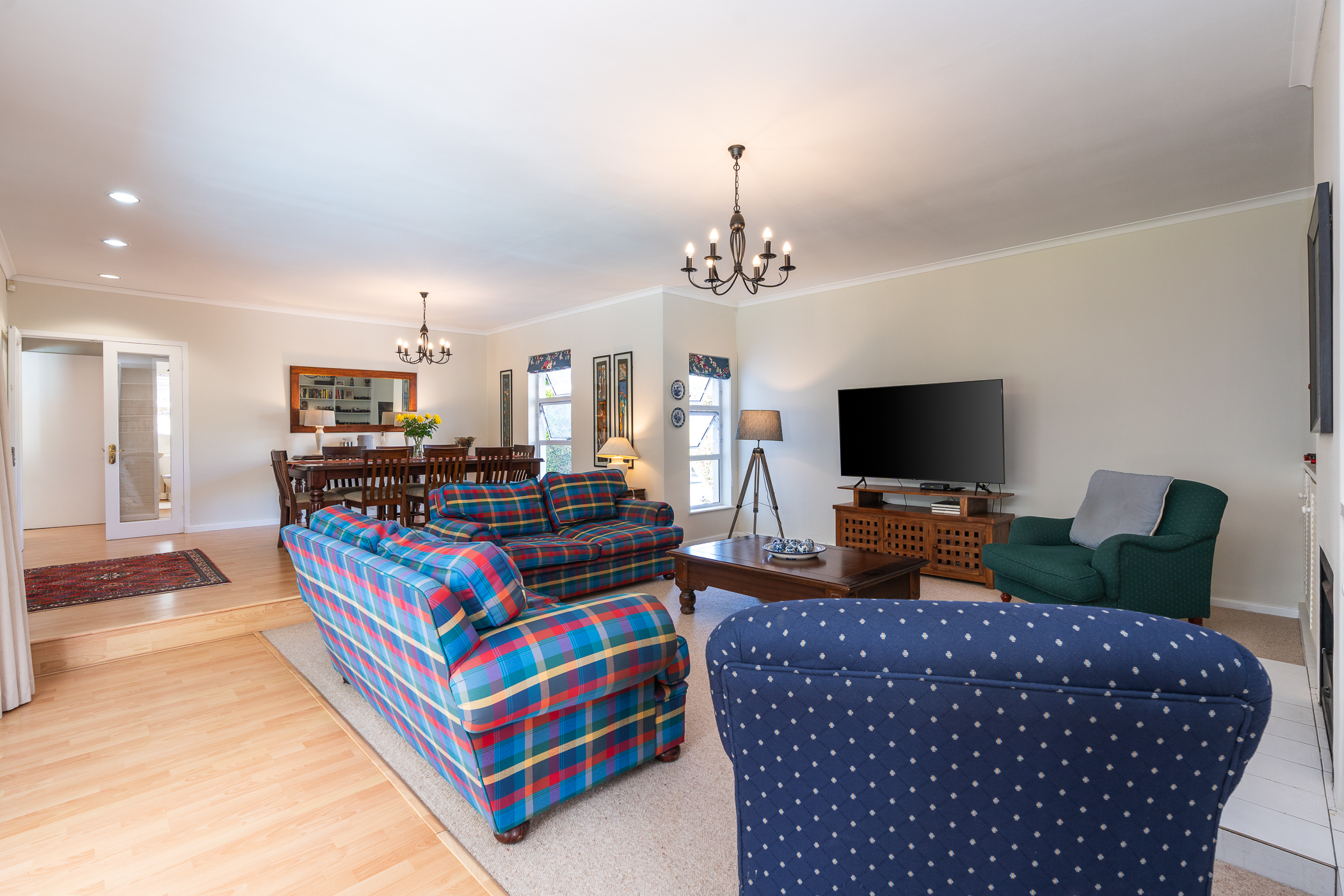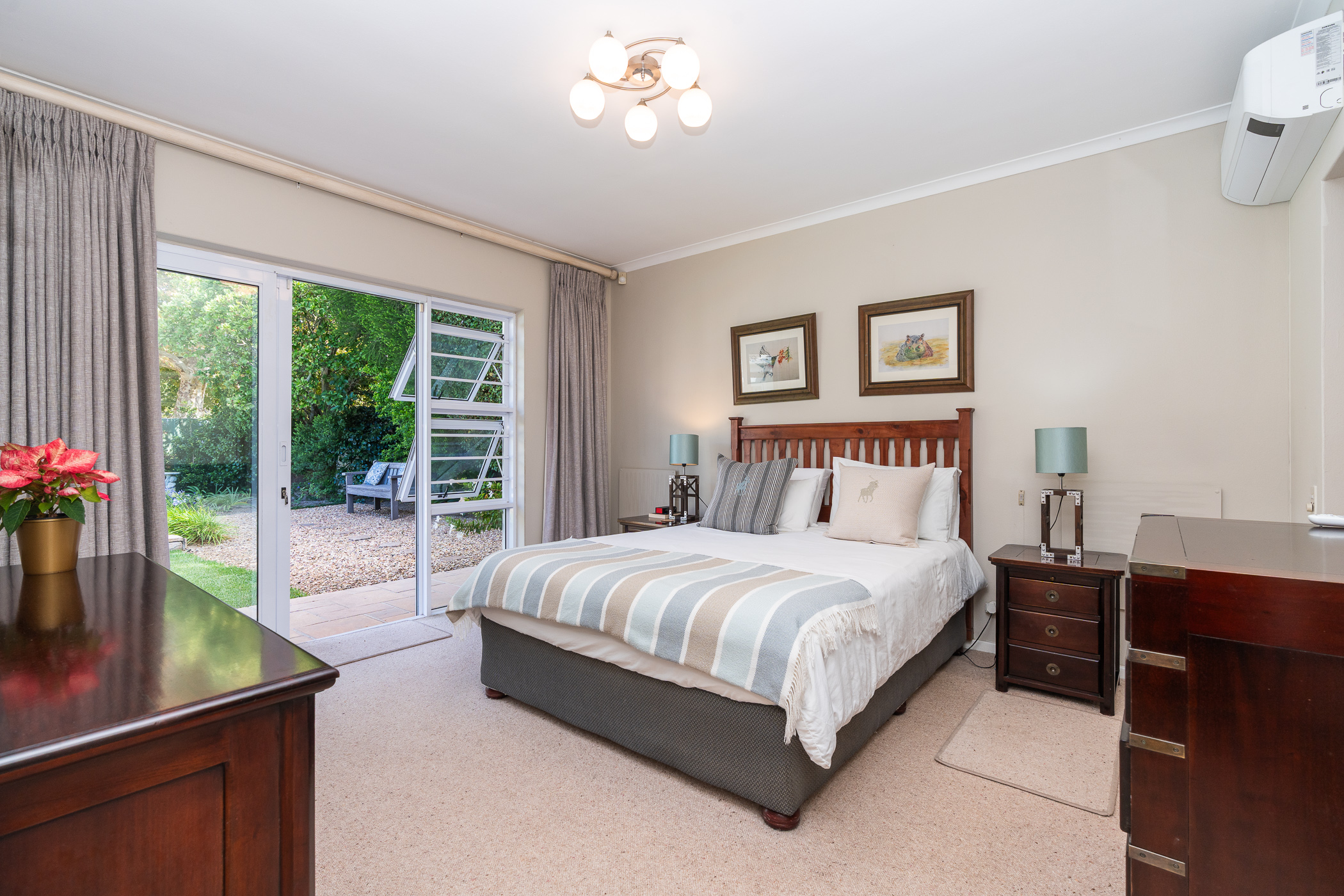 The bedroom wing consists of 4 bedrooms, 3 of which look onto the garden, and the main enjoys direct access through French doors. All 4 bedrooms have built-in cupboards. The main bedroom has an aircon, walk-in closet, and gorgeous modern bathroom with double vanity, egg tub, and large shower. Two more aircons (all digital inverter types) in two of the bedrooms. One of our favourite additional spaces is the pyjama lounge/winter room (with Morso fireplace) that sits between the garage and formal lounge – and also enjoys direct access to the garden. Extras include direct access to the greenbelt through a pedestrian gate, aluminium windows and doors throughout, rainwater/greywater system, and first class security.