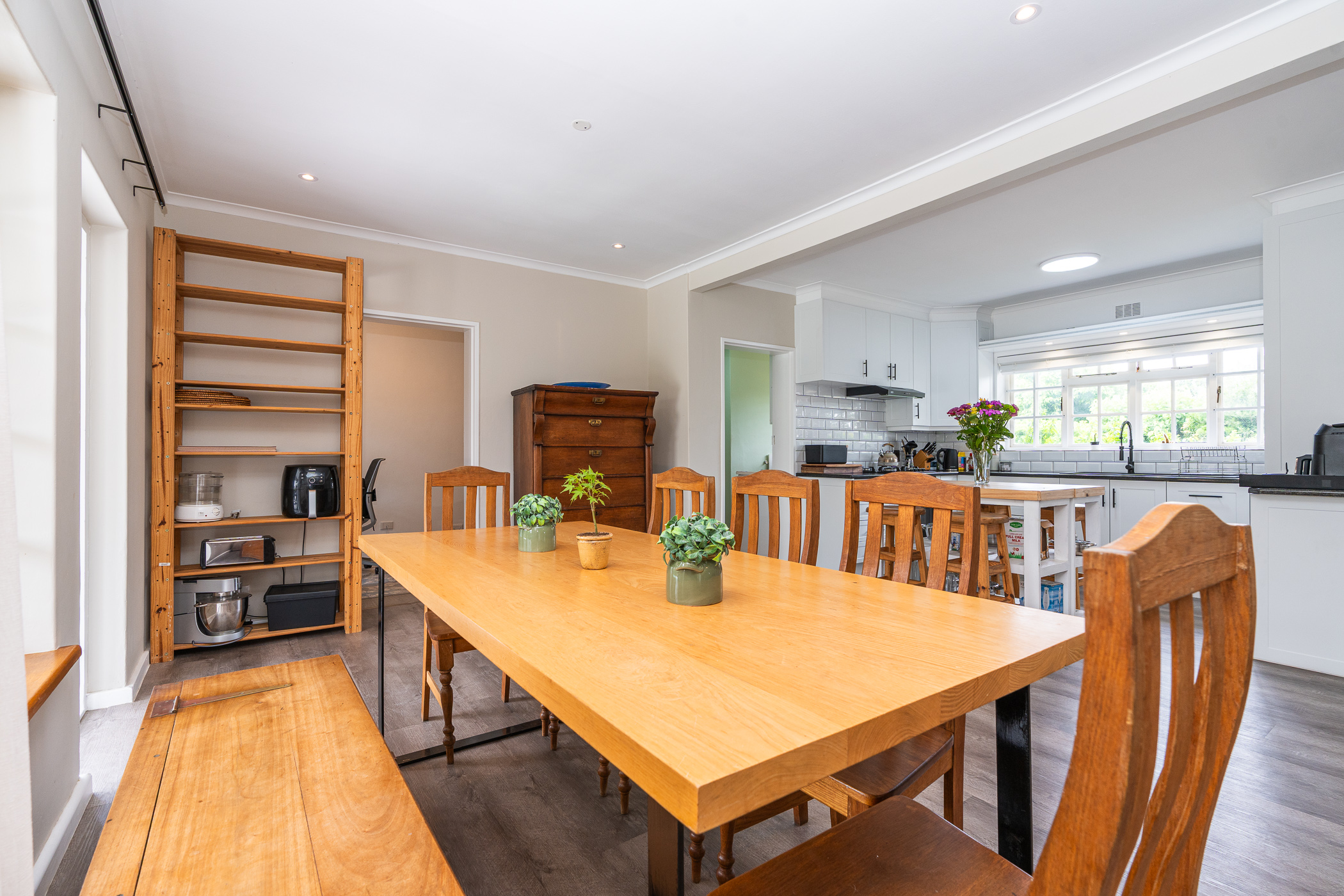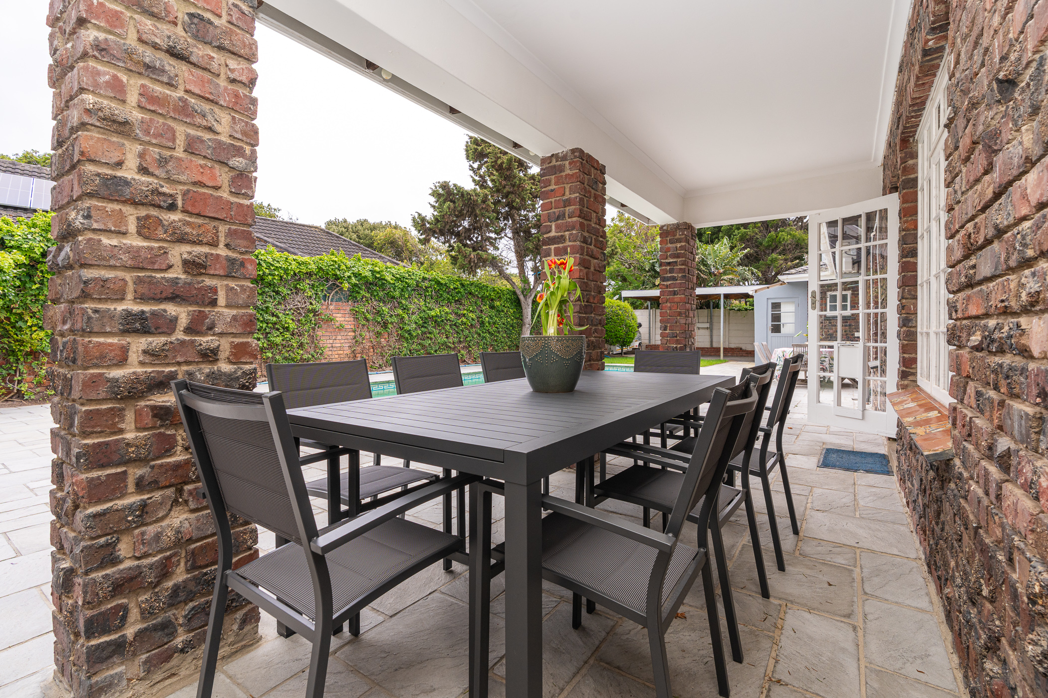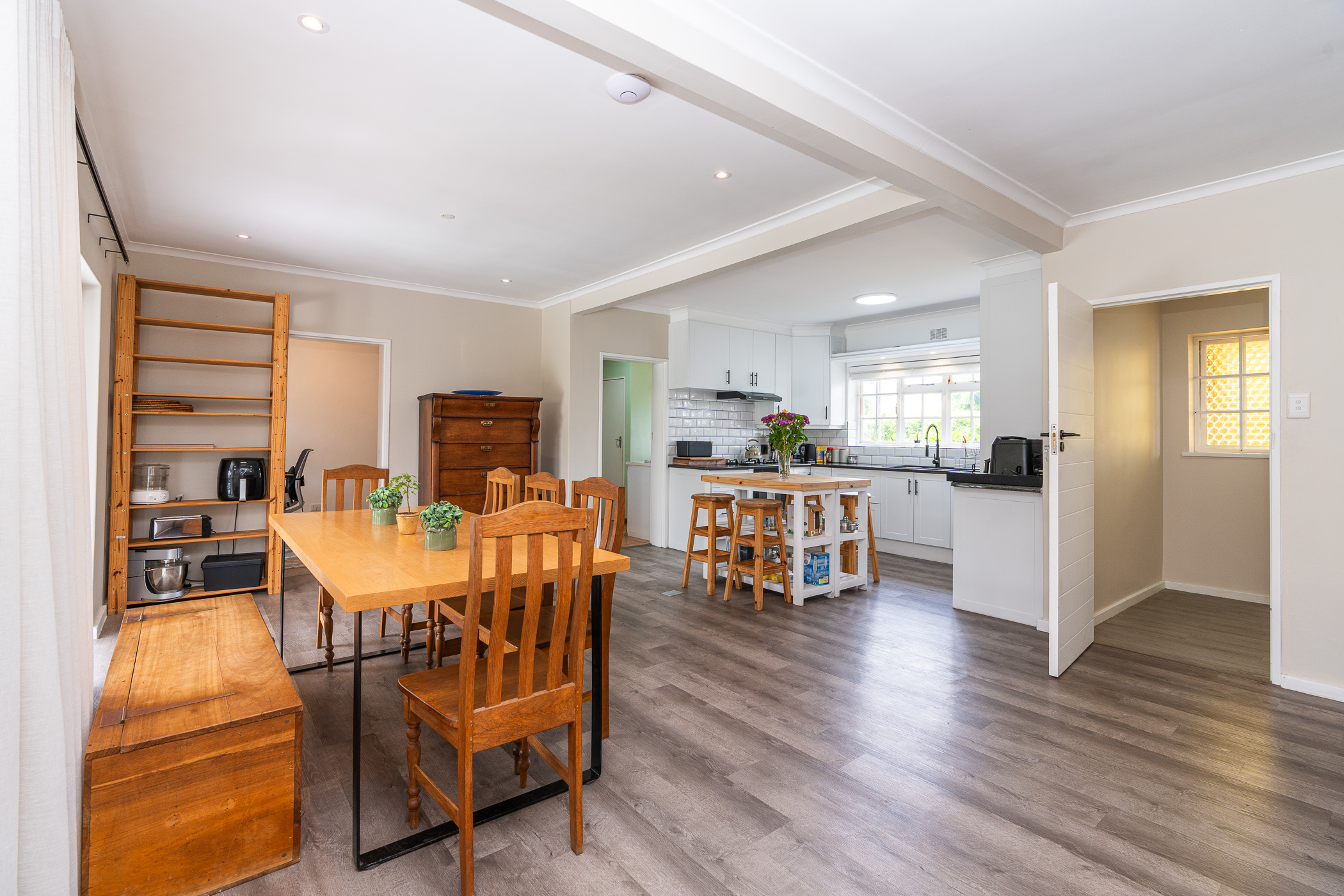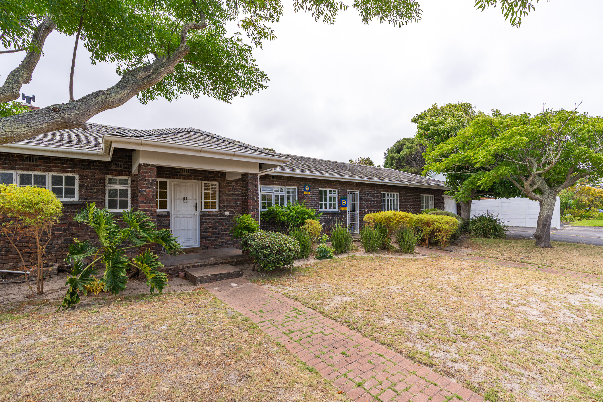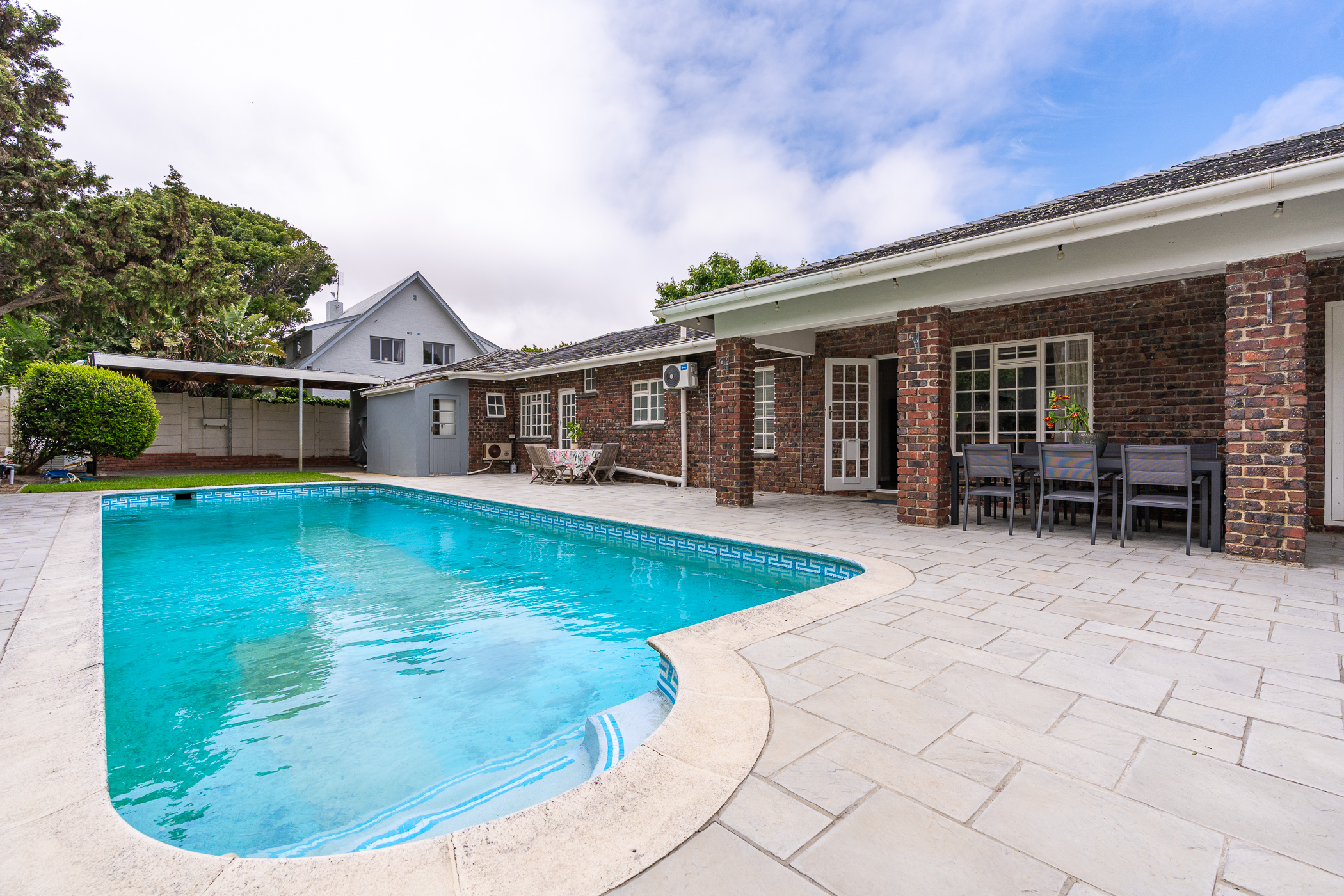 In 1976, its first owner, a dentist by profession, designed and built a unique concept on his large corner plot. One side of the property accommodated a complete 3 bedroom, 2 bathroom family home together with pool, private entertainment area and double garaging. The other side was devoted to his dental practice with an extra garage and triple tandem carport for good measure, plus domestic accommodation. The style of the home has the low-slung, sleek look of the 70’s with it’s Mazista slate roof, plum facebrick low-maintenance exterior and white wooden windows.