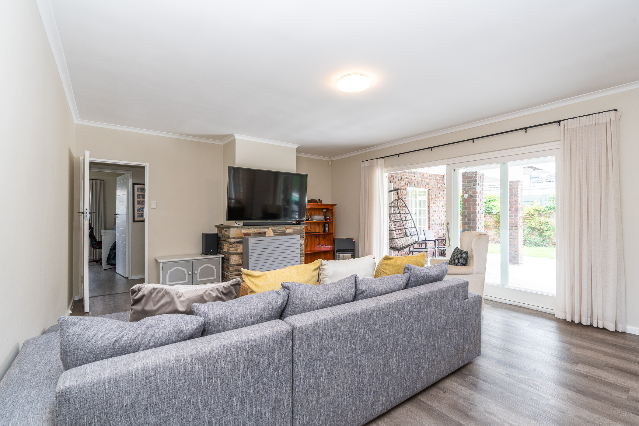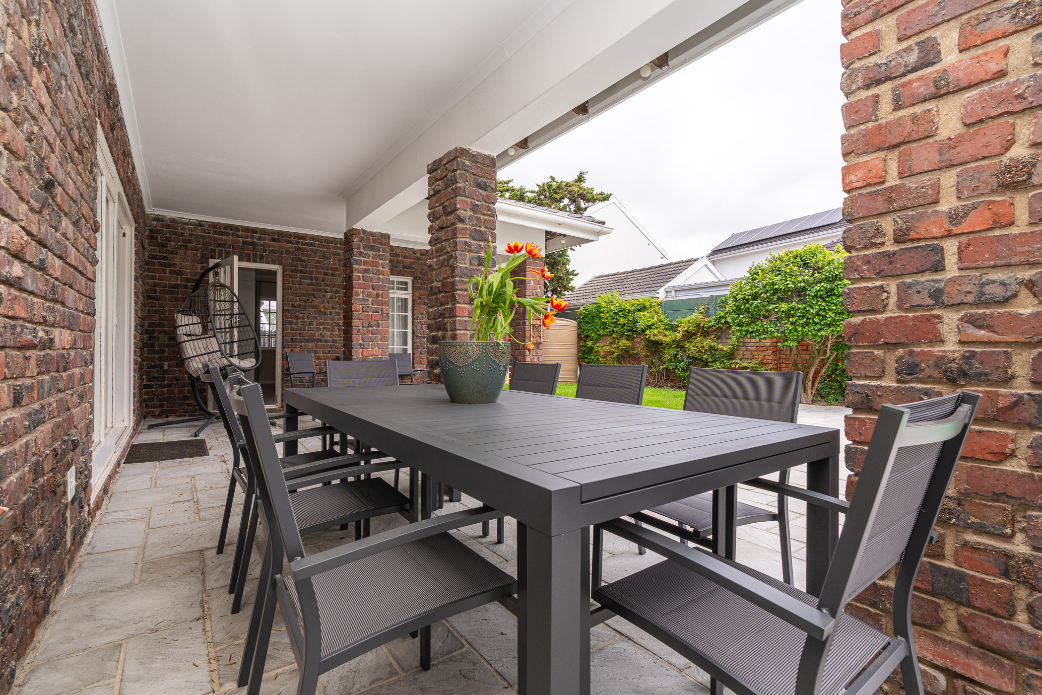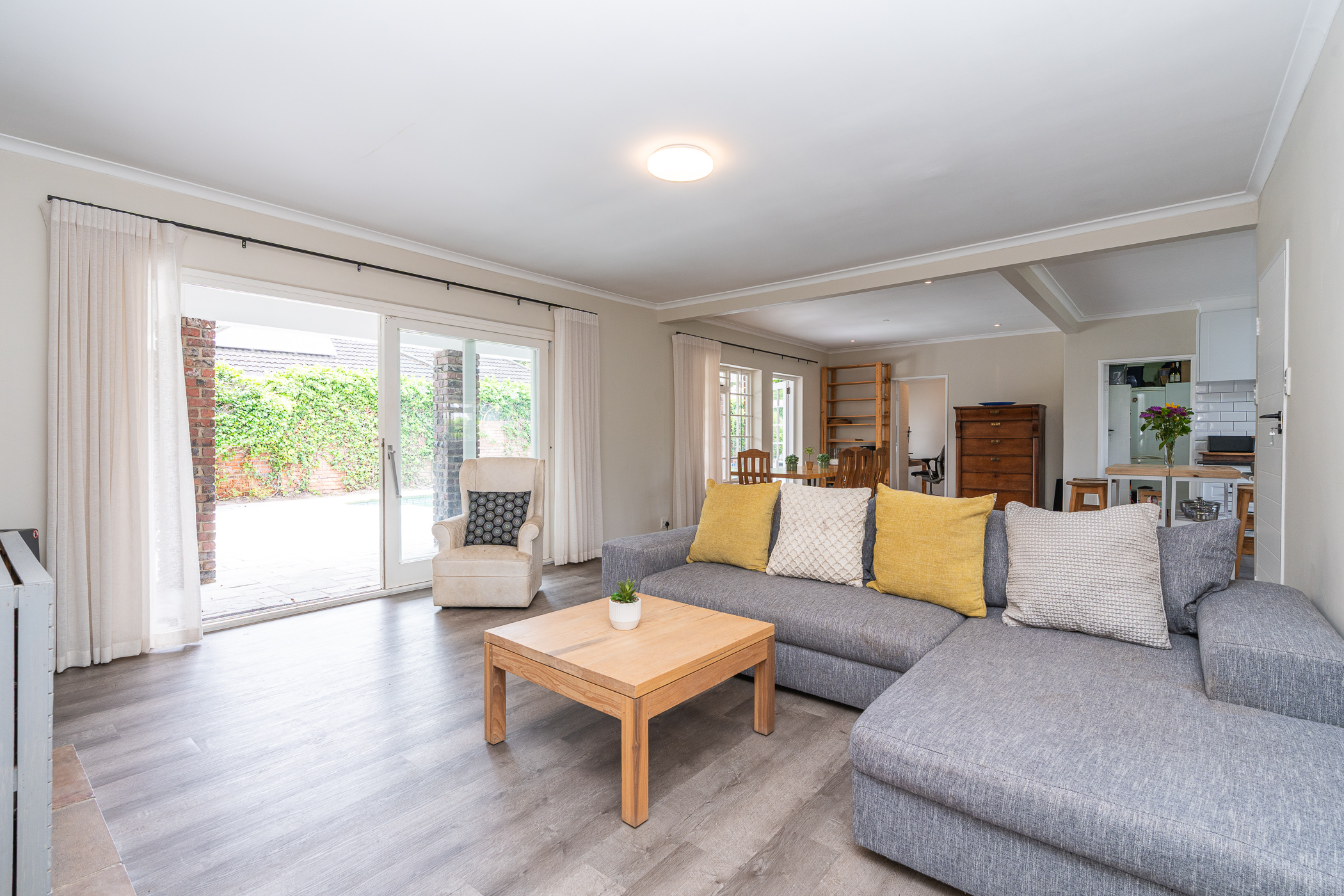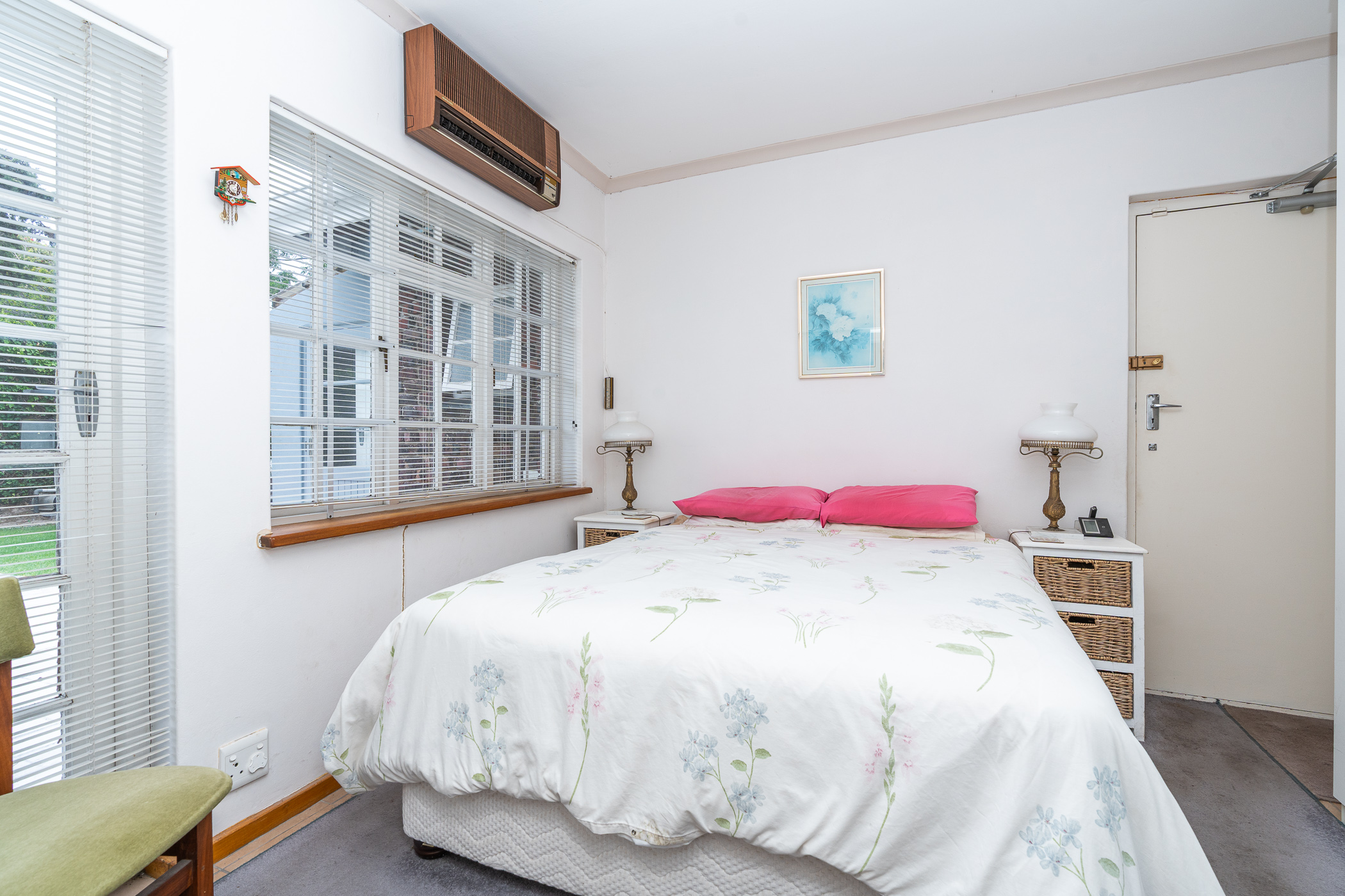 In 1976, its first owner, a dentist by profession, designed and built a unique concept on his large corner plot. One side of the property accommodated a complete 3 bedroom, 2 bathroom family home together with pool, private entertainment area and double garaging. The other side was devoted to his dental practice with an extra garage and triple tandem carport for good measure, plus domestic accommodation. The style of the home has the low-slung, sleek look of the 70’s with it’s Mazista slate roof, plum facebrick low-maintenance exterior and white wooden windows.