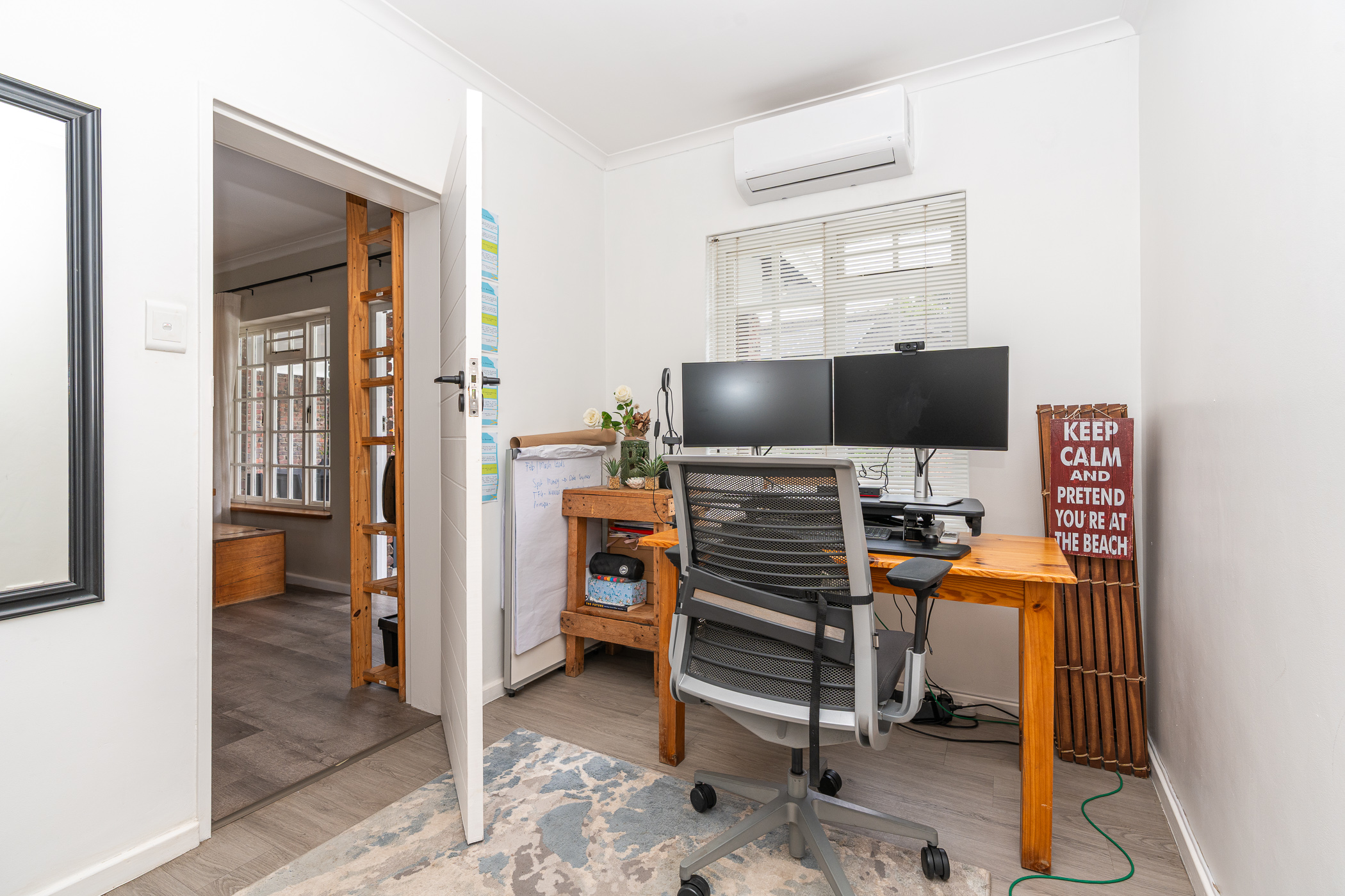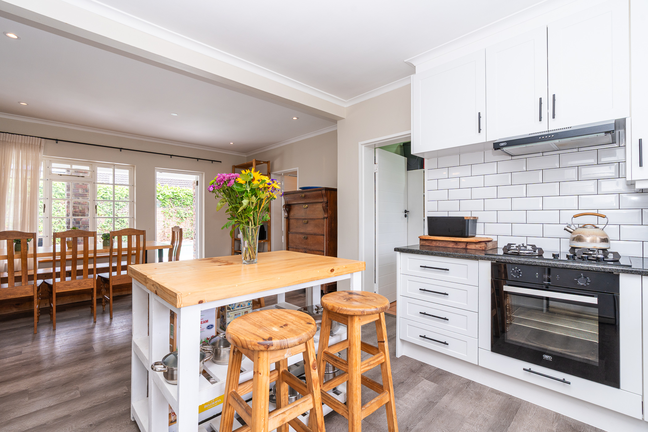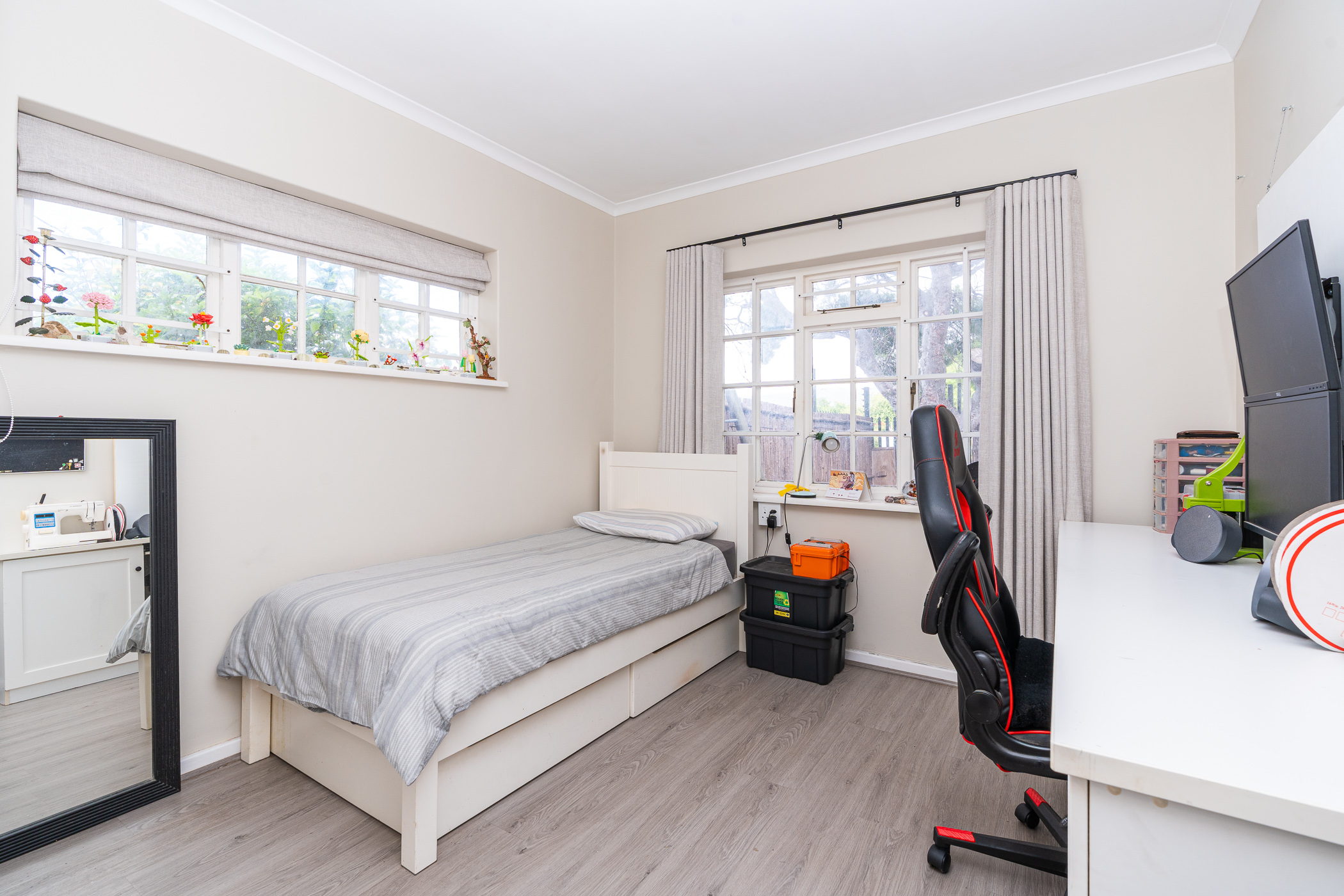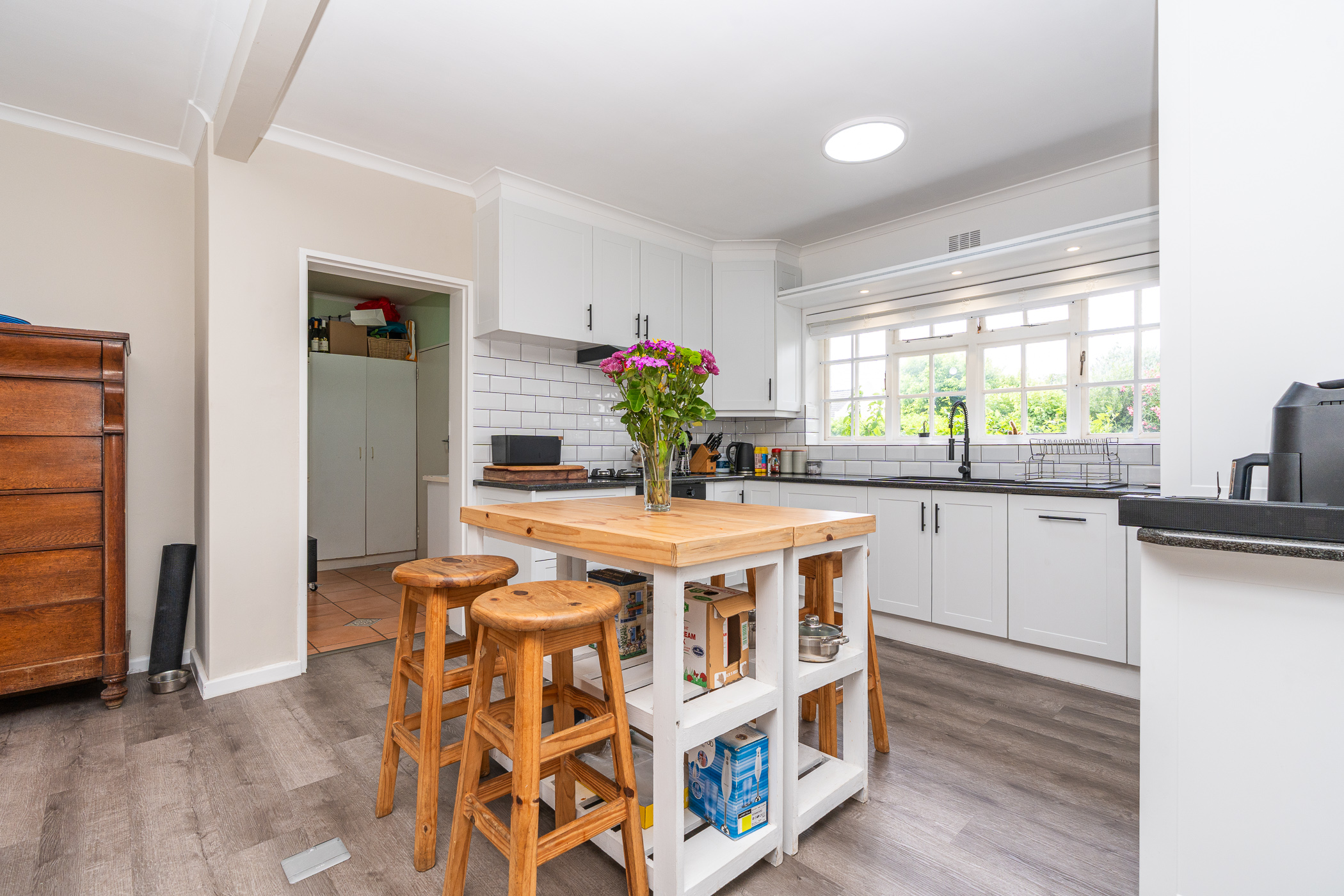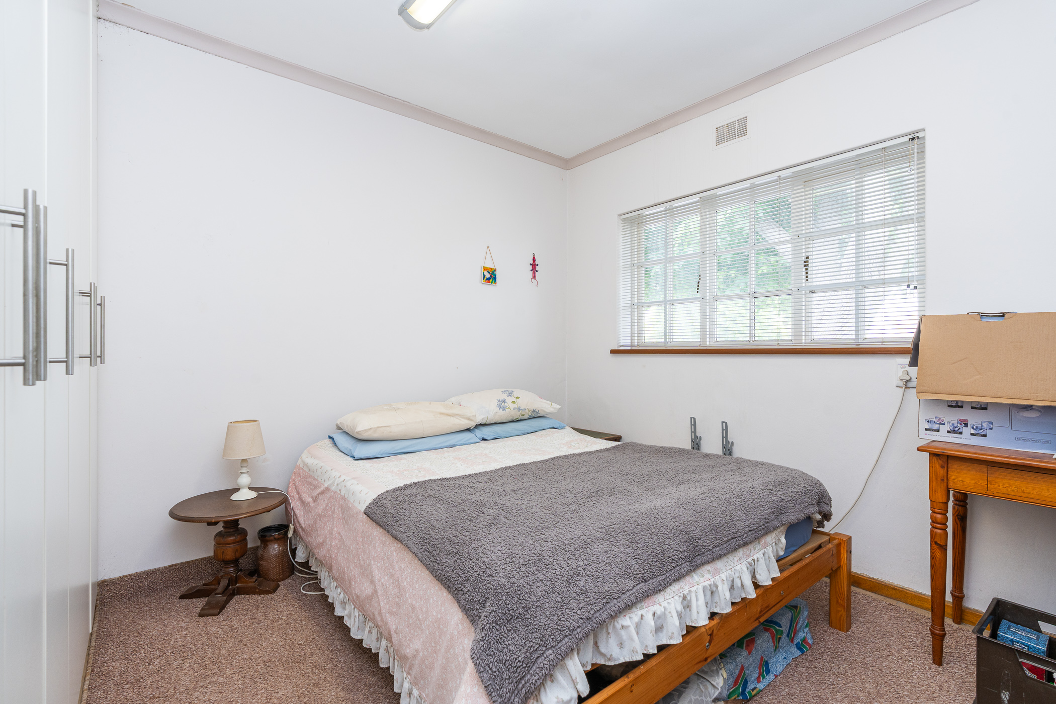 In 1976, its first owner, a dentist by profession, designed and built a unique concept on his large corner plot. One side of the property accommodated a complete 3 bedroom, 2 bathroom family home together with pool, private entertainment area and double garaging. The other side was devoted to his dental practice with an extra garage and triple tandem carport for good measure, plus domestic accommodation. The style of the home has the low-slung, sleek look of the 70’s with it’s Mazista slate roof, plum facebrick low-maintenance exterior and white wooden windows.