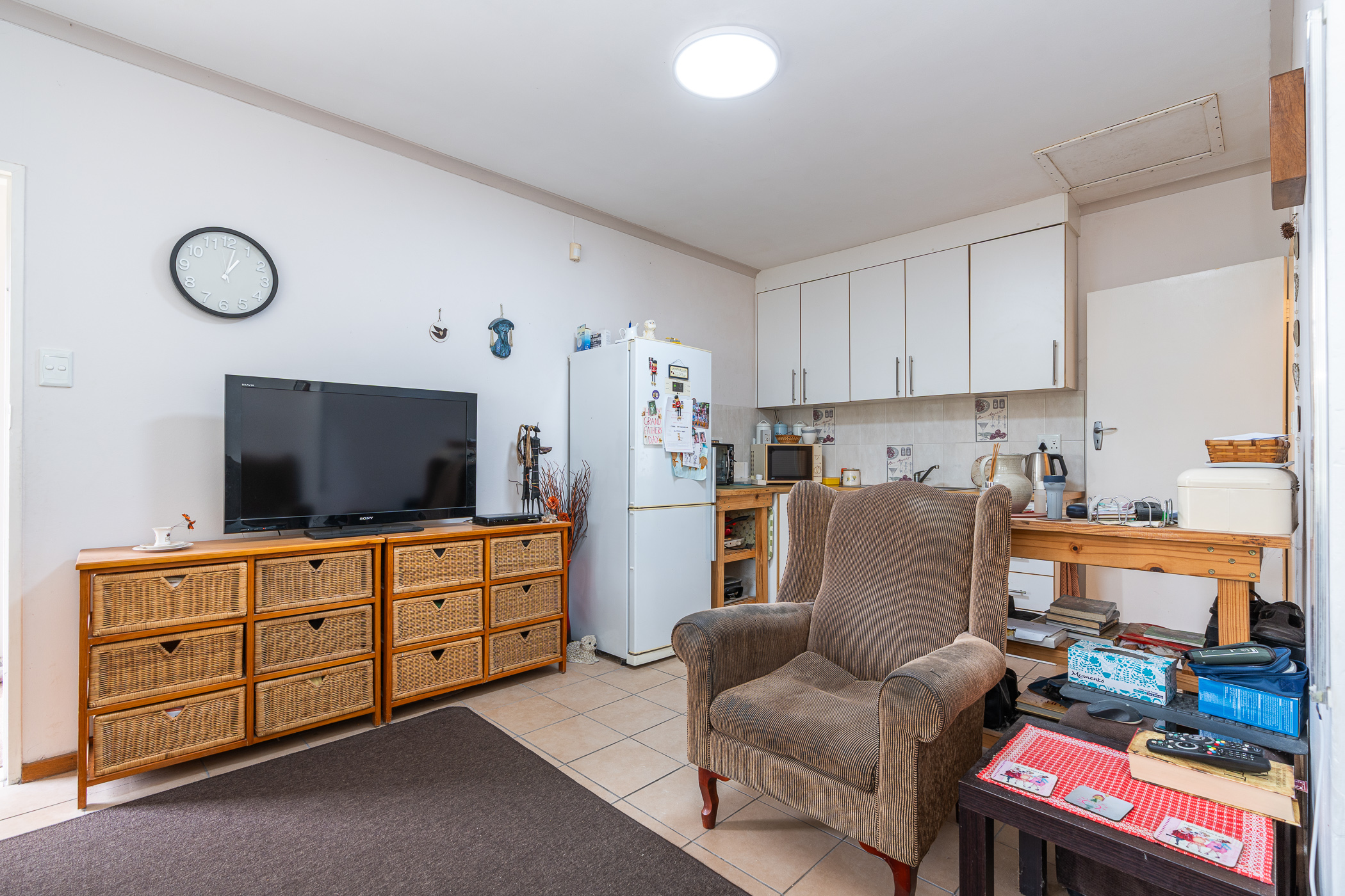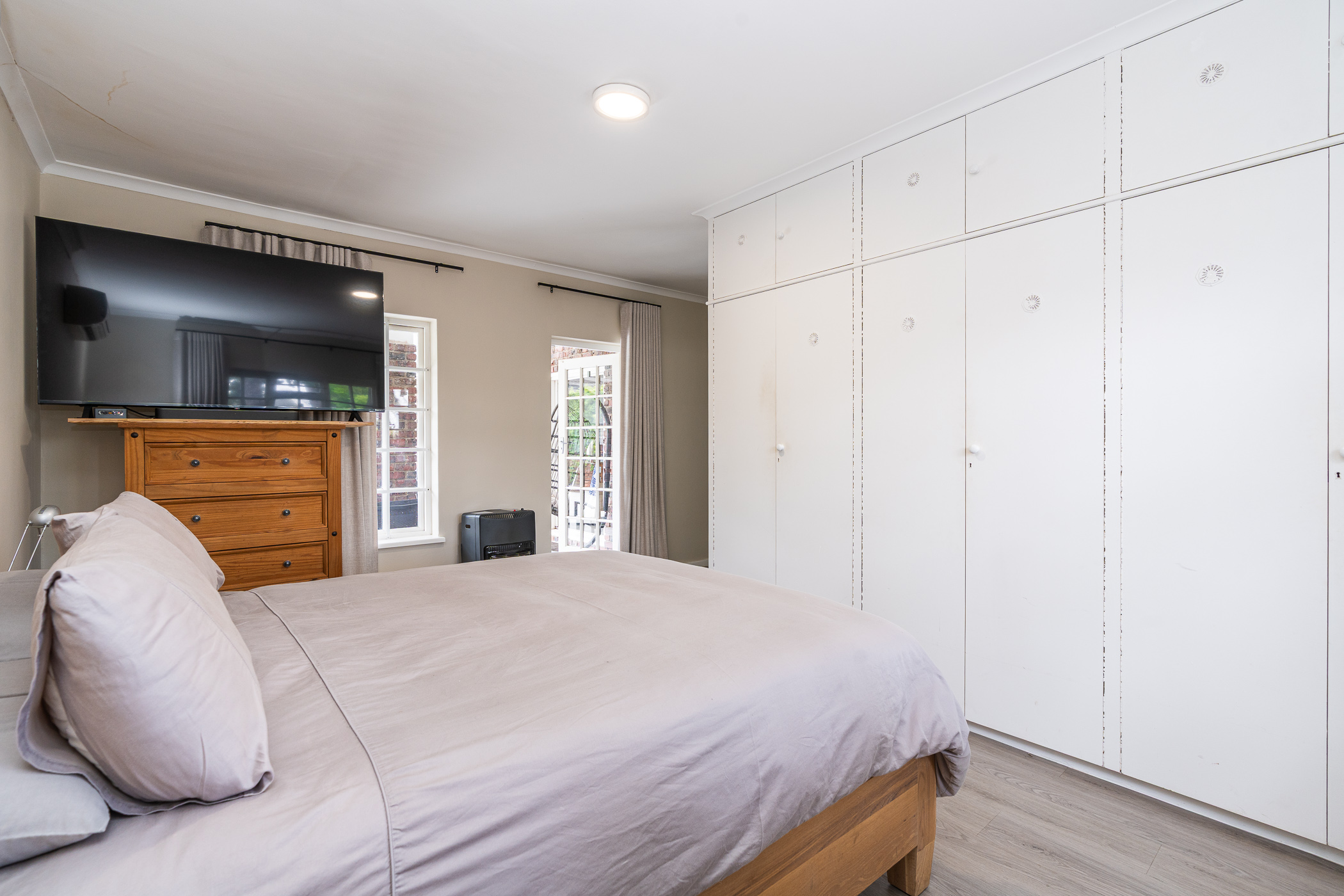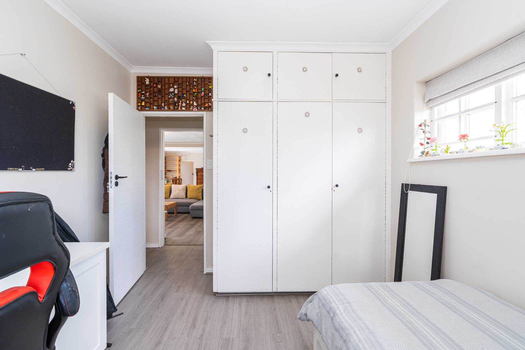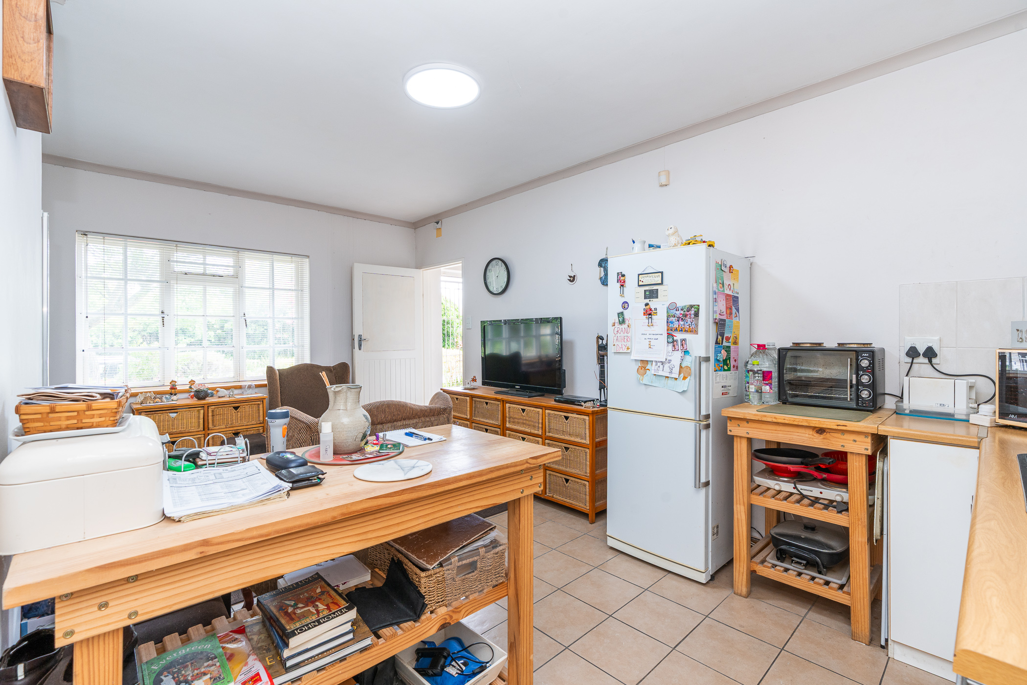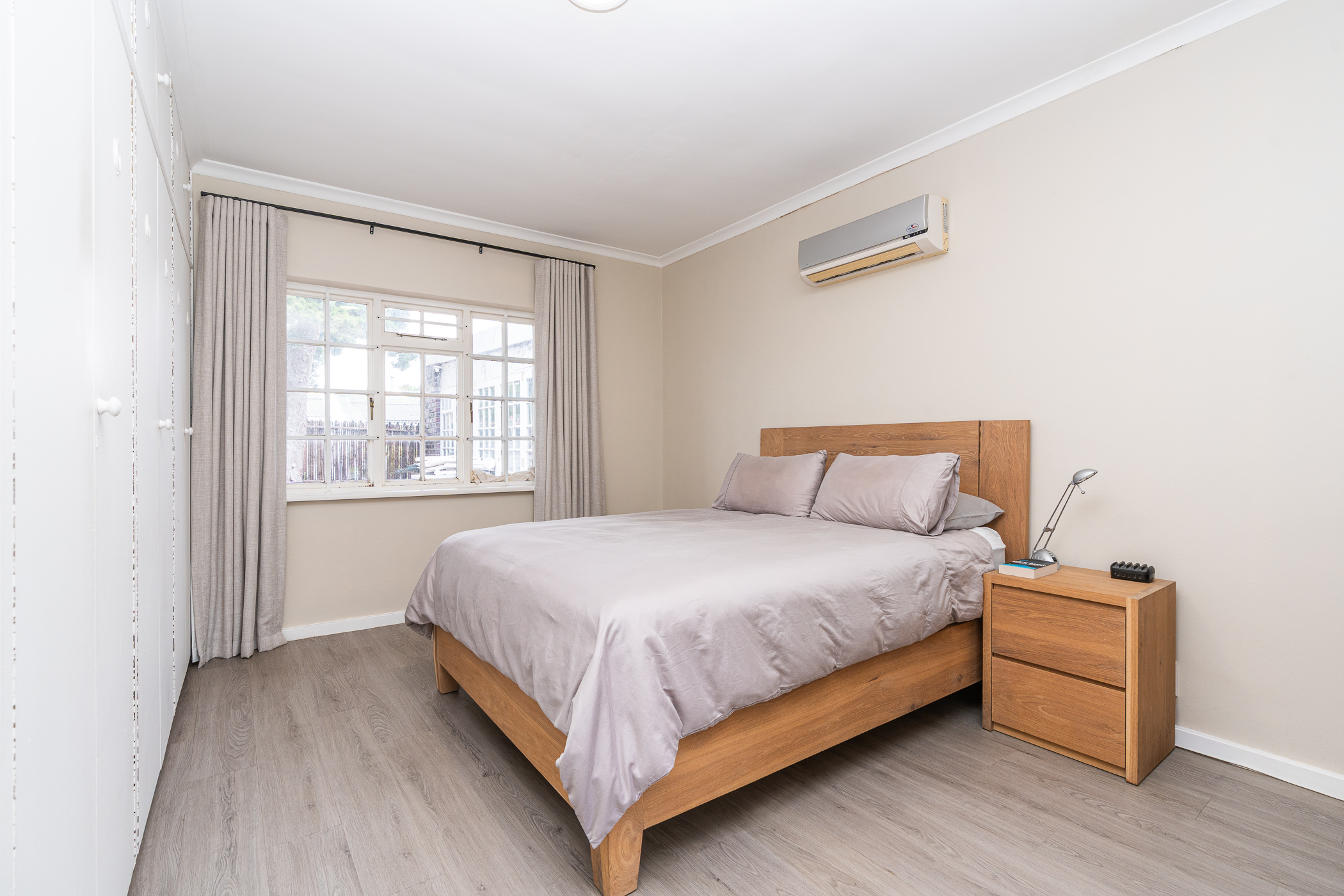 In 1976, its first owner, a dentist by profession, designed and built a unique concept on his large corner plot. One side of the property accommodated a complete 3 bedroom, 2 bathroom family home together with pool, private entertainment area and double garaging. The other side was devoted to his dental practice with an extra garage and triple tandem carport for good measure, plus domestic accommodation. The style of the home has the low-slung, sleek look of the 70’s with it’s Mazista slate roof, plum facebrick low-maintenance exterior and white wooden windows.