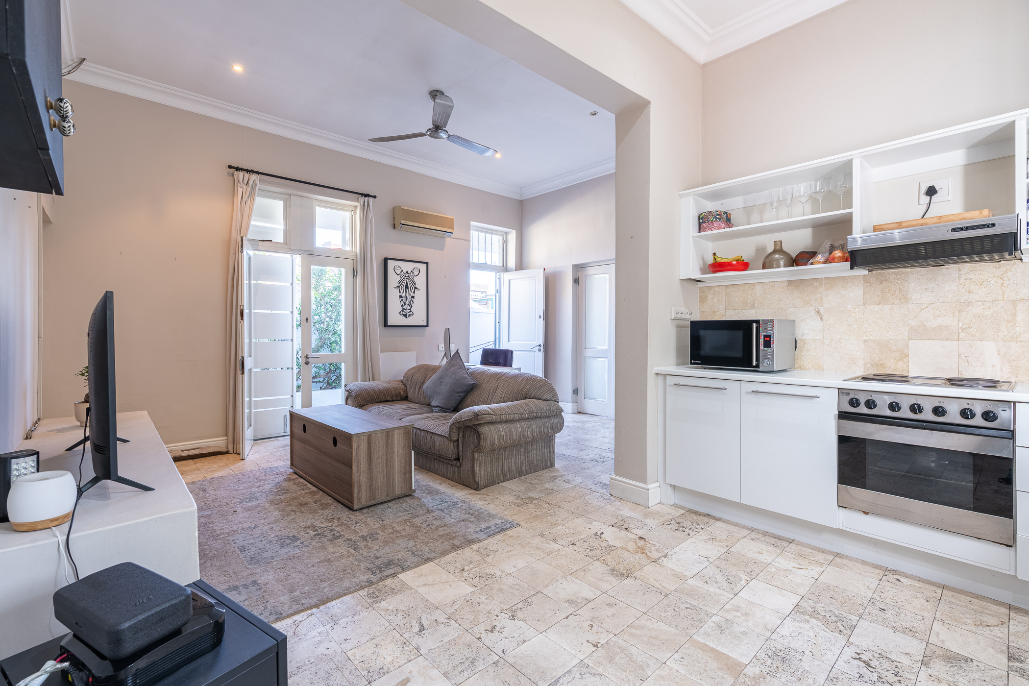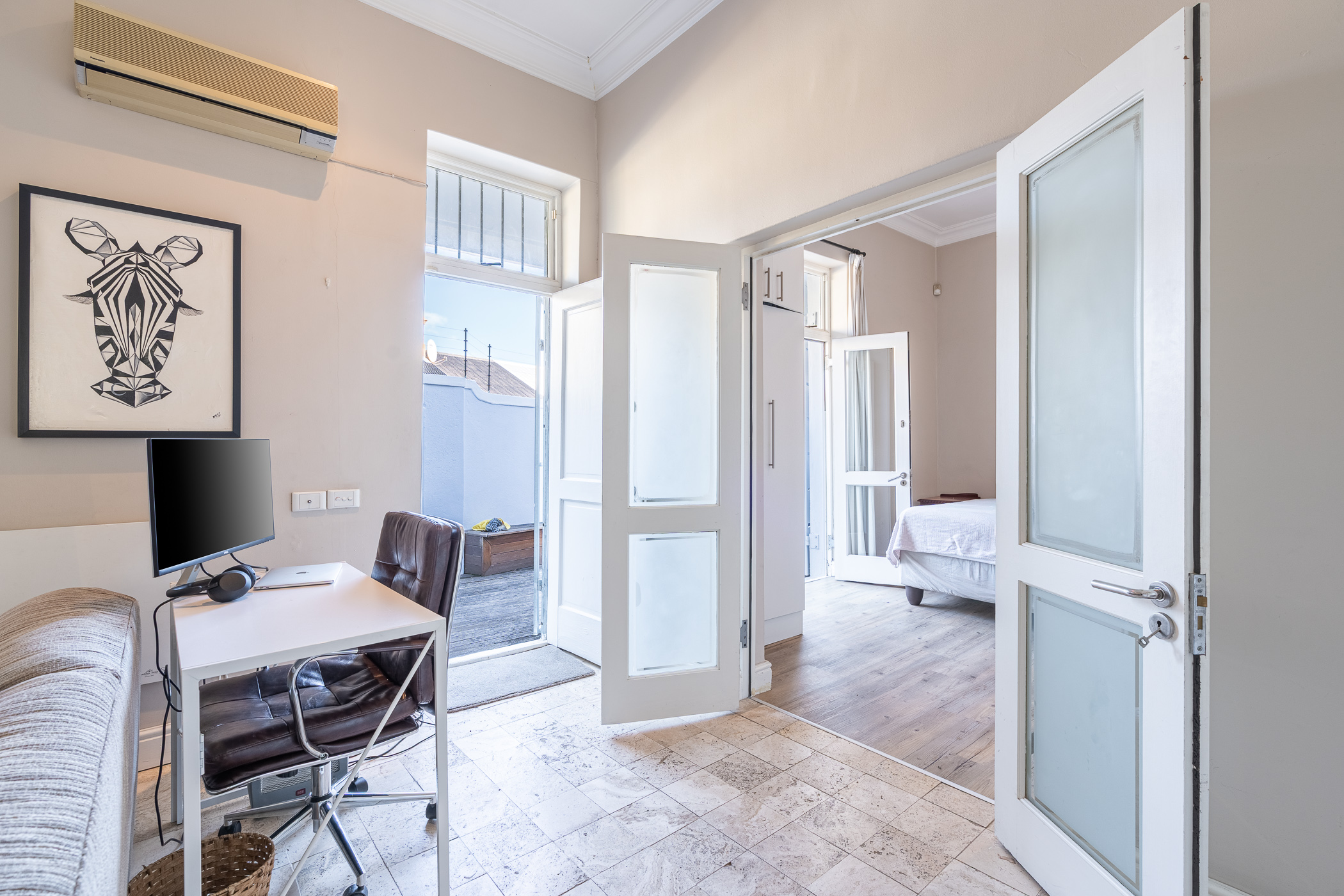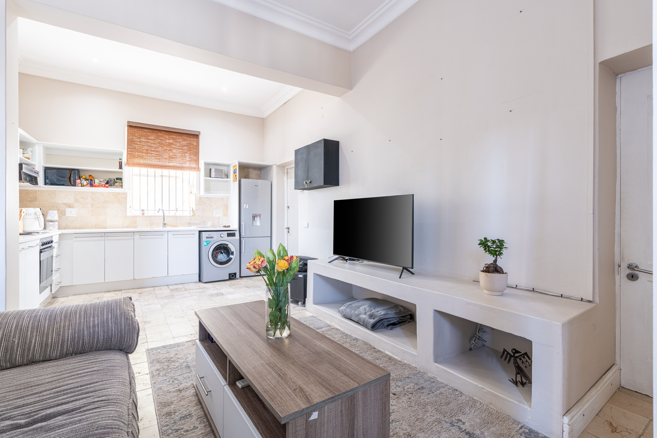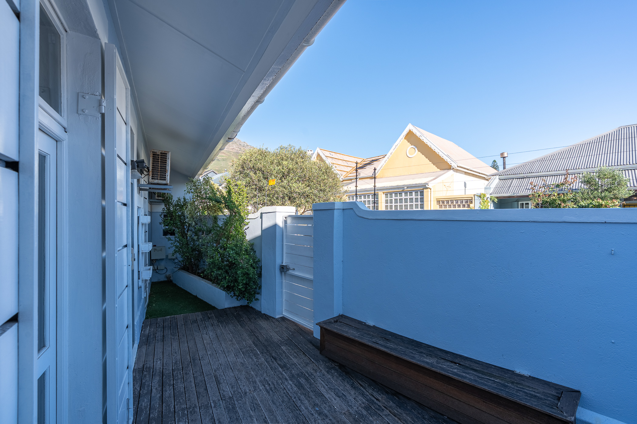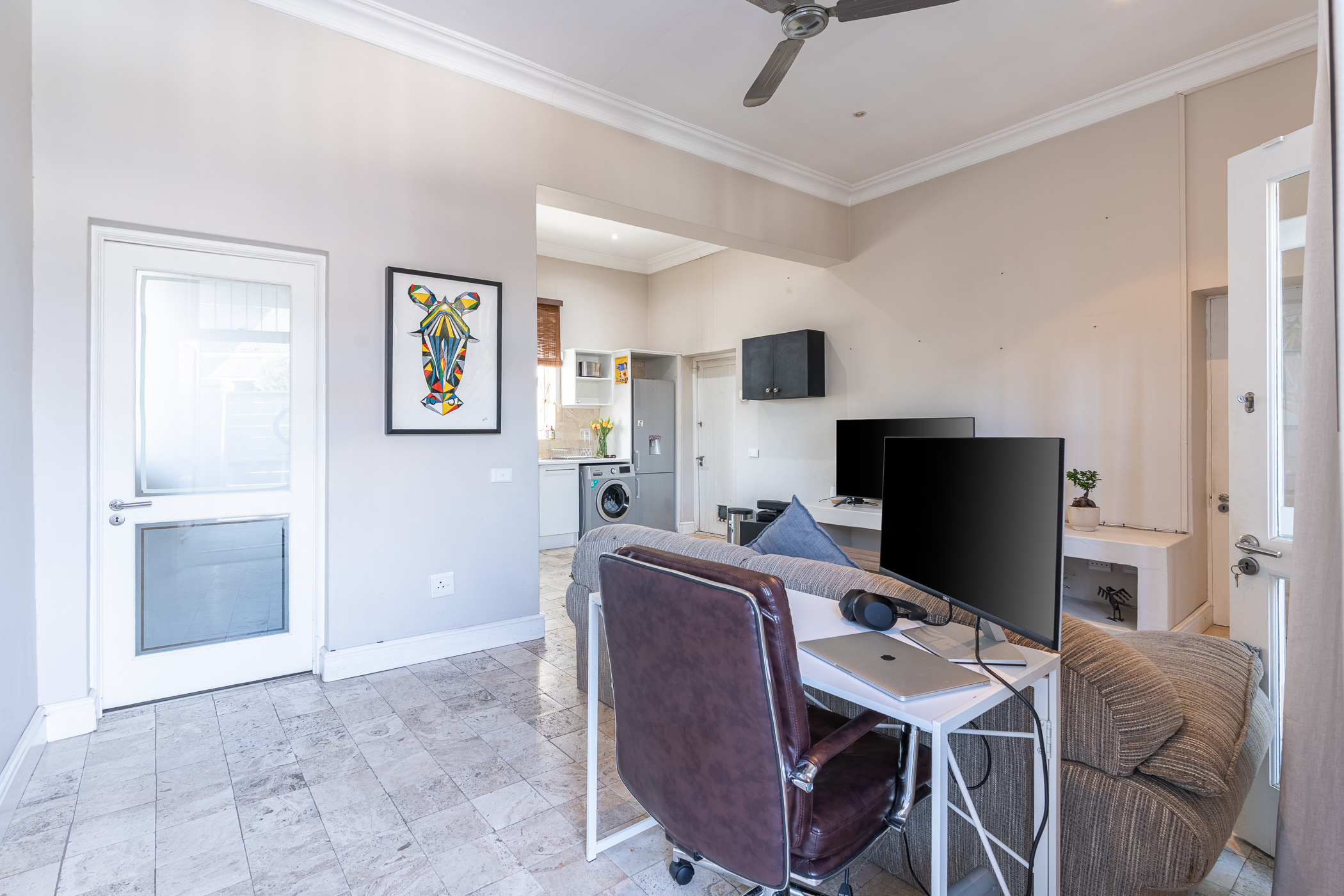 Ideal for both relaxed living and smart investing, the property also includes a separate study – a bright and quiet space ideal for remote work or creative projects. The kitchen and living area are anchored by ample built-in cupboards and working surfaces, making everyday life feel effortlessly organised. Step outside into the private courtyard where a built-in braai and timber decking set the stage for easy outdoor entertaining or peaceful morning coffees.