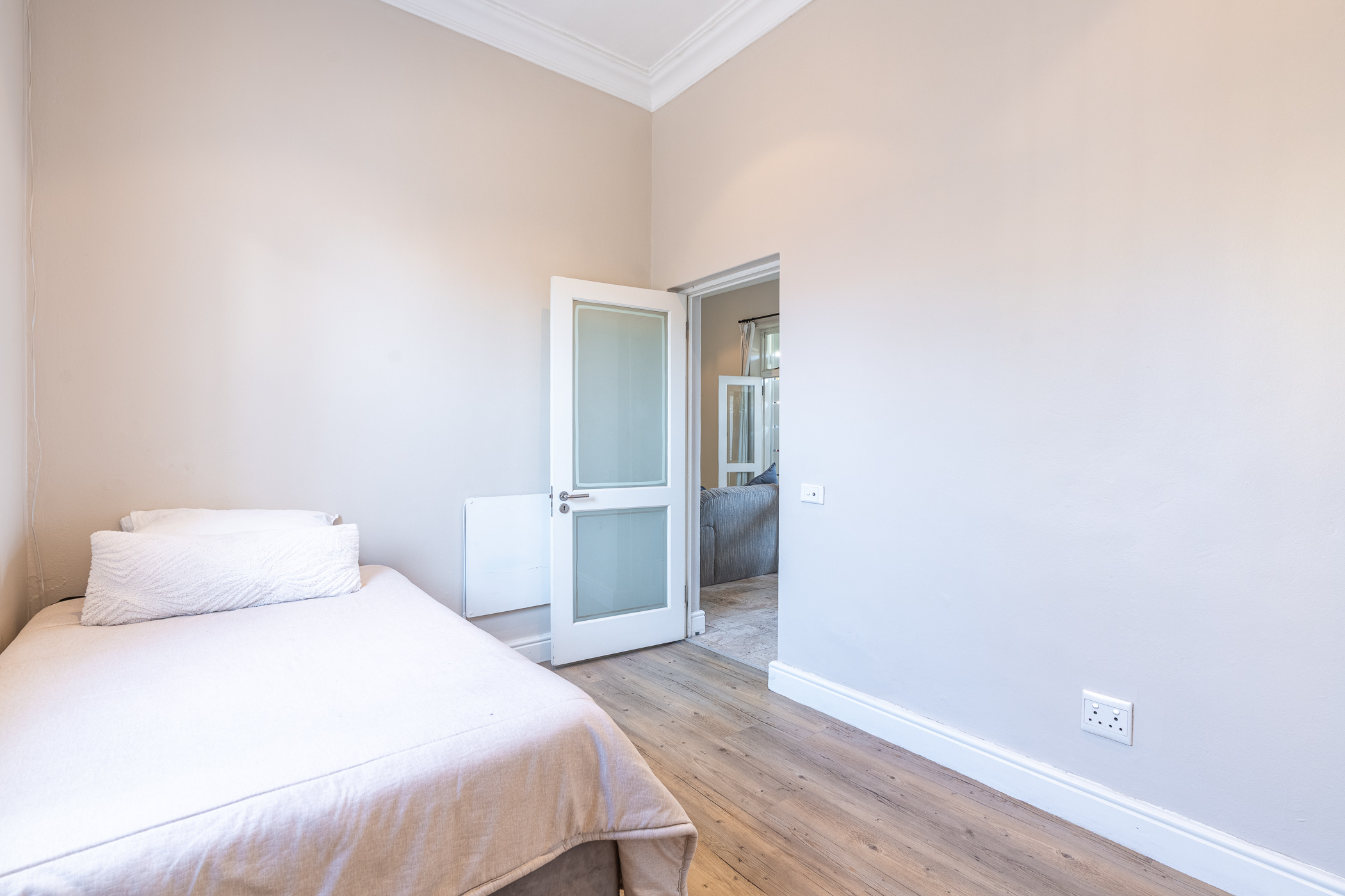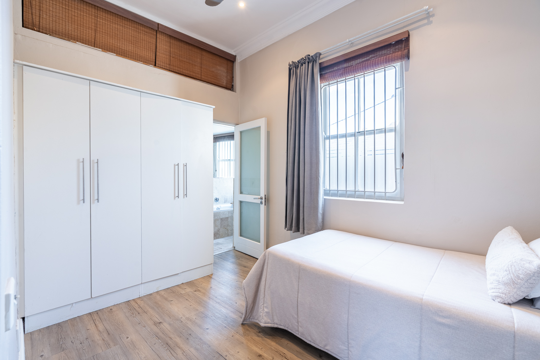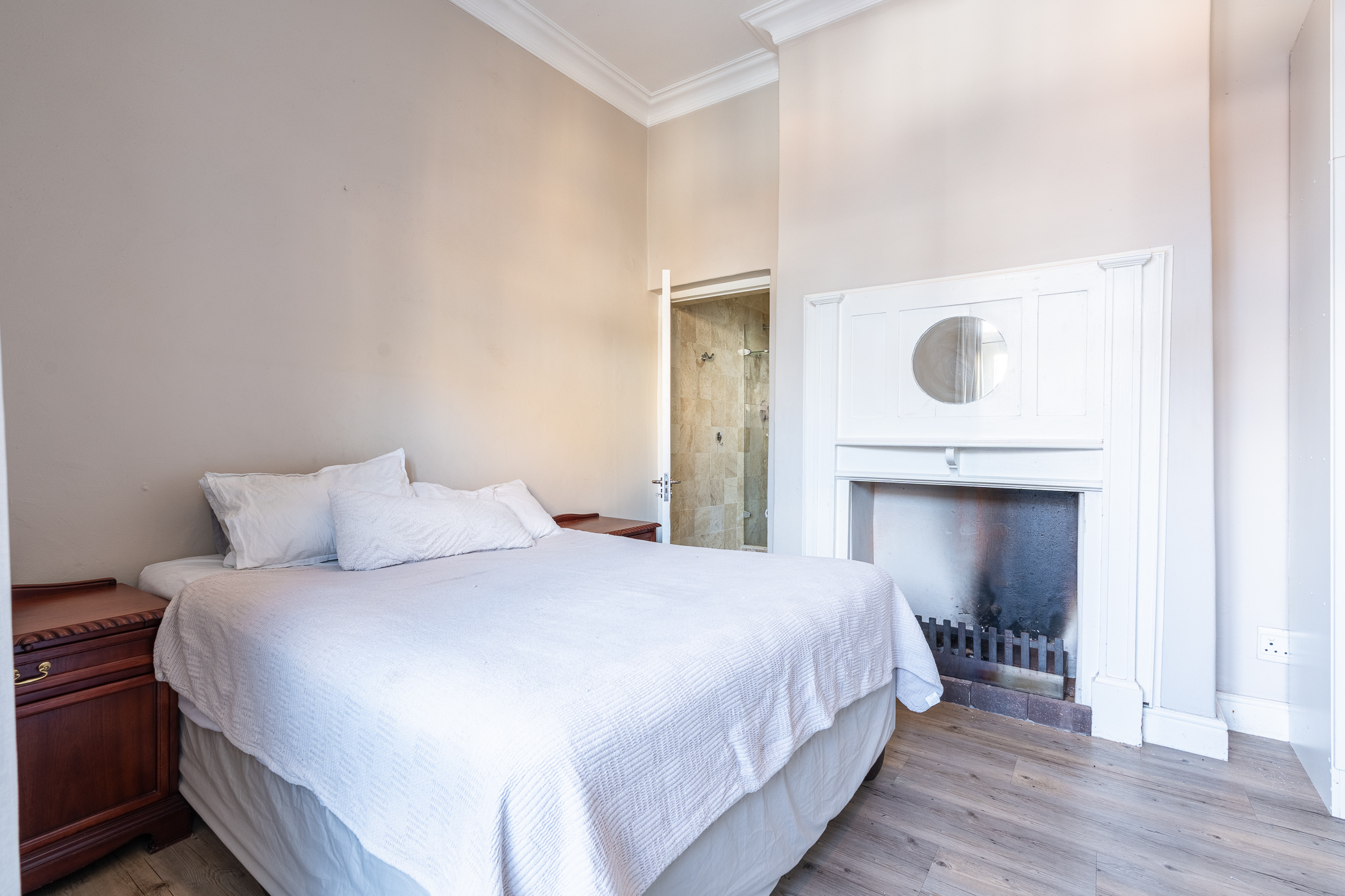 Brand new Illuminate release. Tucked into a quiet corner of Woodstock, this charming blue home immediately captures the heart. With its clean lines, welcoming facade and picture-perfect position against the mountain backdrop, 6 Dundonald Place is a rare blend of character and comfort. Inside, the home unfolds with thoughtful flow: an open-plan layout dressed in natural travertine tiles leads seamlessly through the living and dining spaces, creating a warm and inviting atmosphere. The main bedroom features a working fireplace, offering the perfect setting for cozy winter evenings, while each of the two bedrooms boasts its own en-suite bathroom — a touch of privacy and practicality that sets this home apart.