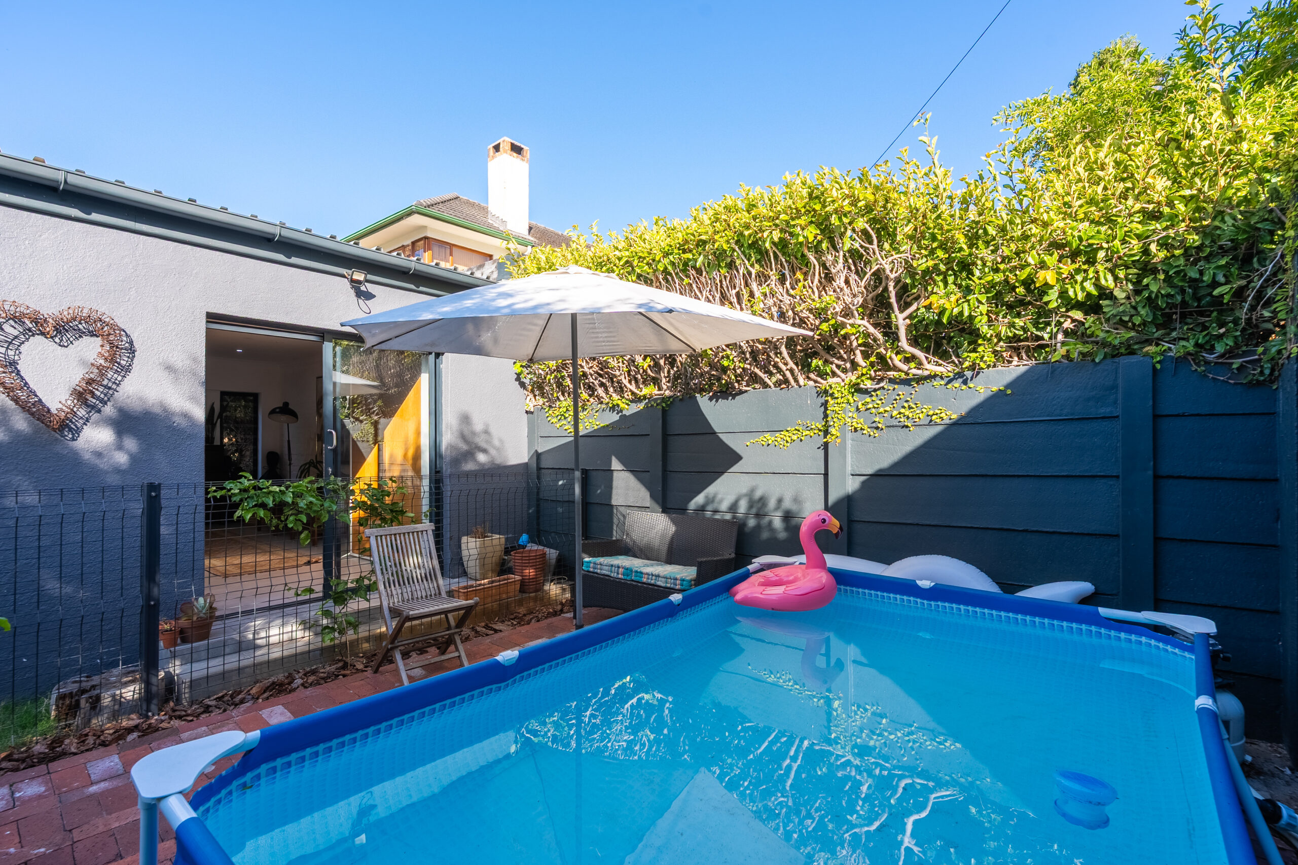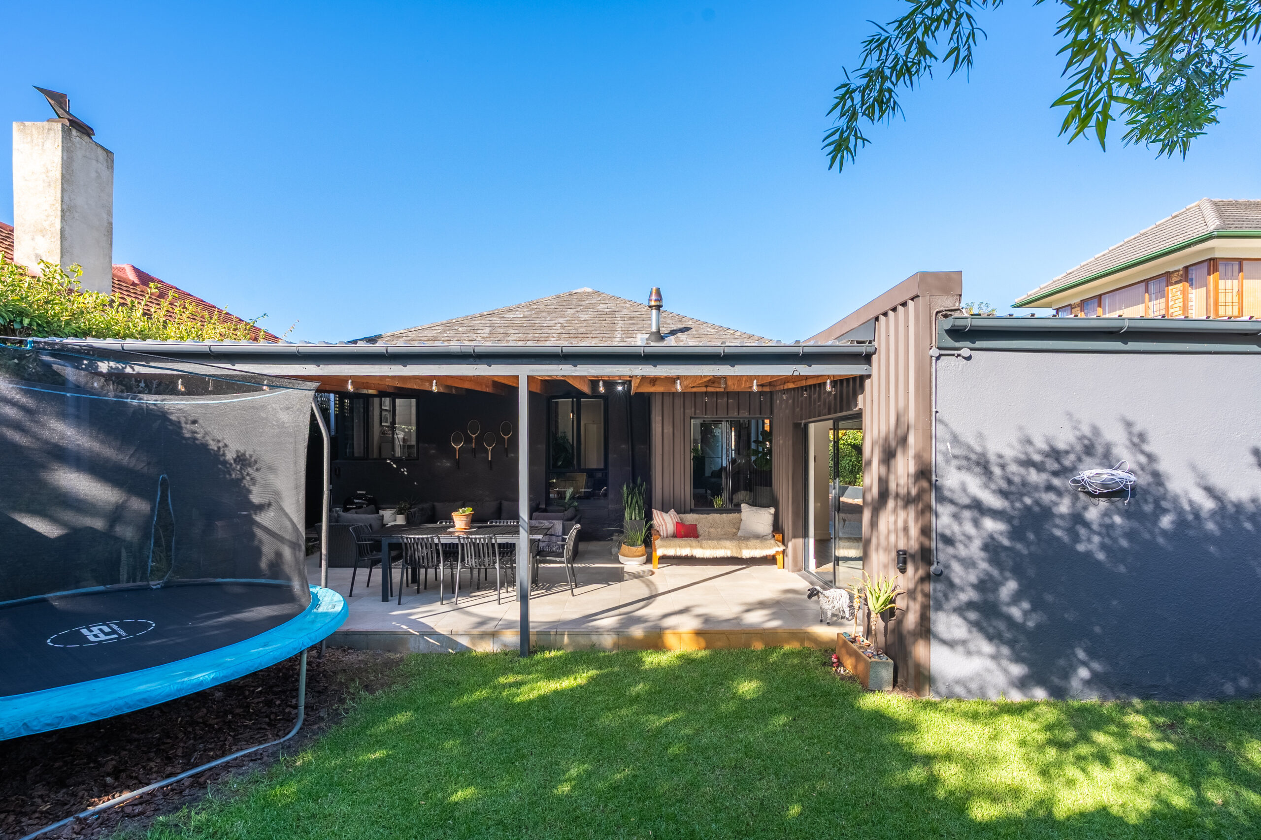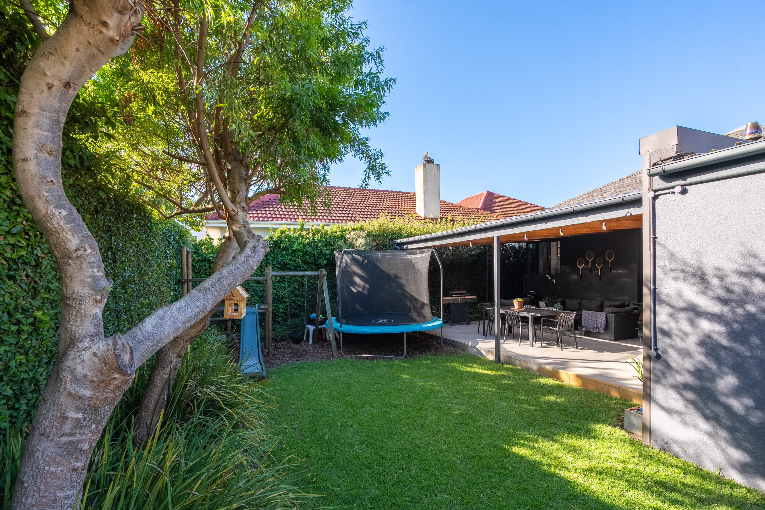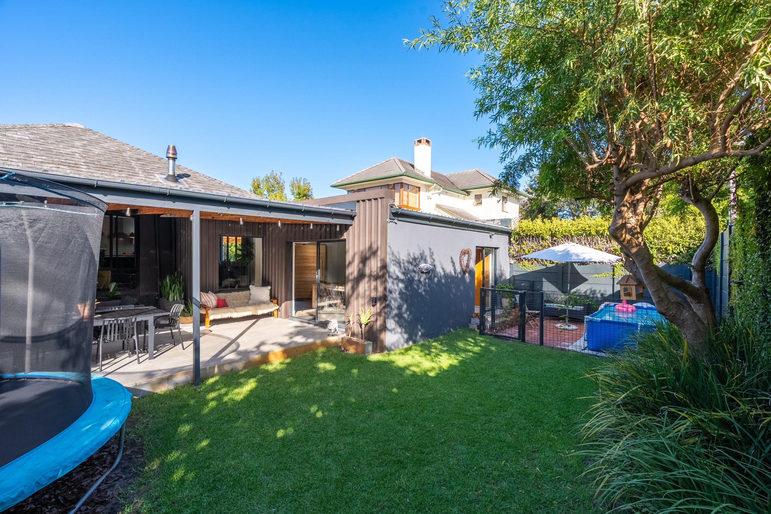 The family favourite of this home is the palatial undercover patio that looks onto the manageable back garden. Being waterproof, you can enjoy it year-round and is large enough to host a big family/friend gathering. The fairy lights and evening sunrays make this the ideal spot to enjoy sundowners or a good book. There is a sweet jungle gym in one corner of the garden and an enclosed area on the other side where the current family has installed a temporary swimming pool. Aluminium doors and windows, and excellent security throughout. Garden shed, well point, and irrigation.