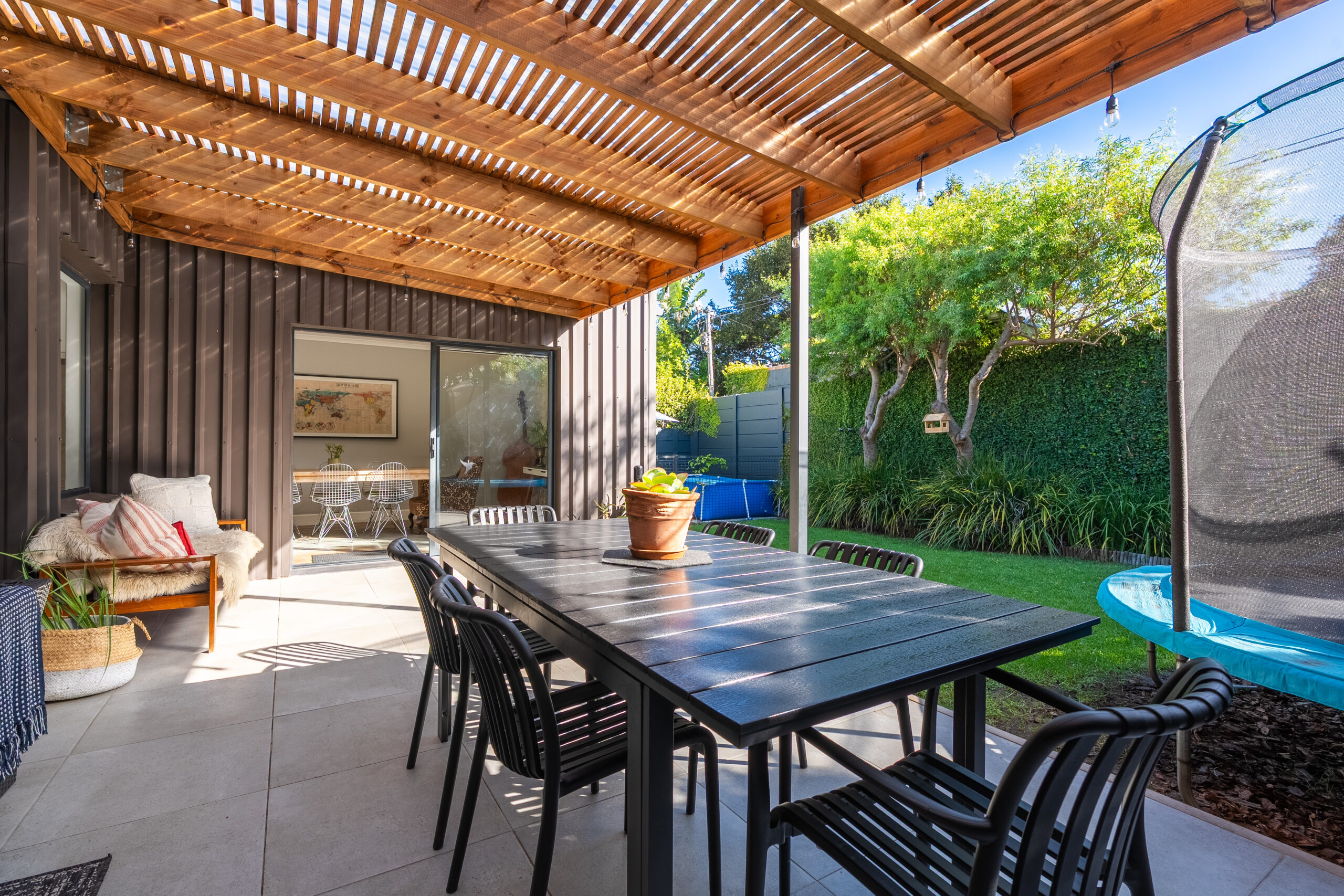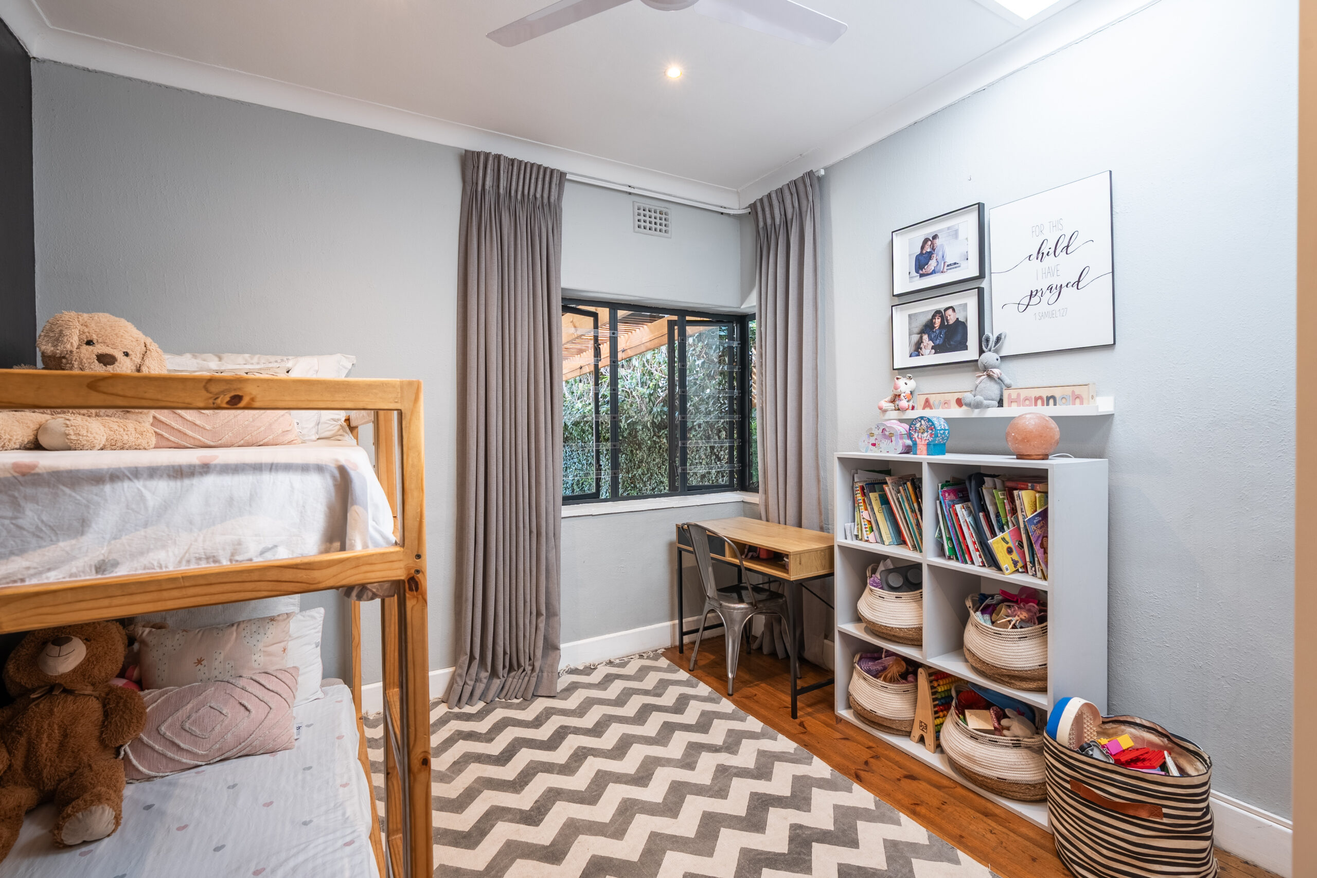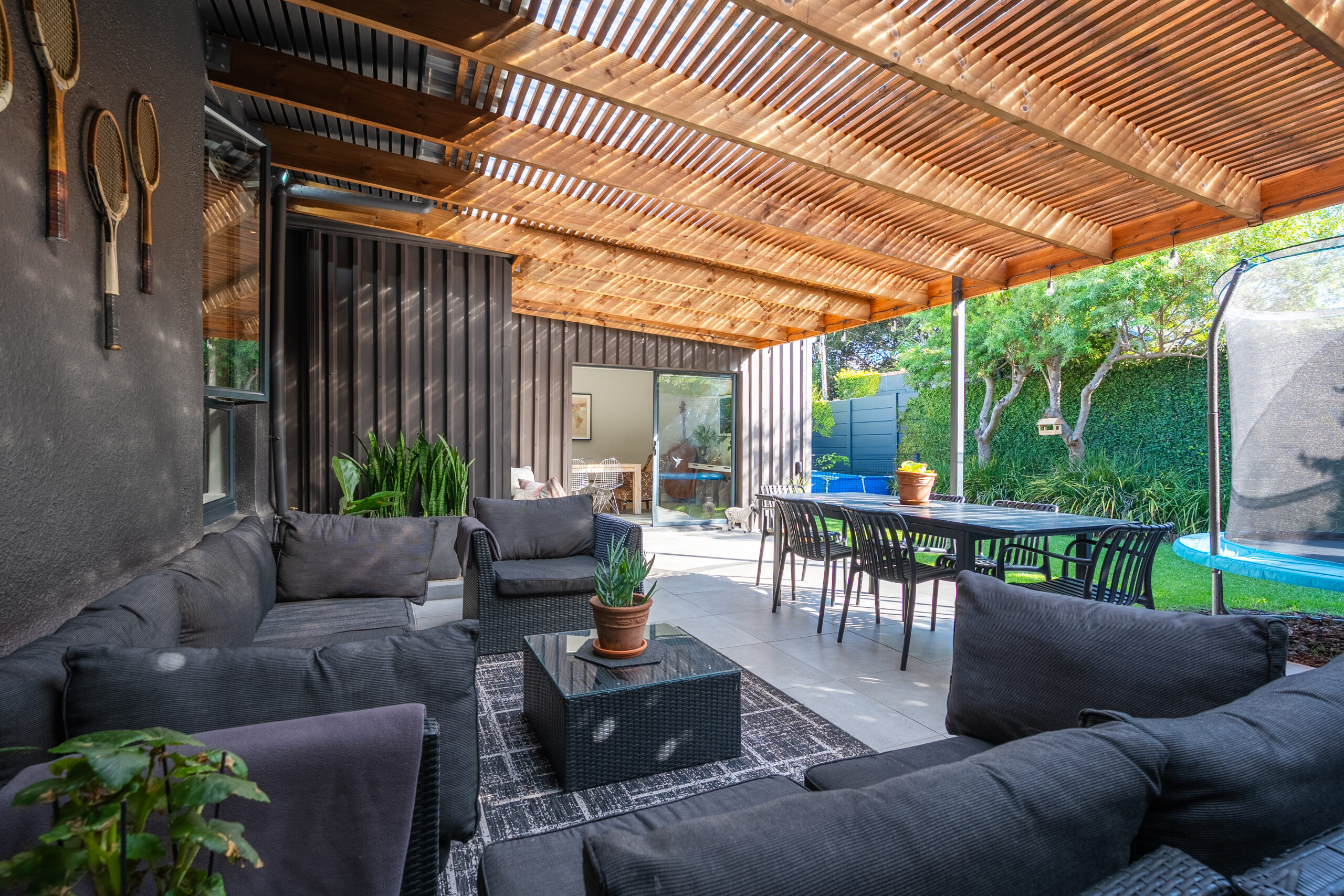 The family favourite of this home is the palatial undercover patio that looks onto the manageable back garden. Being waterproof, you can enjoy it year-round and is large enough to host a big family/friend gathering. The fairy lights and evening sunrays make this the ideal spot to enjoy sundowners or a good book. There is a sweet jungle gym in one corner of the garden and an enclosed area on the other side where the current family has installed a temporary swimming pool. Aluminium doors and windows, and excellent security throughout. Garden shed, well point, and irrigation.