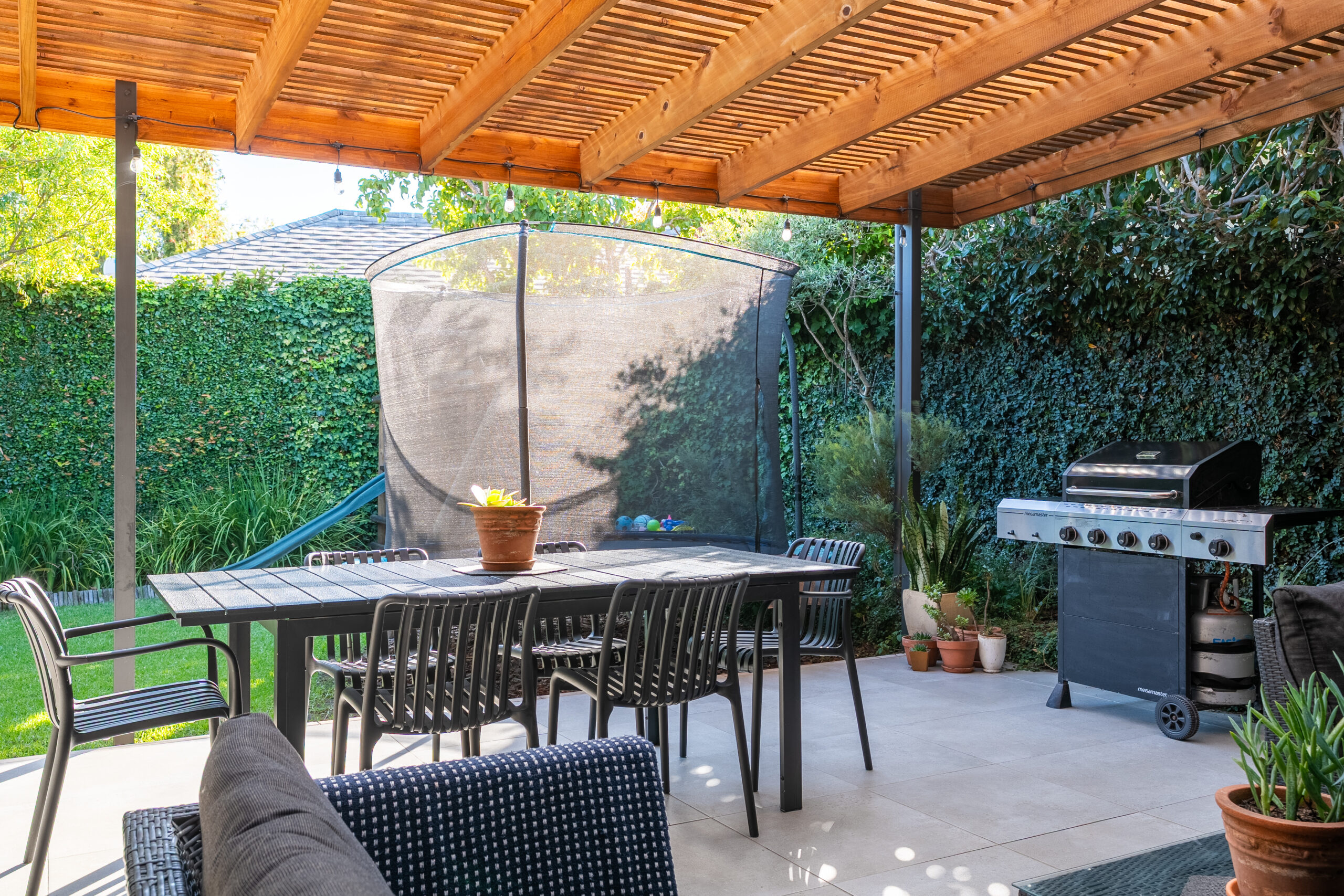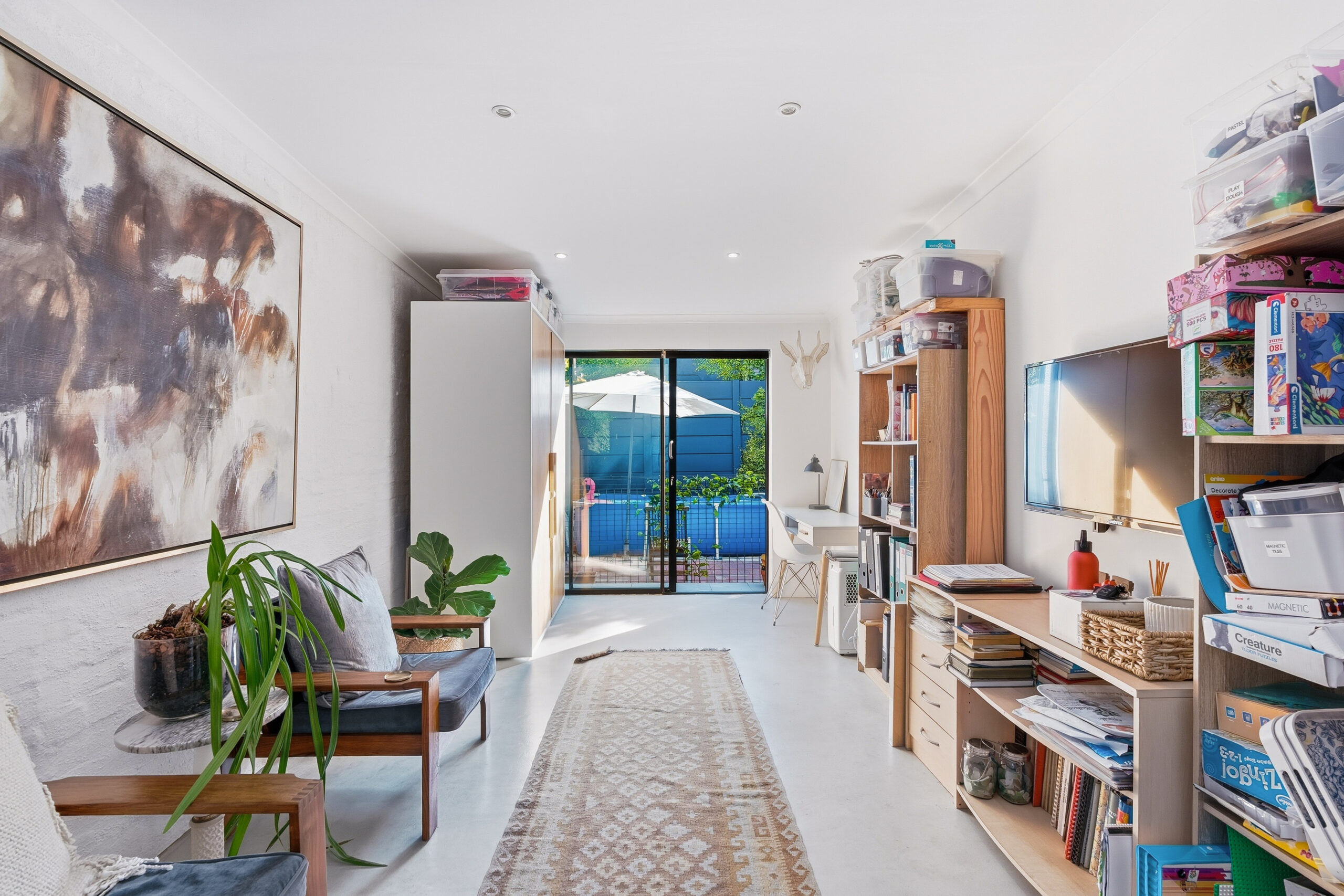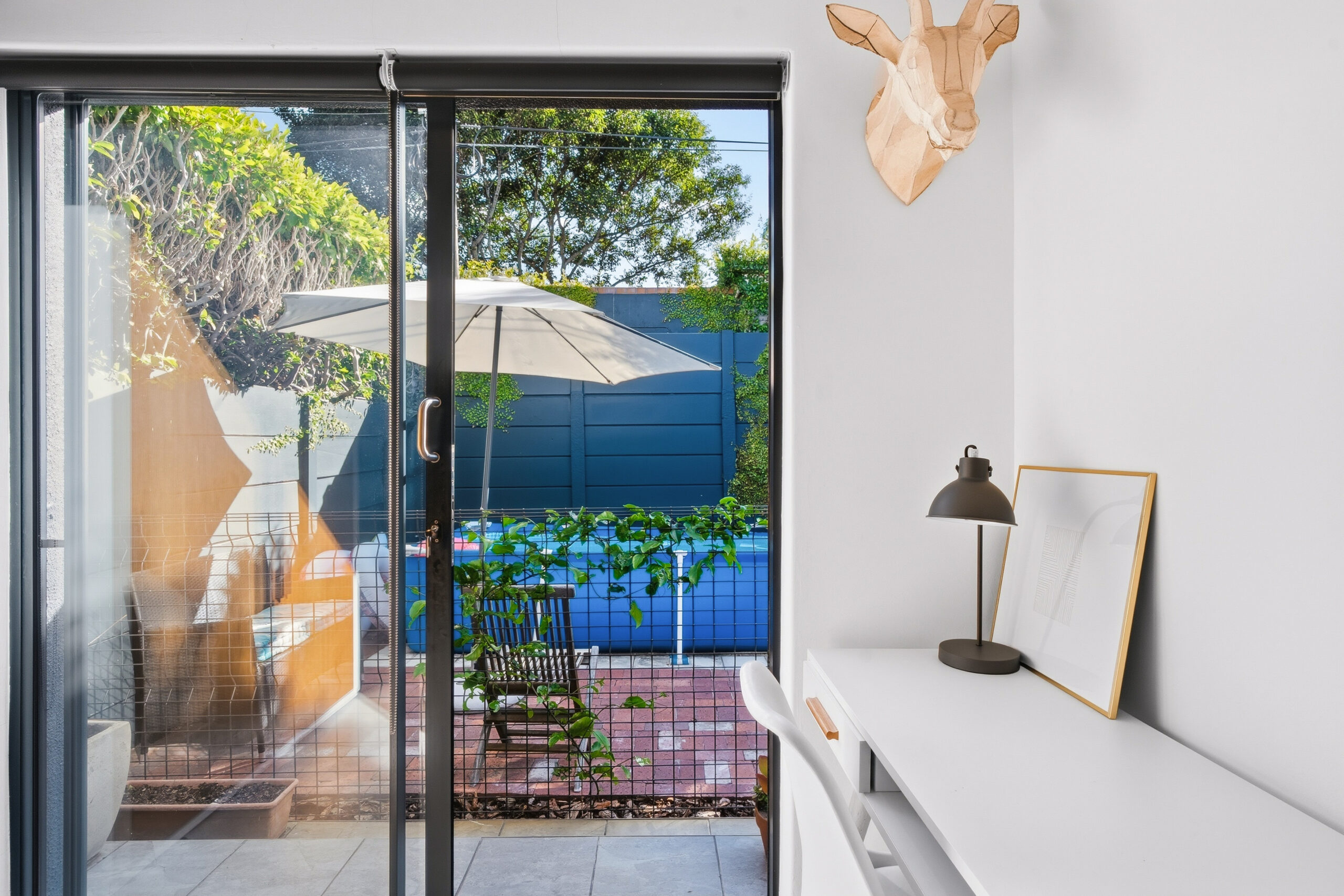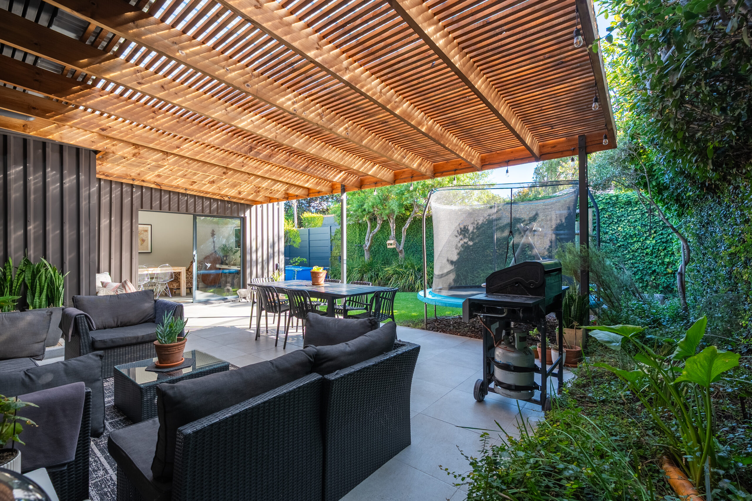 The family favourite of this home is the palatial undercover patio that looks onto the manageable back garden. Being waterproof, you can enjoy it year-round and is large enough to host a big family/friend gathering. The fairy lights and evening sunrays make this the ideal spot to enjoy sundowners or a good book. There is a sweet jungle gym in one corner of the garden and an enclosed area on the other side where the current family has installed a temporary swimming pool. Aluminium doors and windows, and excellent security throughout. Garden shed, well point, and irrigation.