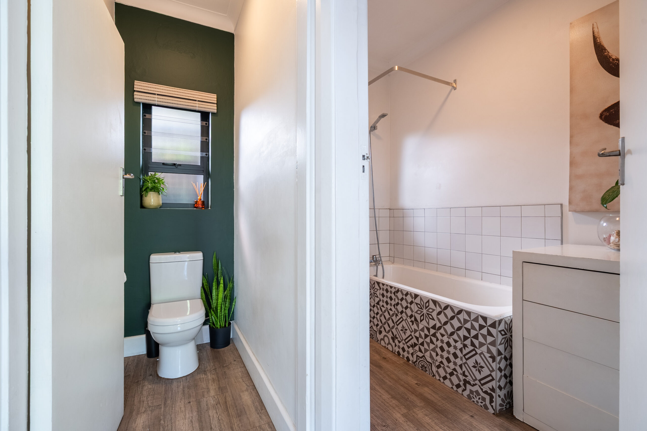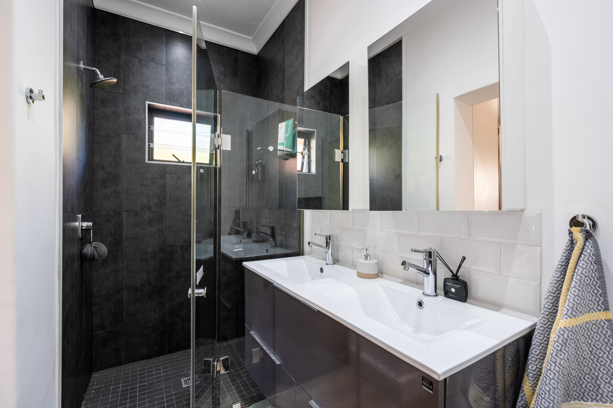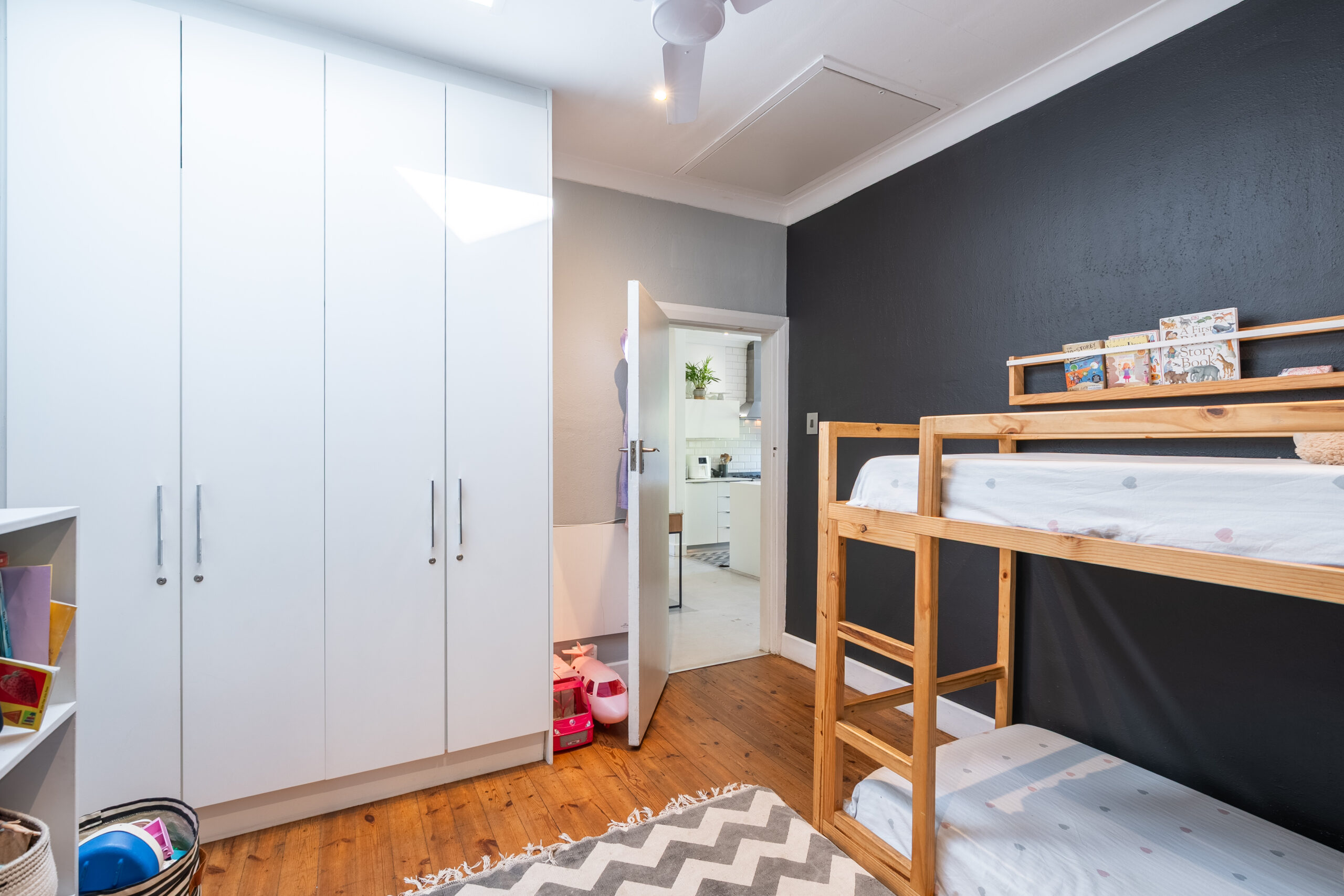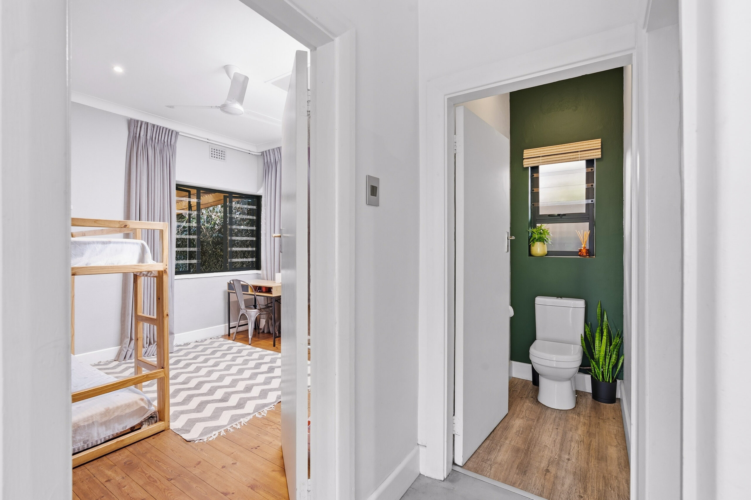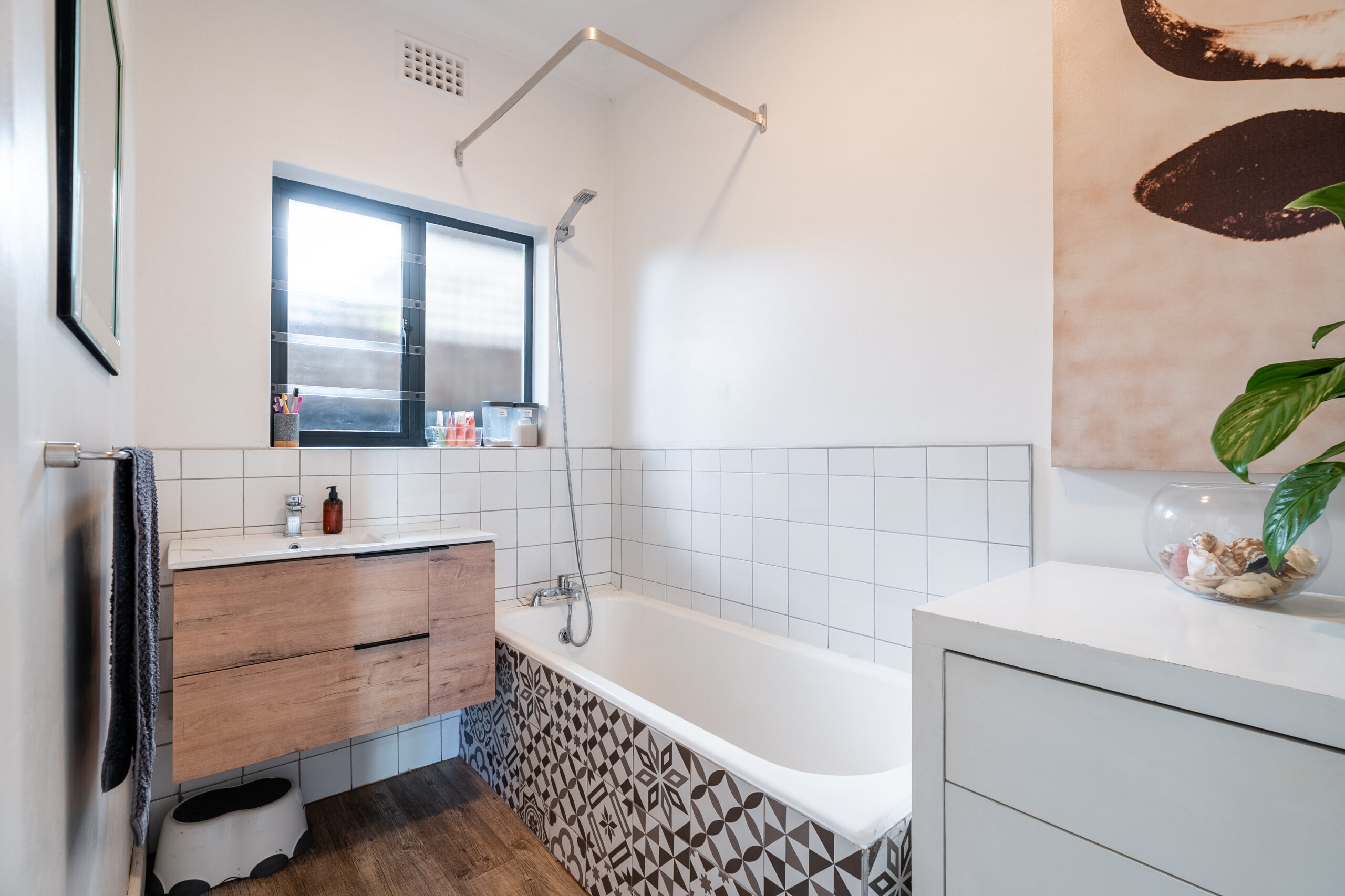 There are 3 large bedrooms – all with built in cupboards, high ceilings and plenty of natural light. The guest bedrooms have ceiling fans, while the main bedroom enjoys an aircon. The main bedroom has plenty of built-in cupboards and an ensuite bathroom with shower and double vanity. As a bonus, there is some loft storage (via a retractable ladder) in the ceiling of one of the guest bedrooms. The guest loo is separate from the family bathroom which houses a modern vanity and shower over bath. Linen cupboards in the hallway.