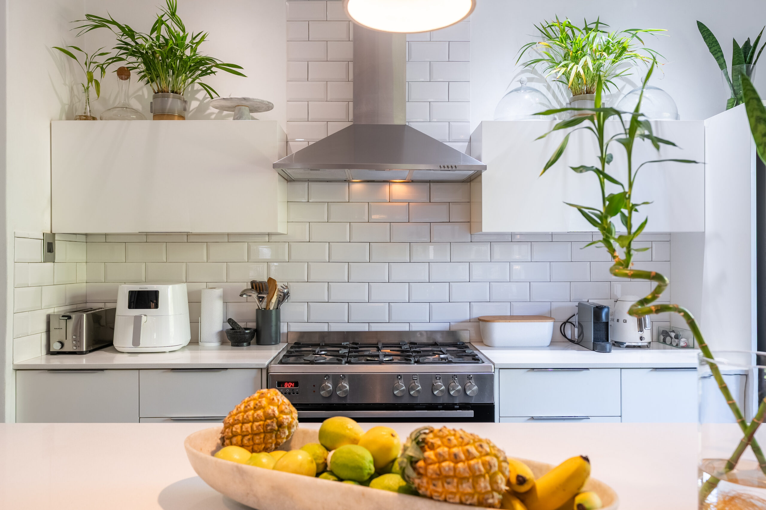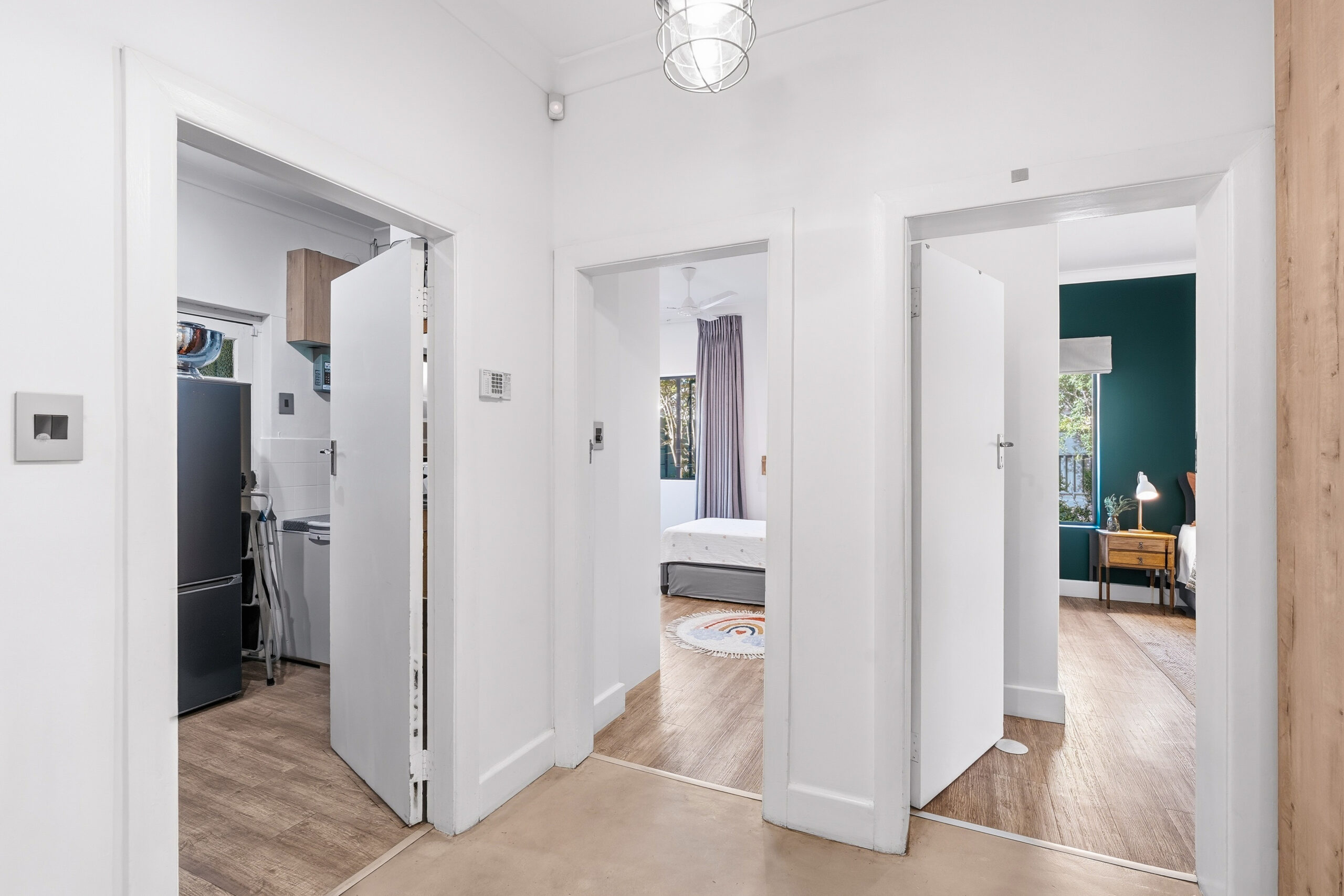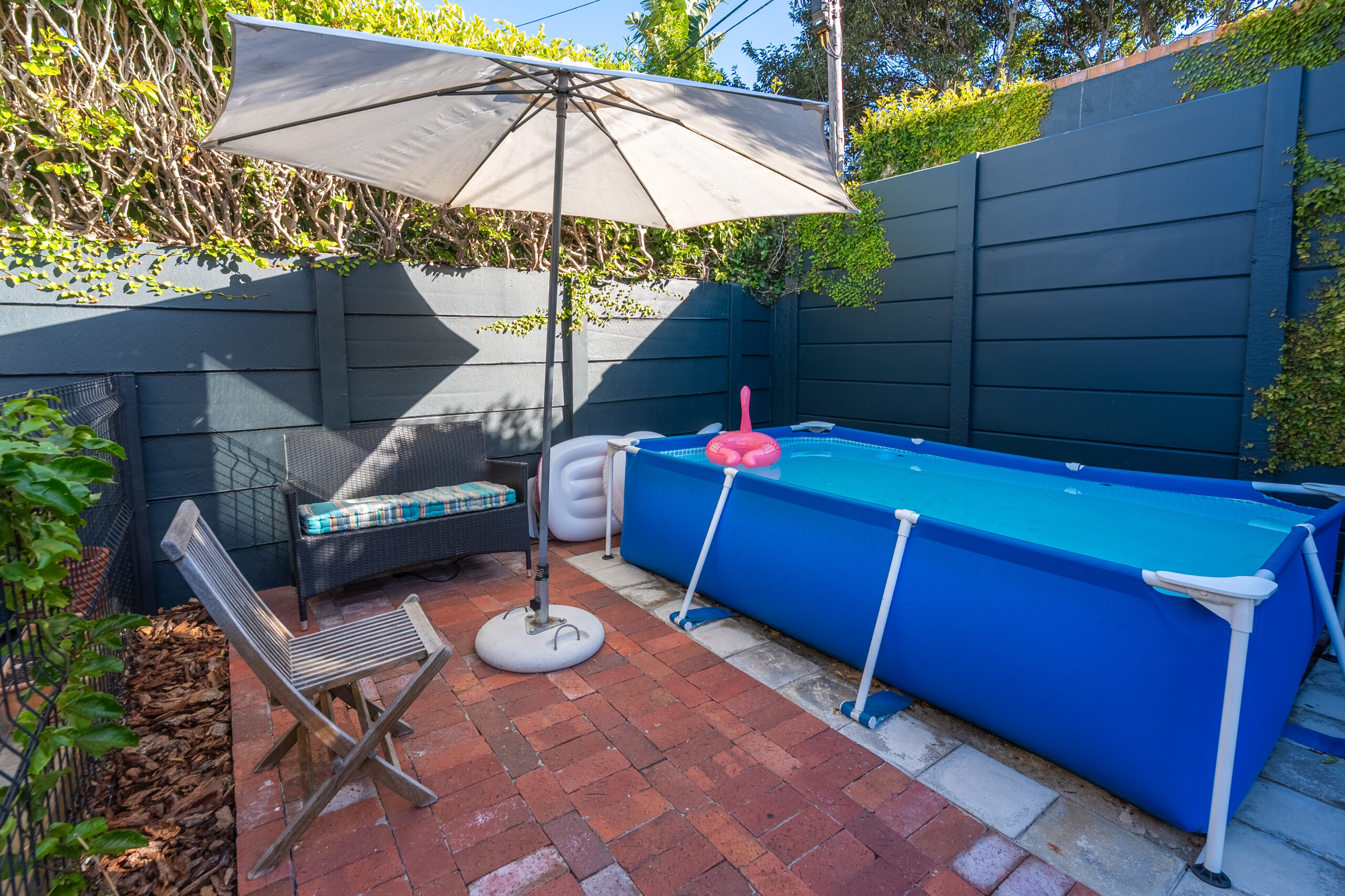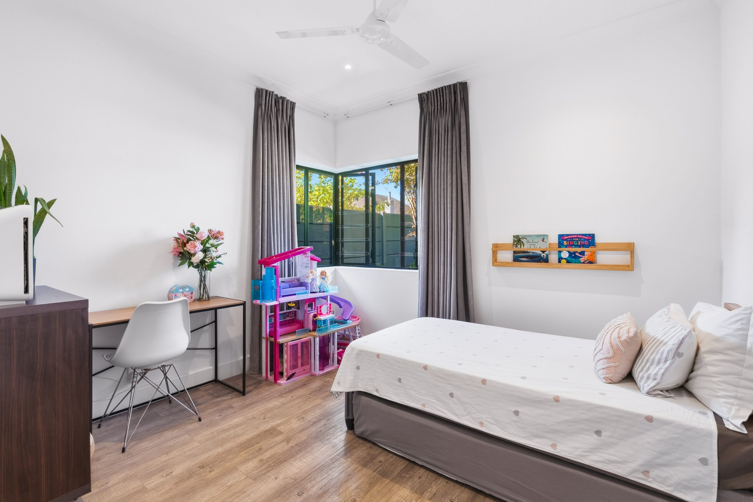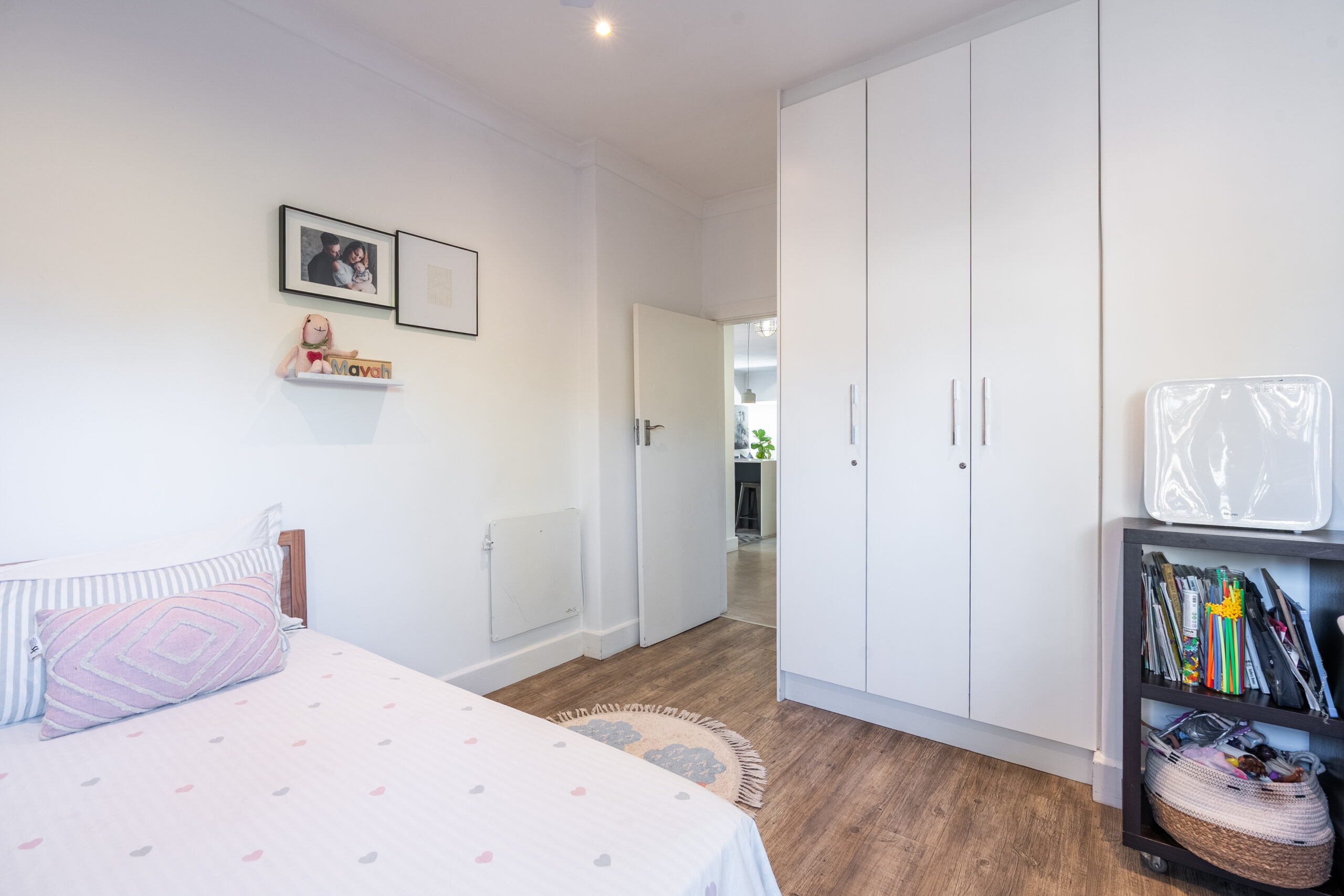 There are 3 large bedrooms – all with built in cupboards, high ceilings and plenty of natural light. The guest bedrooms have ceiling fans, while the main bedroom enjoys an aircon. The main bedroom has plenty of built-in cupboards and an ensuite bathroom with shower and double vanity. As a bonus, there is some loft storage (via a retractable ladder) in the ceiling of one of the guest bedrooms. The guest loo is separate from the family bathroom which houses a modern vanity and shower over bath. Linen cupboards in the hallway.