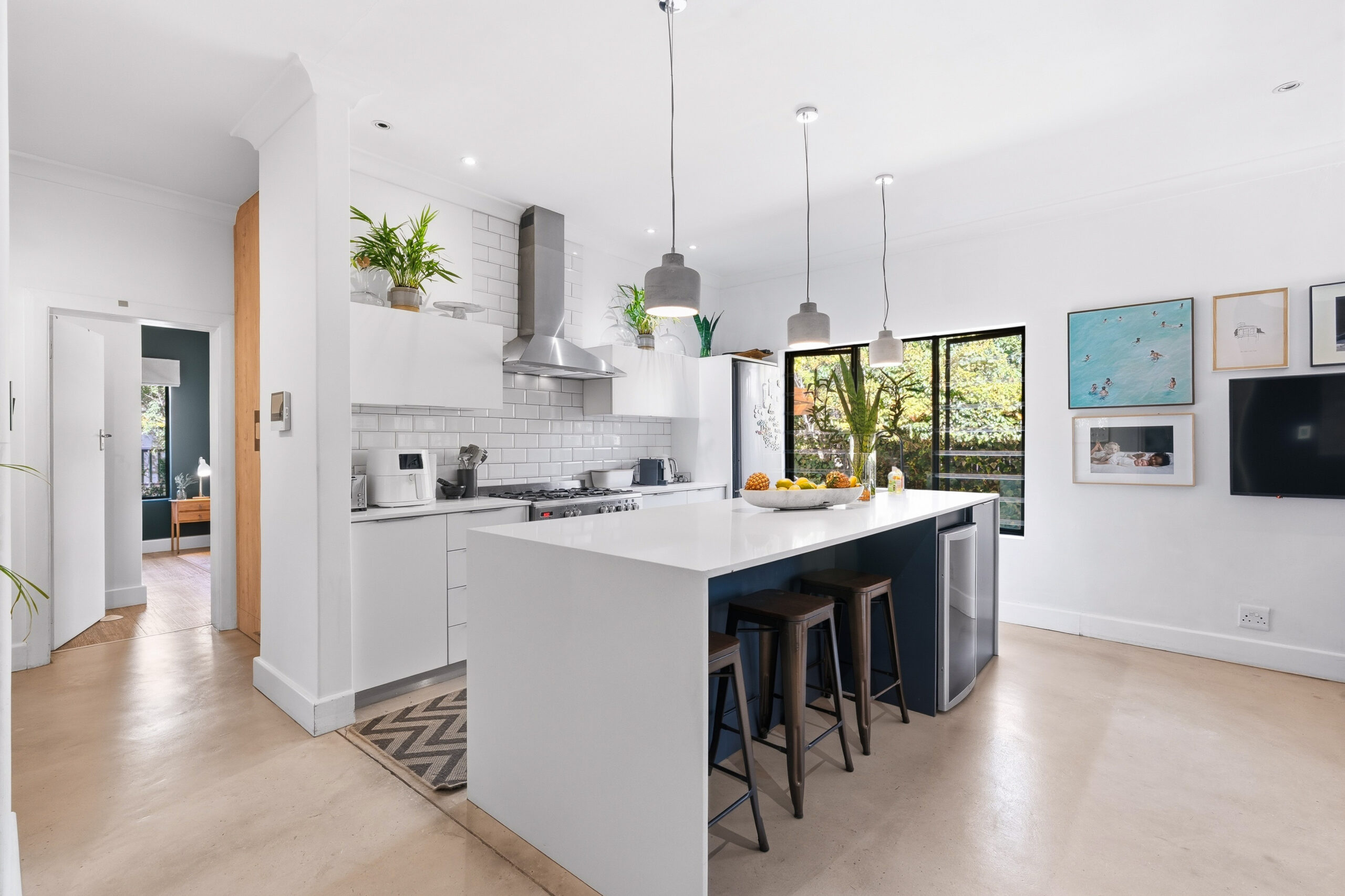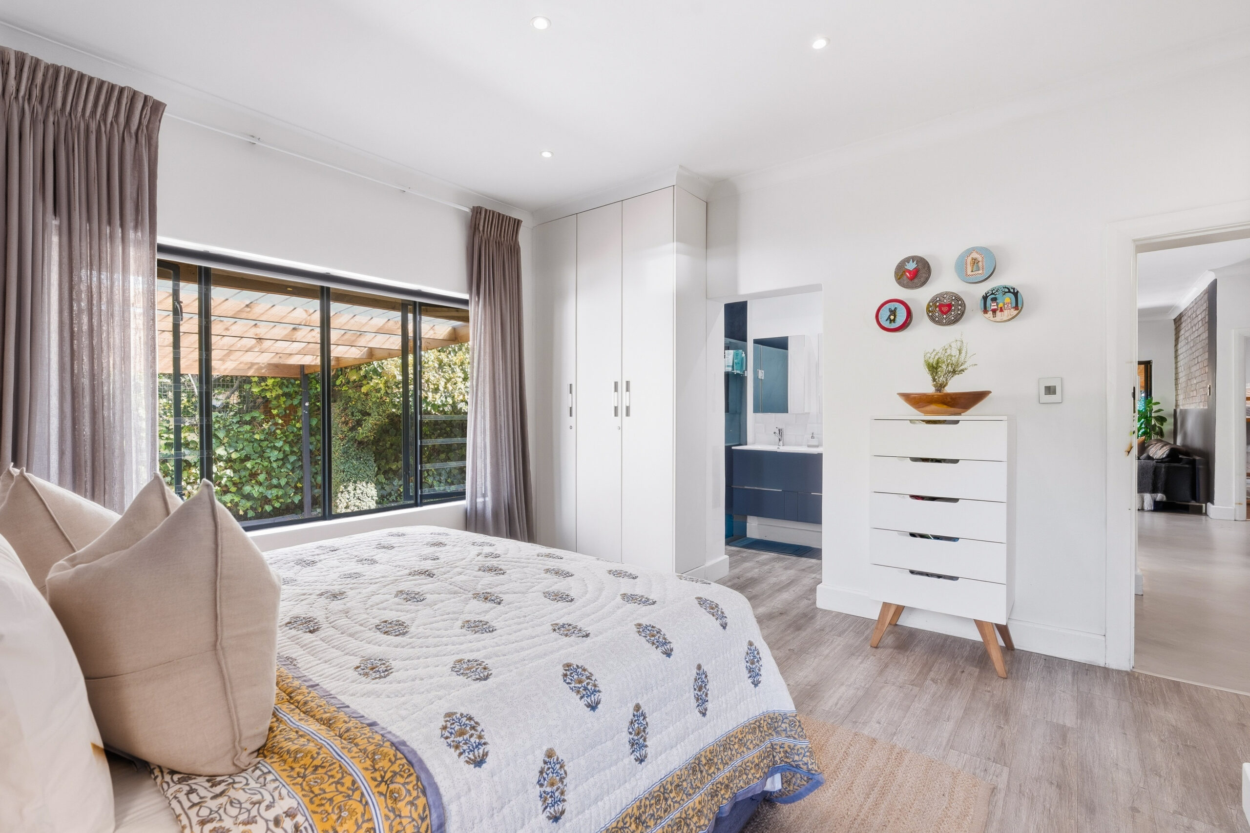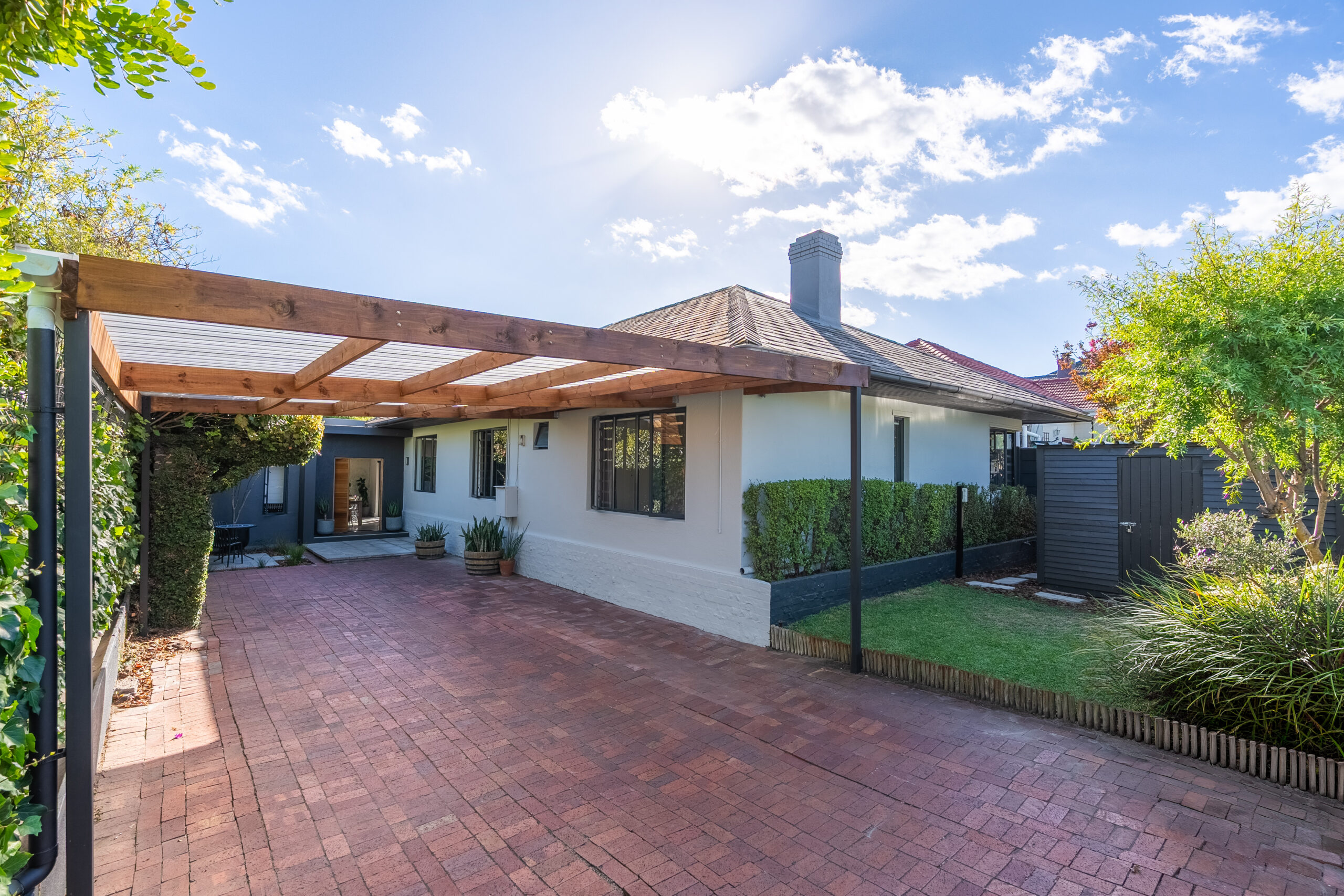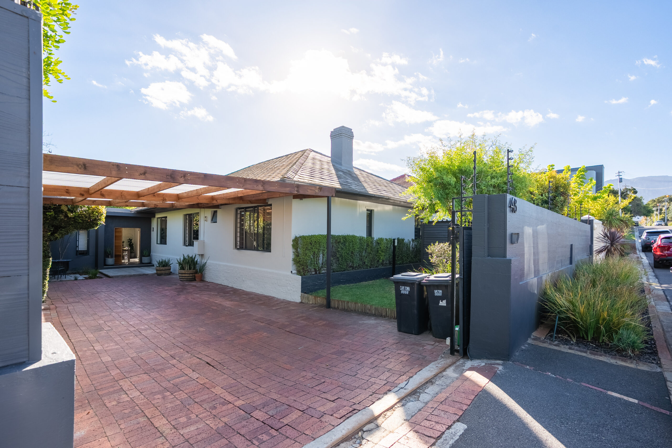 This absolutely stunning, single storey, spacious home on 496 sqm showcases designer details from front to back. Extremely private and discreet from the road, the home unfolds as you explore it. A large driveway affords sheltered parking for two large cars with secure parking for another two. A grand front door welcomes guests who can either turn left into the large studio/4th bedroom, head straight into the dining area (with feature wall) which leads to the manicured back garden, or turn right to a landing that leads you into the open plan family room and exquisite, modern kitchen. We believe that the house was built in 1948, which aligns with the high ceilings and Oregon wooden floors. An iron-cast, wood-burning fireplace adds to the charm of the room…just imagine sitting in front of this toastie luxury when Cape Town’s winter arrives. The kitchen has a grand central island with bar stool seating on both sides, space for a wine cooler, and prep bowl. Suspended pendants above the island create soft mood lighting for evening dinners with friends. A separate scullery houses space for 3 washing appliances, an additional fridge/freezer, sink, and the 5kW back up inverter.