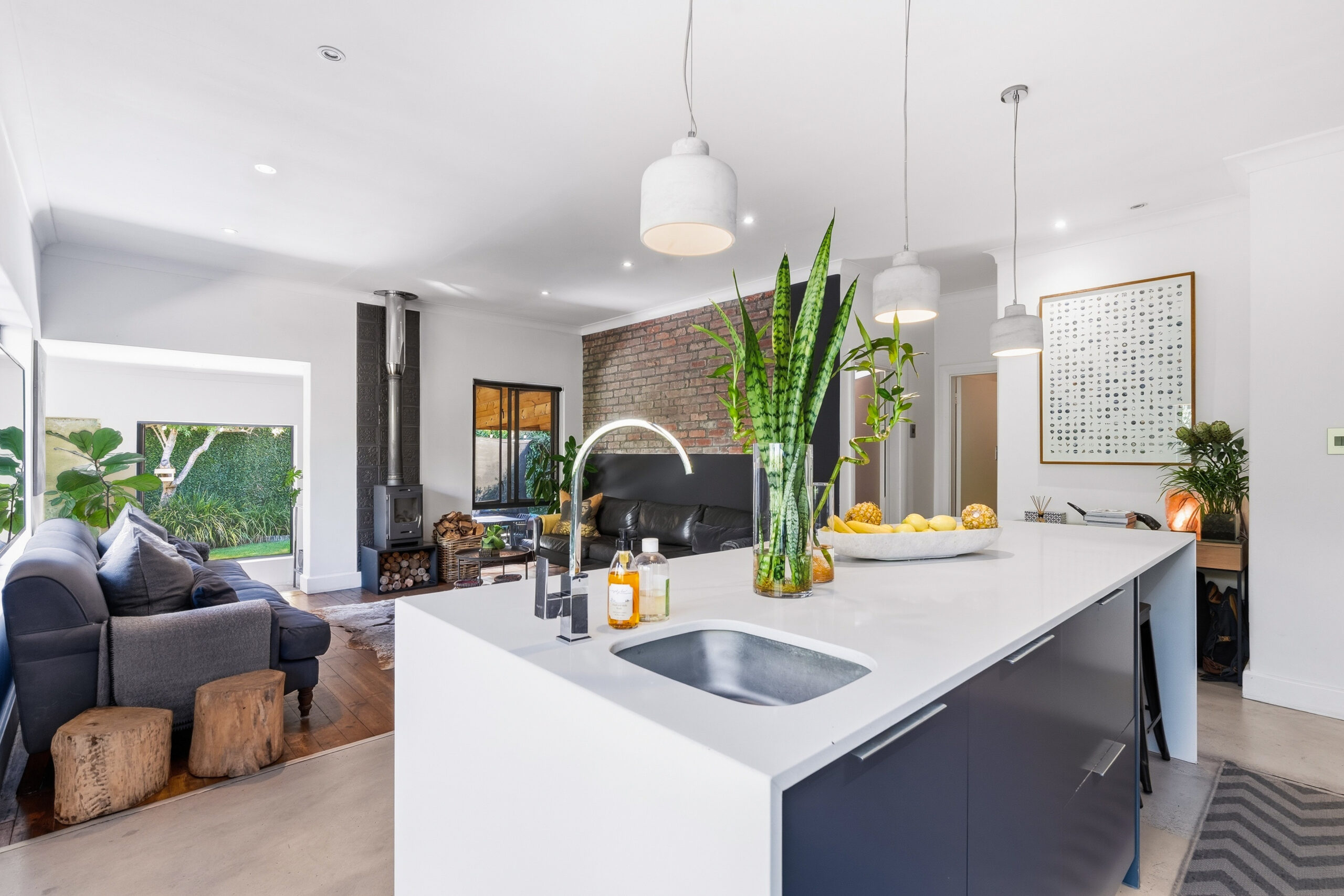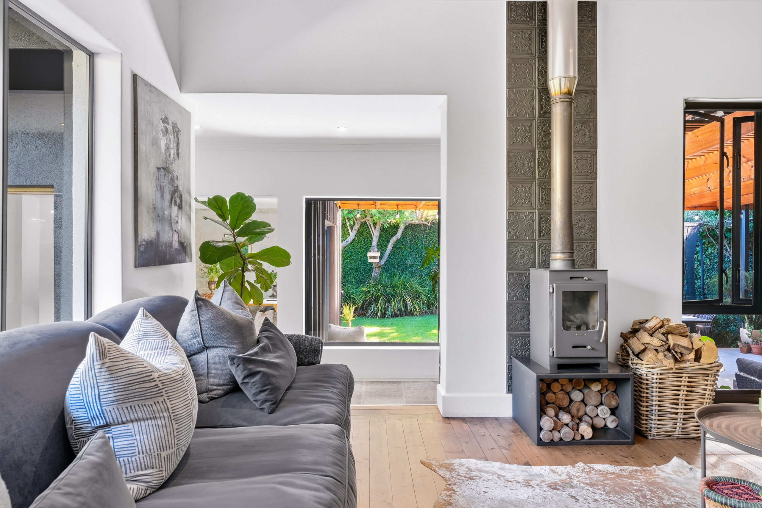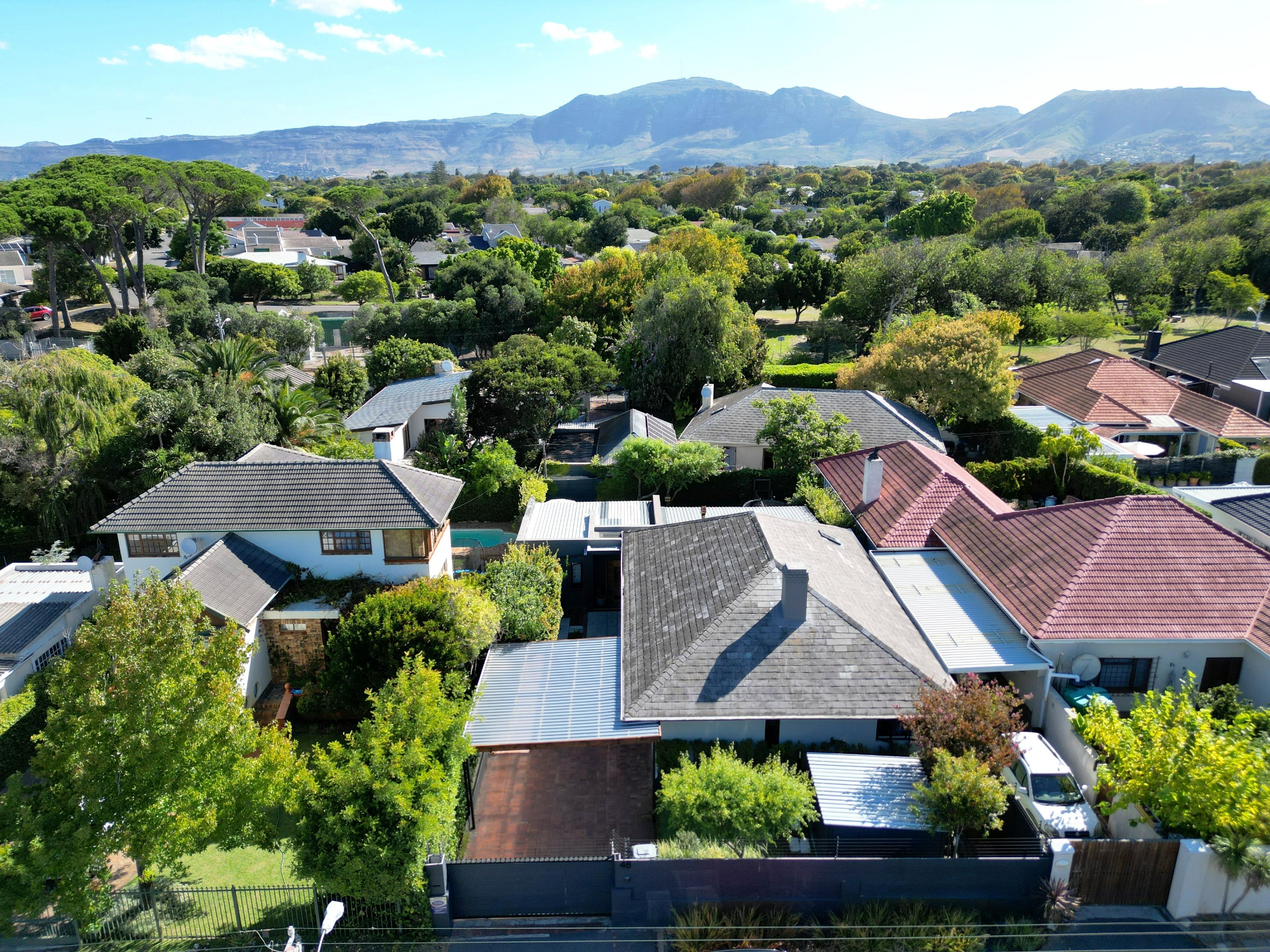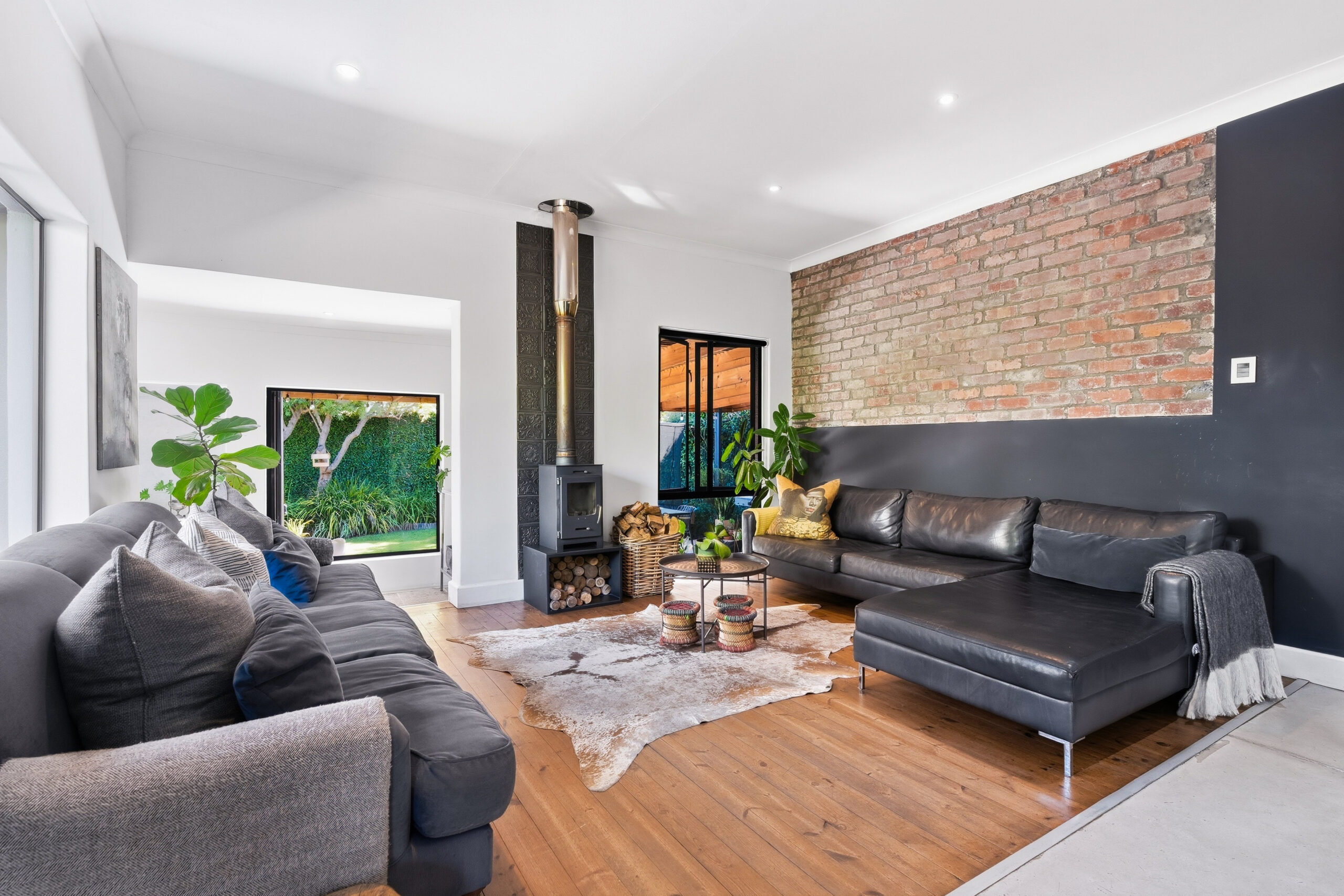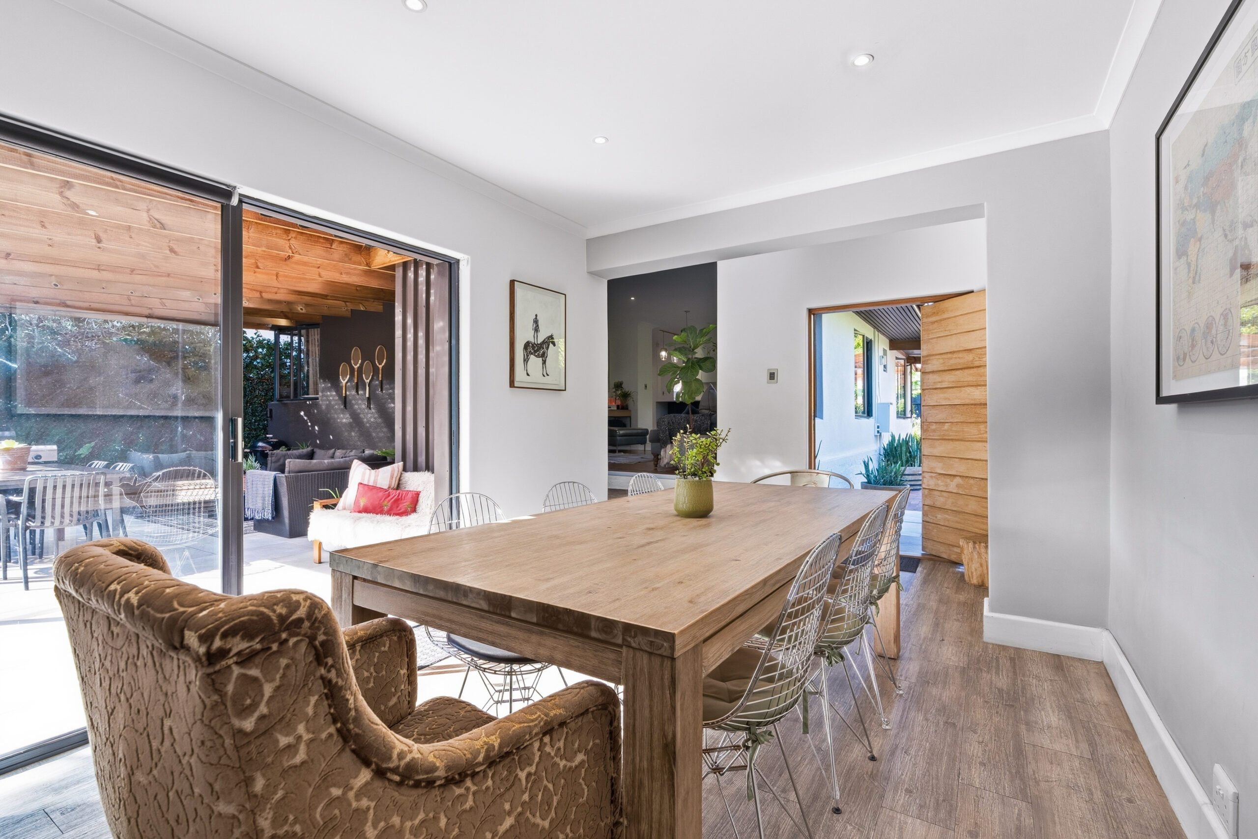 This absolutely stunning, single storey, spacious home on 496 sqm showcases designer details from front to back. Extremely private and discreet from the road, the home unfolds as you explore it. A large driveway affords sheltered parking for two large cars with secure parking for another two. A grand front door welcomes guests who can either turn left into the large studio/4th bedroom, head straight into the dining area (with feature wall) which leads to the manicured back garden, or turn right to a landing that leads you into the open plan family room and exquisite, modern kitchen. We believe that the house was built in 1948, which aligns with the high ceilings and Oregon wooden floors. An iron-cast, wood-burning fireplace adds to the charm of the room…just imagine sitting in front of this toastie luxury when Cape Town’s winter arrives. The kitchen has a grand central island with bar stool seating on both sides, space for a wine cooler, and prep bowl. Suspended pendants above the island create soft mood lighting for evening dinners with friends. A separate scullery houses space for 3 washing appliances, an additional fridge/freezer, sink, and the 5kW back up inverter.
