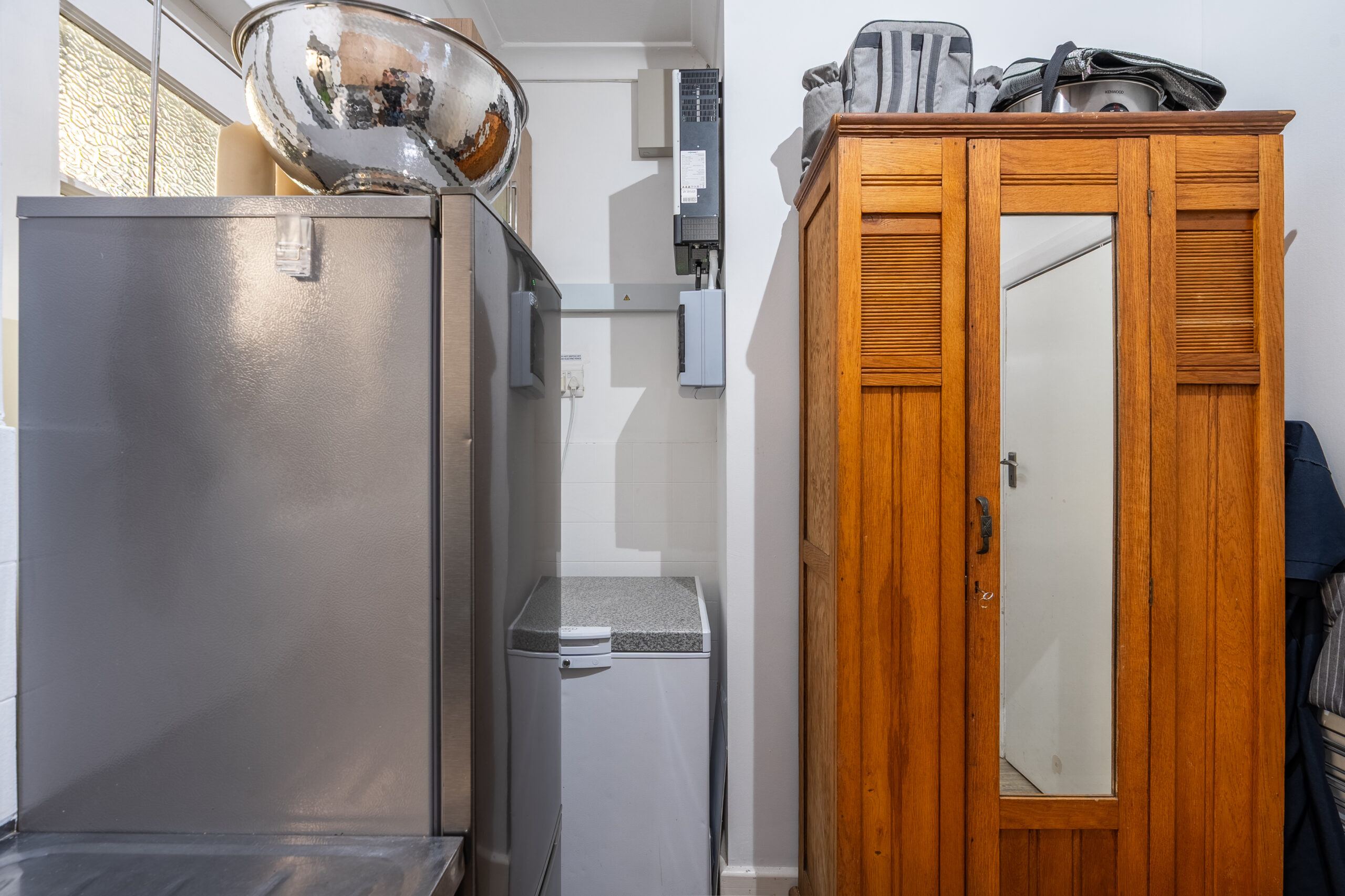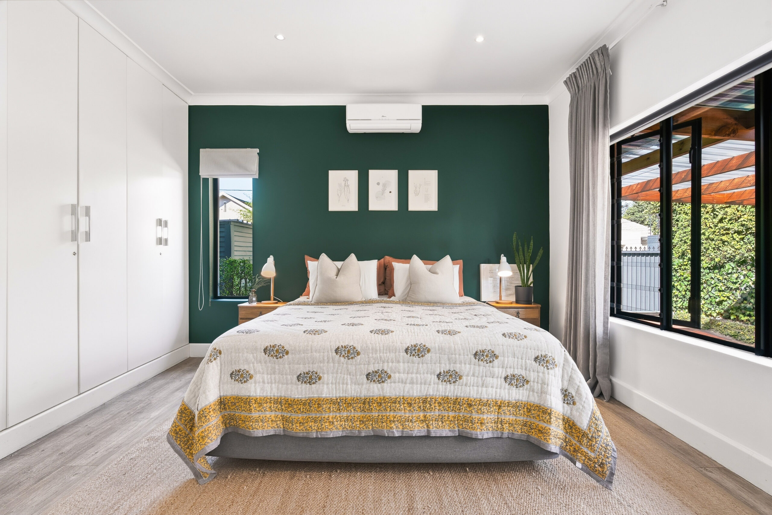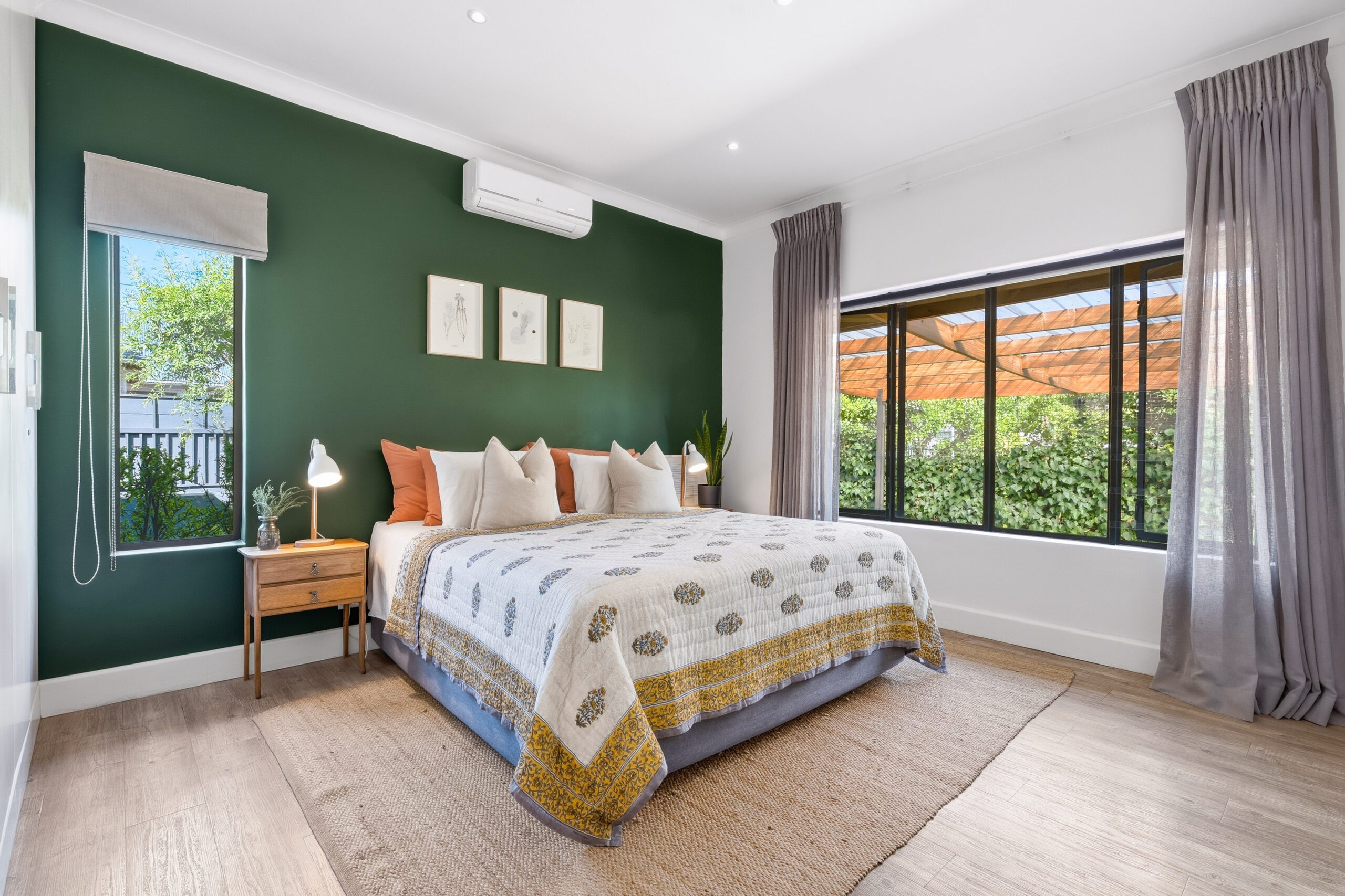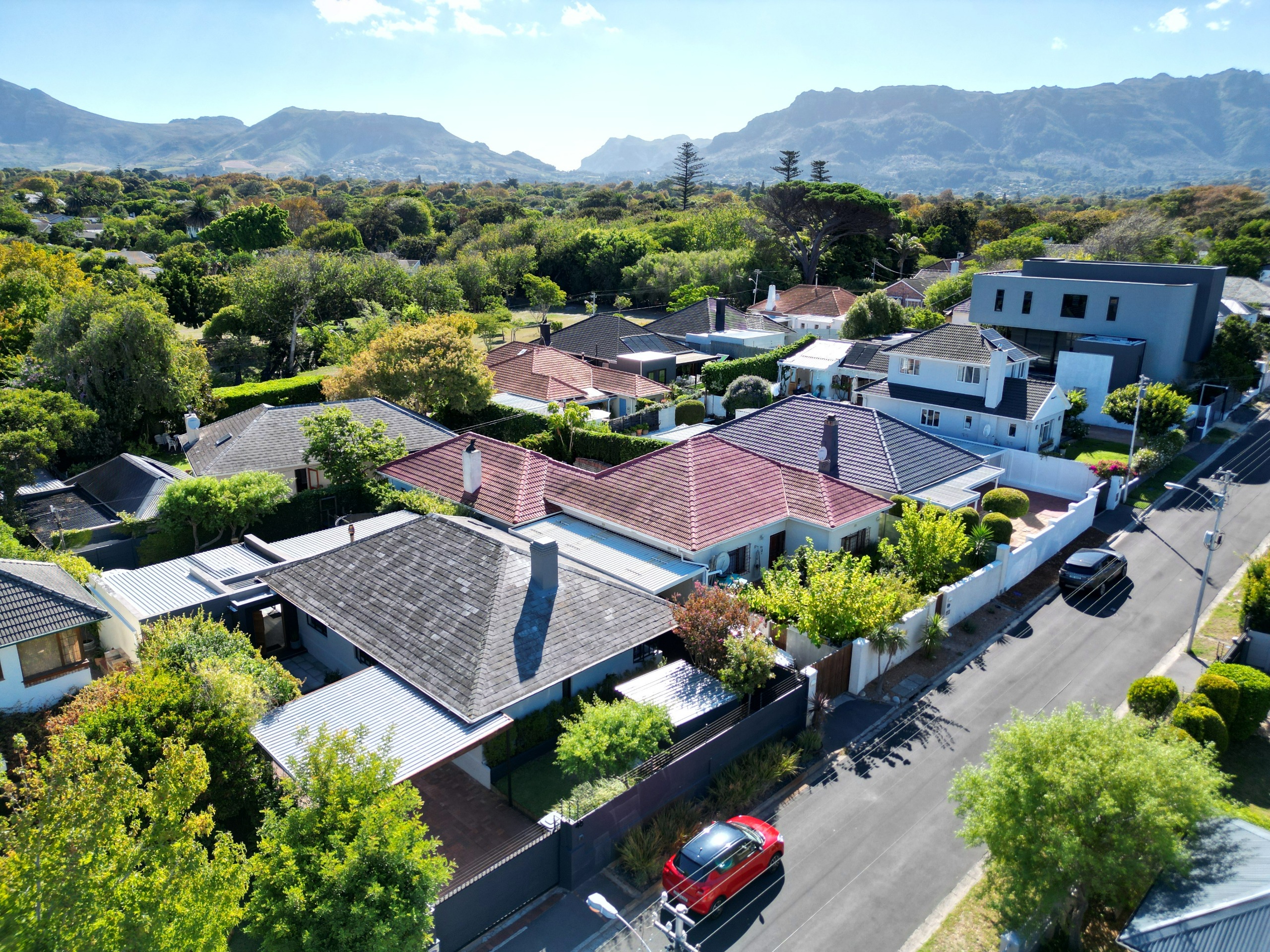 This absolutely stunning, single storey, spacious home on 496 sqm showcases designer details from front to back. Extremely private and discreet from the road, the home unfolds as you explore it. A large driveway affords sheltered parking for two large cars with secure parking for another two. A grand front door welcomes guests who can either turn left into the large studio/4th bedroom, head straight into the dining area (with feature wall) which leads to the manicured back garden, or turn right to a landing that leads you into the open plan family room and exquisite, modern kitchen. We believe that the house was built in 1948, which aligns with the high ceilings and Oregon wooden floors. An iron-cast, wood-burning fireplace adds to the charm of the room…just imagine sitting in front of this toastie luxury when Cape Town’s winter arrives. The kitchen has a grand central island with bar stool seating on both sides, space for a wine cooler, and prep bowl. Suspended pendants above the island create soft mood lighting for evening dinners with friends. A separate scullery houses space for 3 washing appliances, an additional fridge/freezer, sink, and the 5kW back up inverter.