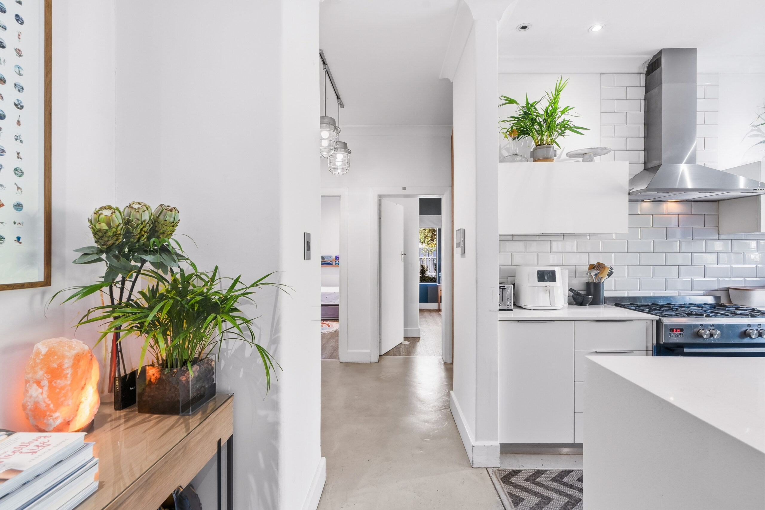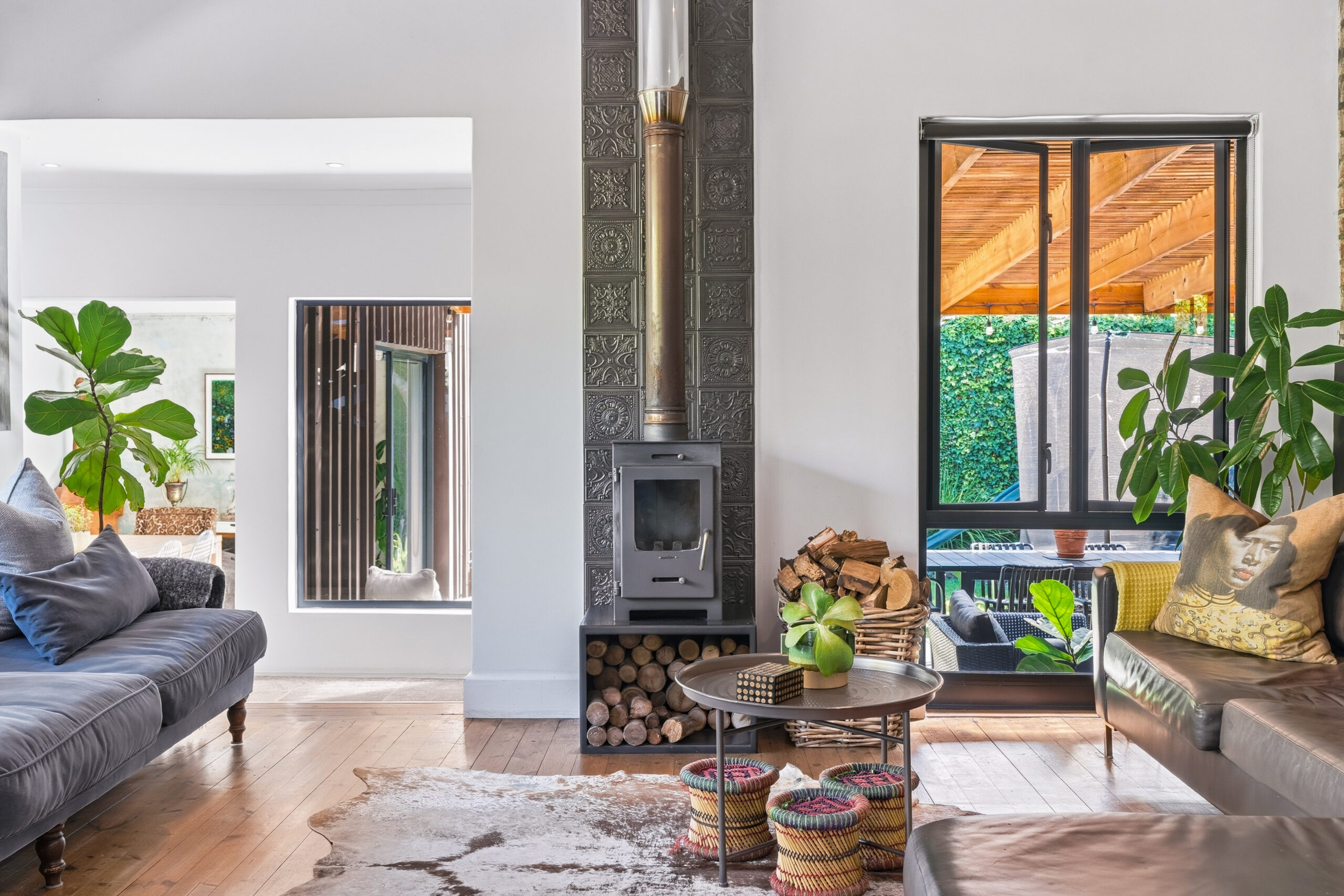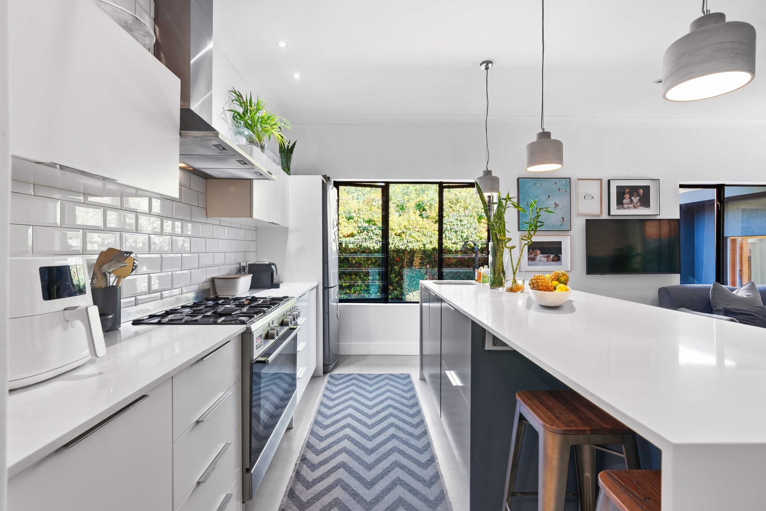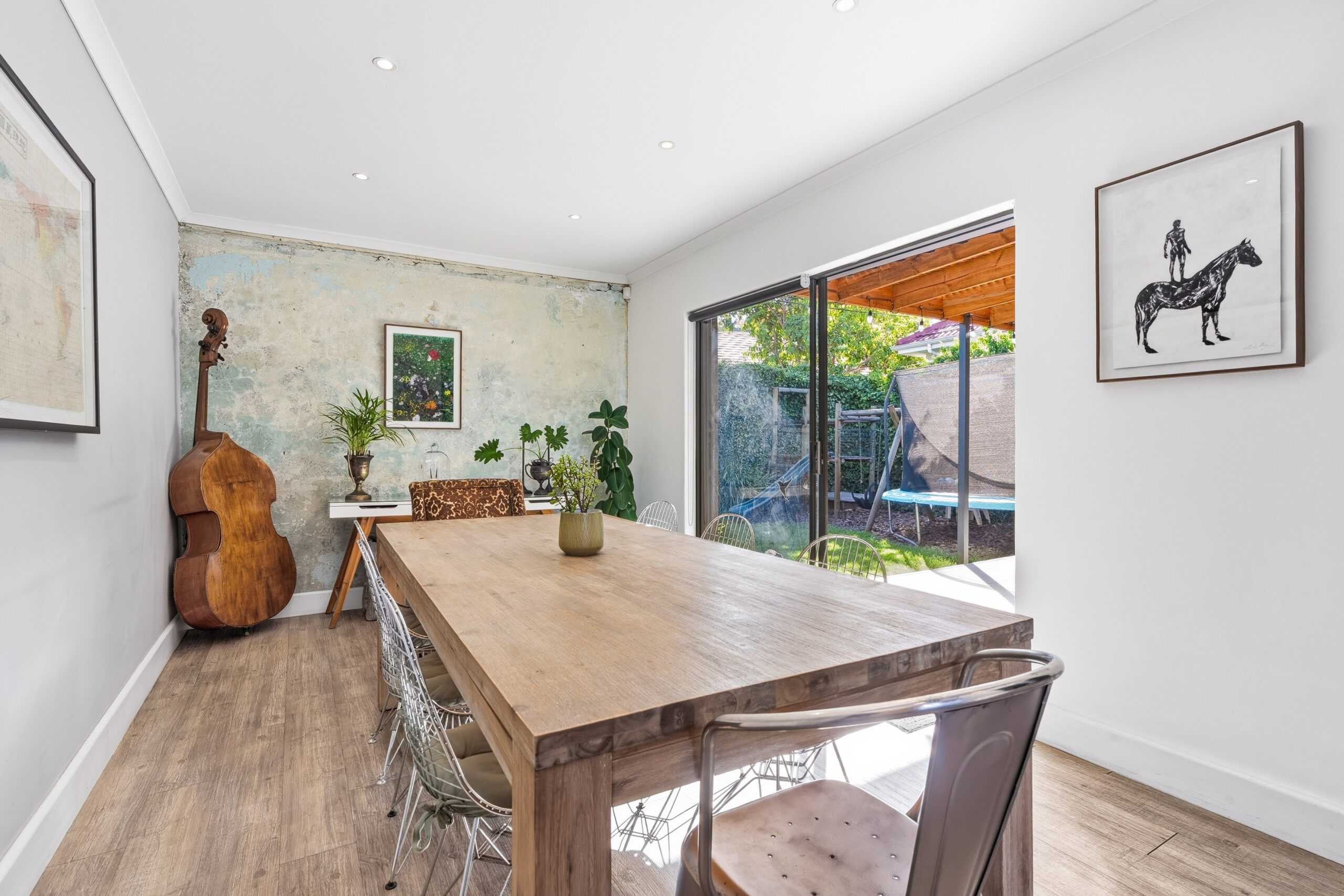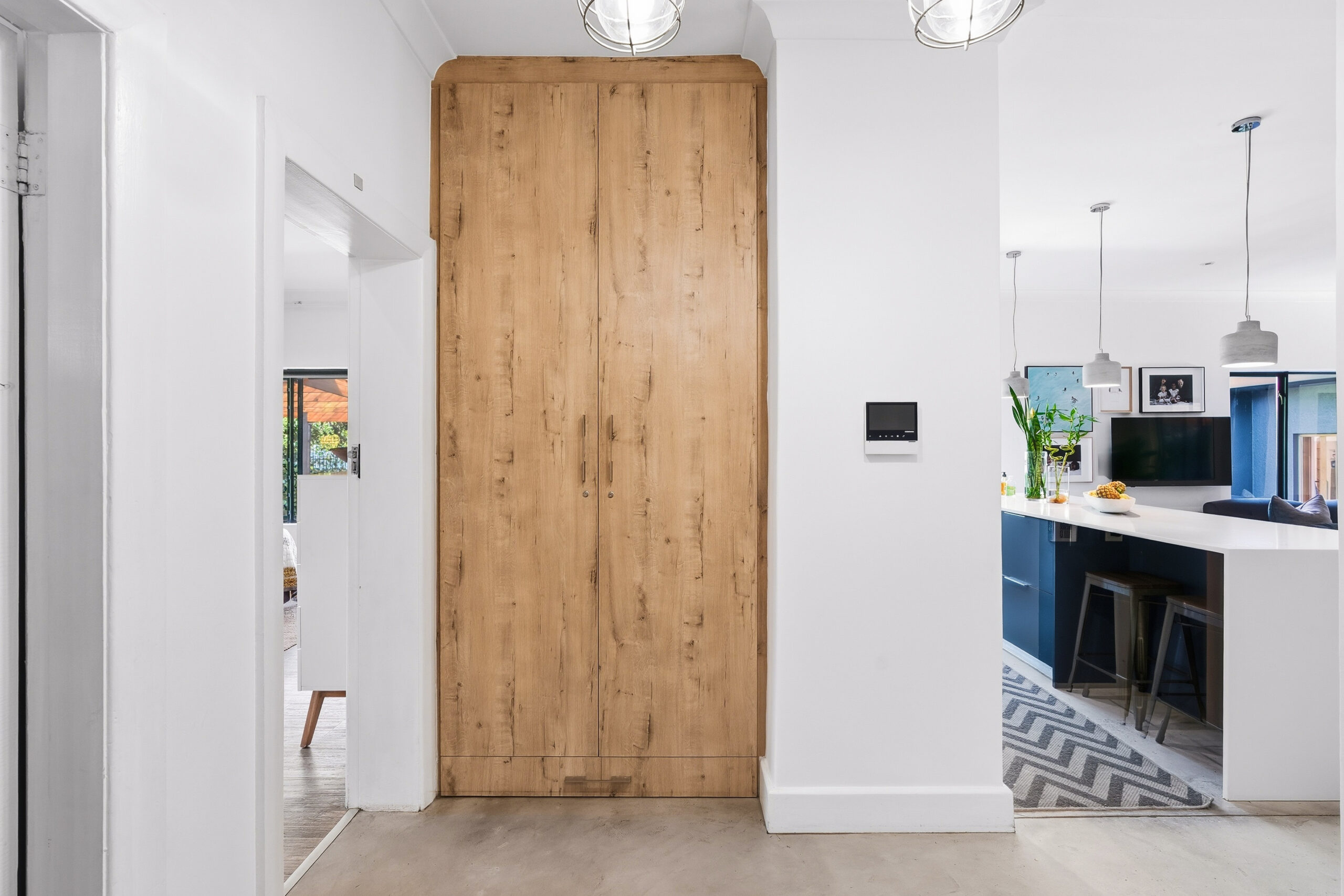 This absolutely stunning, single storey, spacious home on 496 sqm showcases designer details from front to back. Extremely private and discreet from the road, the home unfolds as you explore it. A large driveway affords sheltered parking for two large cars with secure parking for another two. A grand front door welcomes guests who can either turn left into the large studio/4th bedroom, head straight into the dining area (with feature wall) which leads to the manicured back garden, or turn right to a landing that leads you into the open plan family room and exquisite, modern kitchen. We believe that the house was built in 1948, which aligns with the high ceilings and Oregon wooden floors. An iron-cast, wood-burning fireplace adds to the charm of the room…just imagine sitting in front of this toastie luxury when Cape Town’s winter arrives. The kitchen has a grand central island with bar stool seating on both sides, space for a wine cooler, and prep bowl. Suspended pendants above the island create soft mood lighting for evening dinners with friends. A separate scullery houses space for 3 washing appliances, an additional fridge/freezer, sink, and the 5kW back up inverter.